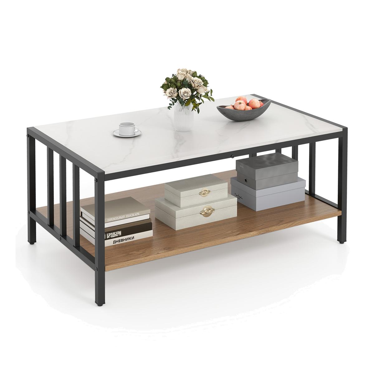The 2-tier coffee table boasts a spacious tabletop and an open shelf for storage. Its enduring sintered stone top features faux marble patterns, adding a touch of elegance. Supported by a stable metal frame with adjustable foot pads, this centre table ensures reliability even on uneven floors. The 10cm bottom clearance allows for easy cleaning underneath, while the smooth surface simplifies spill cleanup. Versatile in its application, this cocktail table is a perfect fit for living rooms, studies, reception areas, and more.