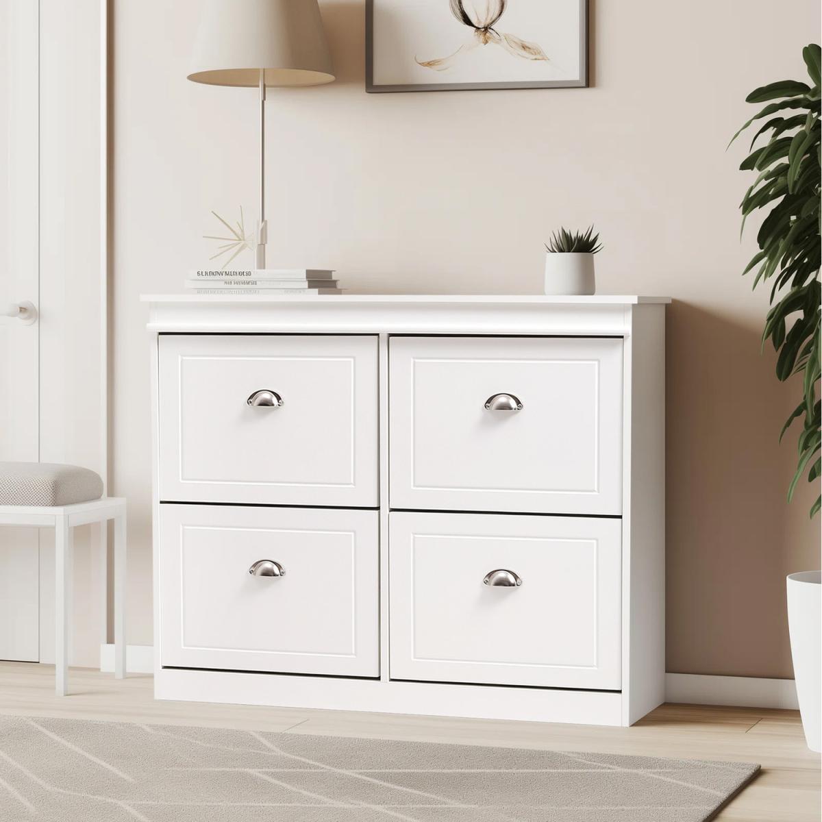 This elegant white flip-down shoe cabinet, featuring silver handles, enhances any entryway with its sleek design. It includes two built-in racks for ample shoe storage, ensuring your entrance stays clean and organized. Keep your shoes neatly out of sight with this modern solution.