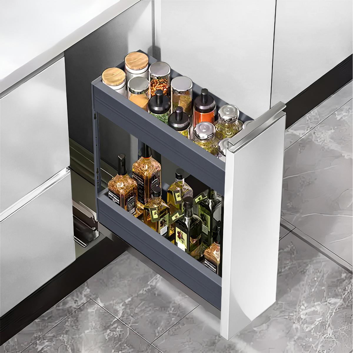 I love this pull-out shelf for its practical design and modern finish, making it perfect for efficient kitchen storage. Its grey aluminium frame offers a sleek, contemporary look that works well in minimalist or industrial-inspired interiors. It's especially useful in smaller kitchens where space optimisation is key, as it allows easy access to bottles and jars at the back of cabinets. For styling tips, consider keeping the bottles organised by colour or type to create a clean visual impact. Pairing it with white, grey, or stainless steel cabinetry enhances its contemporary appeal, while a glass-fronted or matte finish can add a subtle contrast. This is a smart choice for anyone looking to maximise storage without sacrificing style.