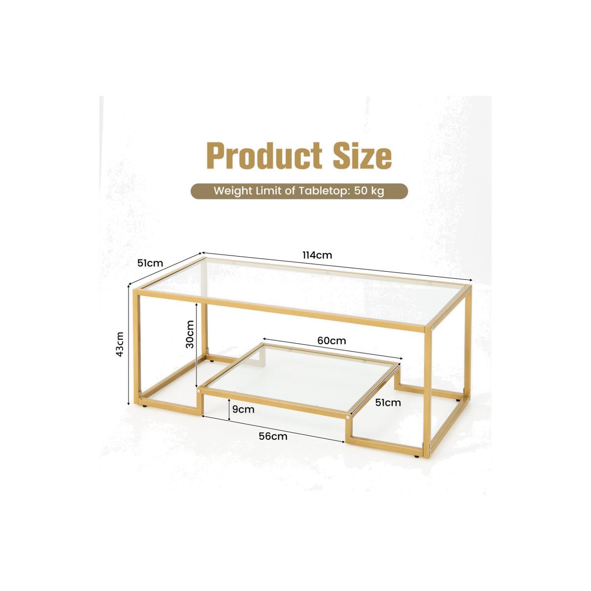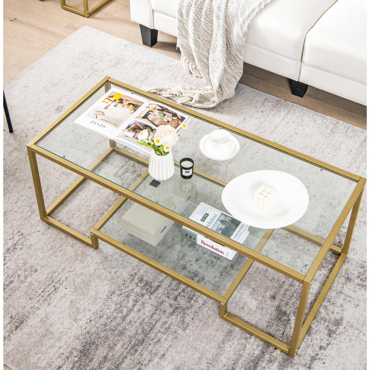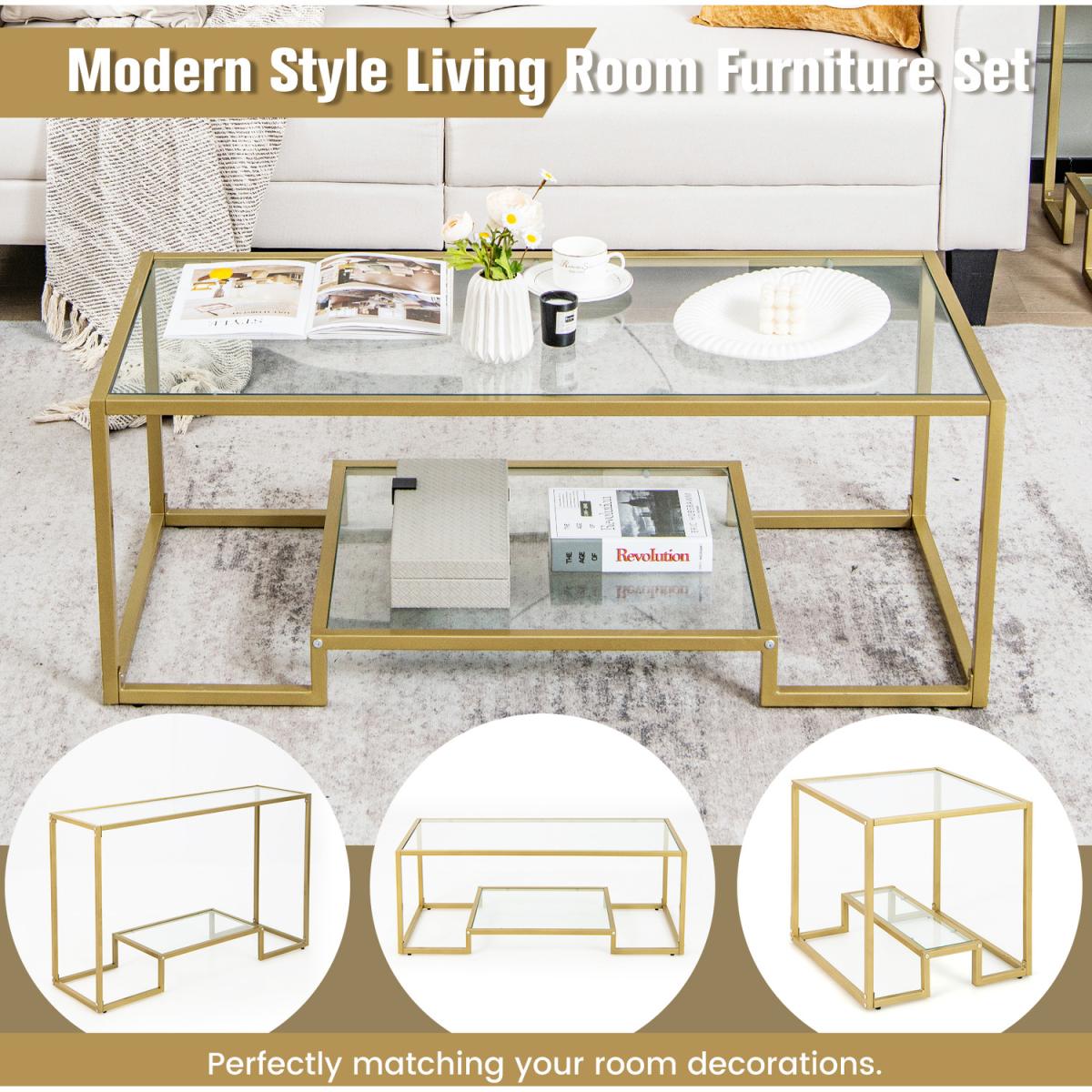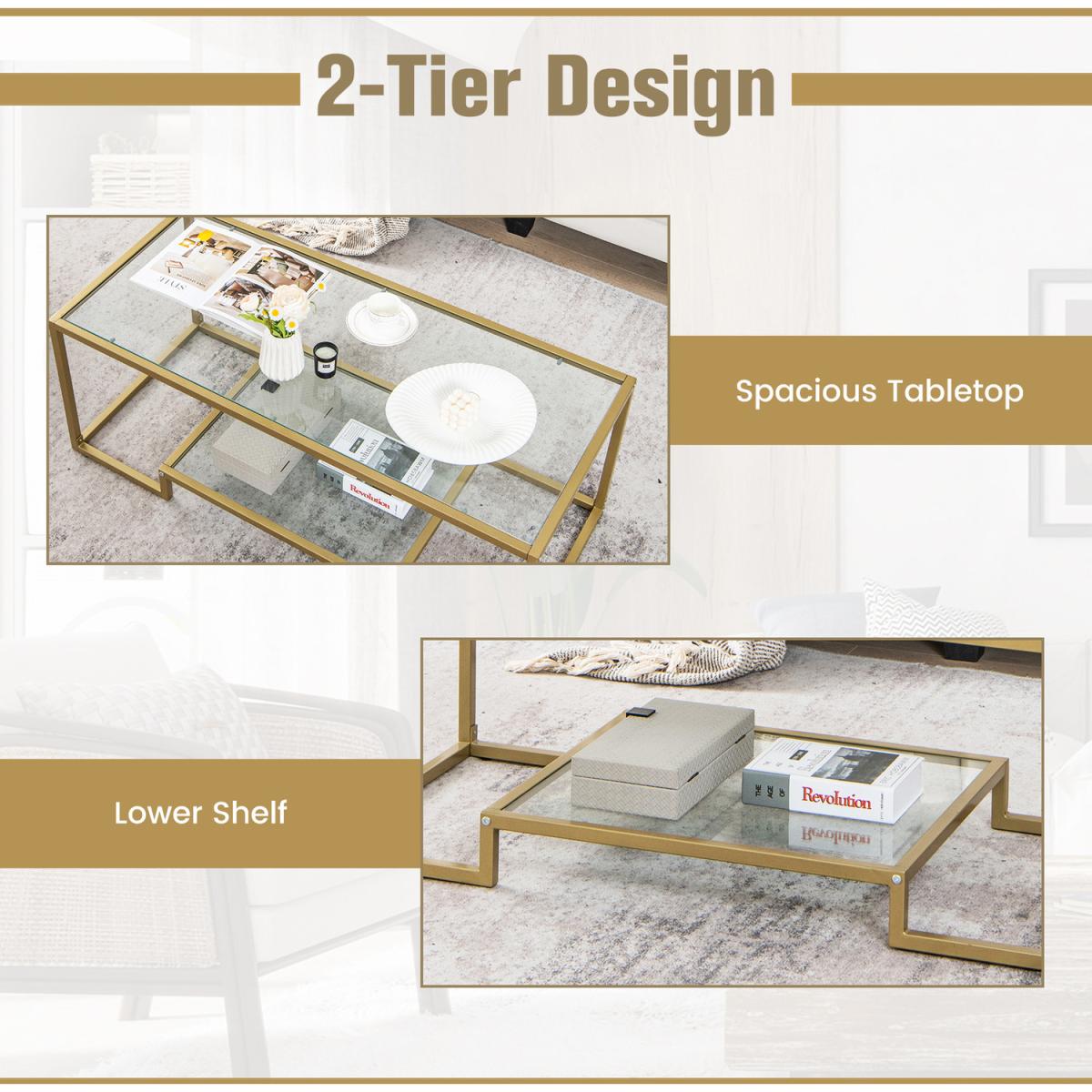 The golden coffee table is one of our modern style living room furniture set (the other 2 pieces are sold separately), which complements to your living space and make it a stylish and welcoming place! Equipped with glossy tempered glass shelves and heavy duty metal frame, the 2-tier accent table looks rather attractive and features superior stability. Besides, the cocktail table offers ample storage space for living room decorations and essentials, keeping the room tidy and clean. What's more, the adjustable foot pads attached to the base are helpful to level the coffee table in against wobbling. In all, if you are looking for a stylish and functional center table for living room, this 2-tier coffee table will be a good choice!