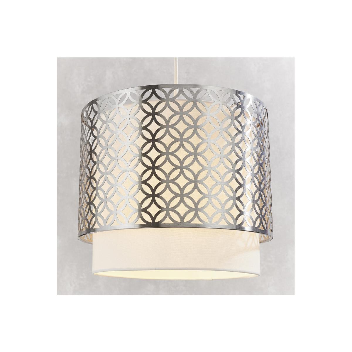 A beautiful layered 2-tier pendant. The inner vintage white linen shade is framed by a decorative metal satin nickel shade, both combine to create a soft diffused light effect
