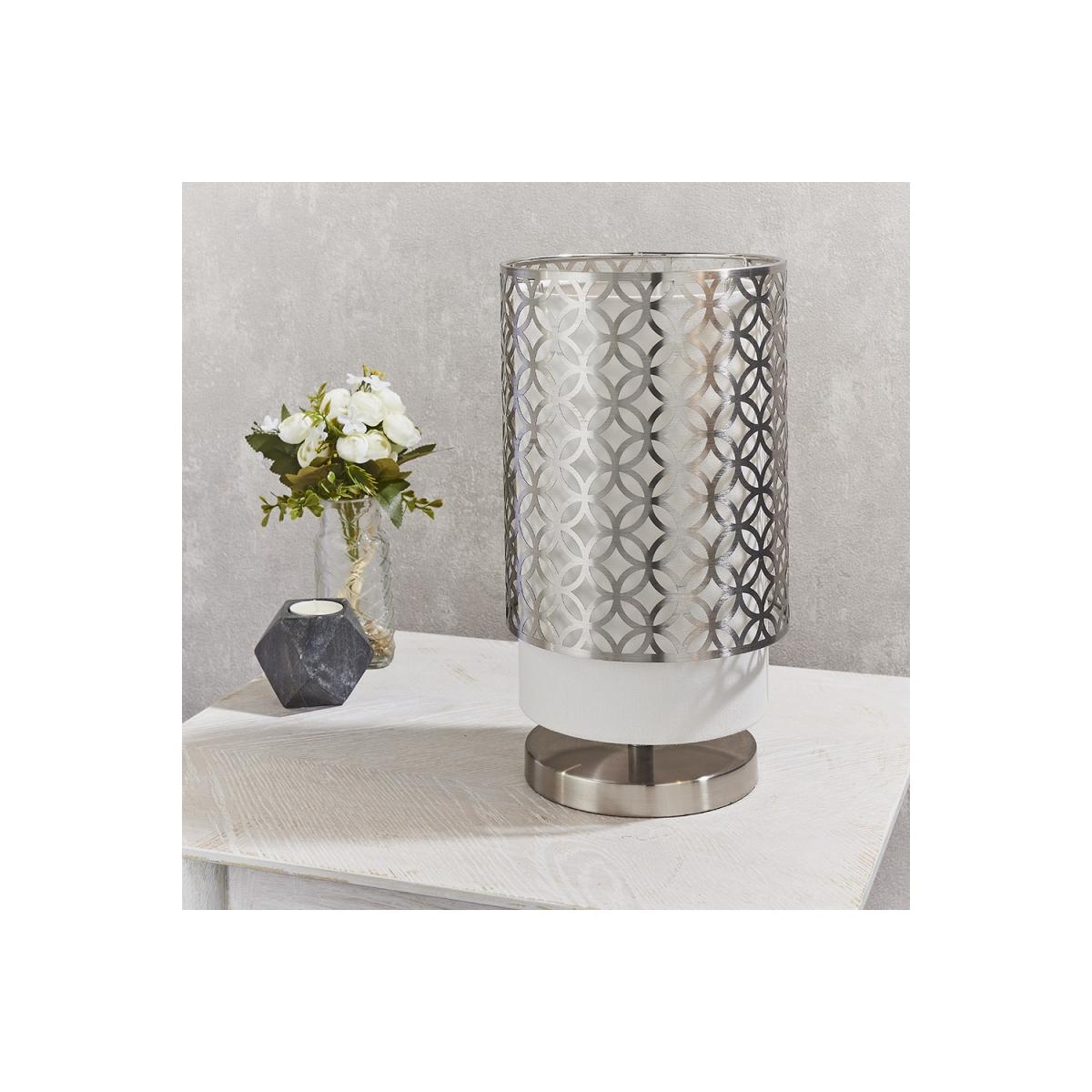 I love this little table lamp for its clean, contemporary look with a subtle nod to retro style thanks to its geometric pattern. It works particularly well in modern, minimalist interiors or as a chic accent piece in transitional spaces. The nickel finish adds a touch of sophistication and pairs well with neutral tones, while the white shade keeps it versatile and easy to incorporate. For styling tips, place it on a side table in a living room for ambient lighting or on a bedside table for a stylish and functional touch. To keep the look cohesive, pair it with other metallic accents or textured textiles for a balanced, polished finish.