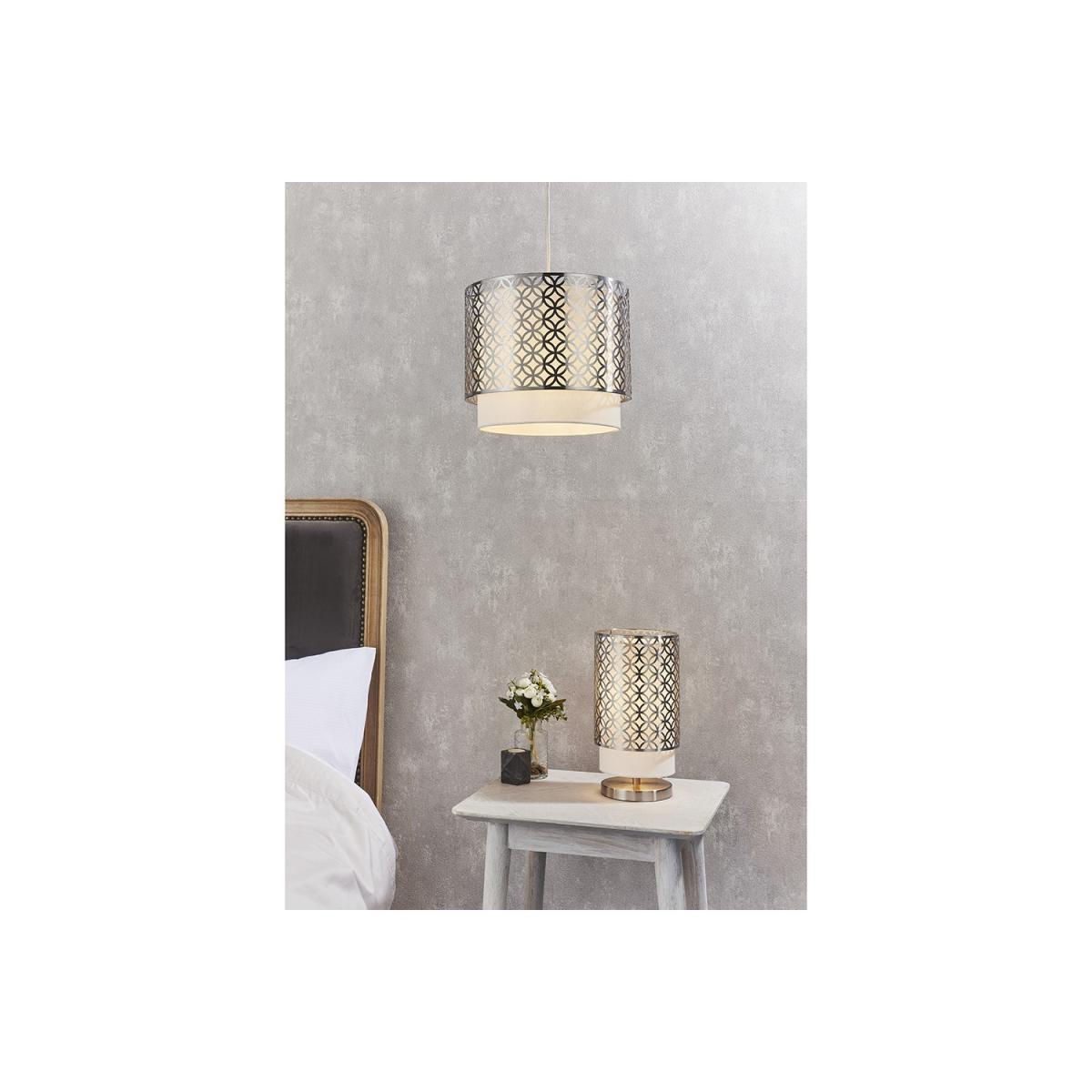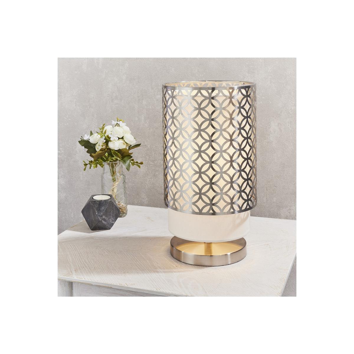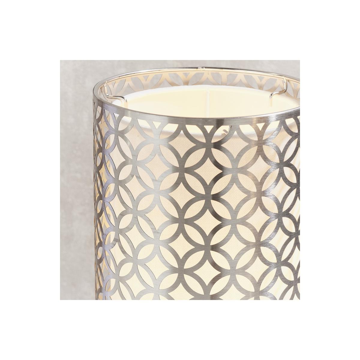 A beautiful layered 2-tier table lamp. The inner vintage white linen shade is framed by a decorative metal satin nickel shade, both combine to create a soft diffused light effect