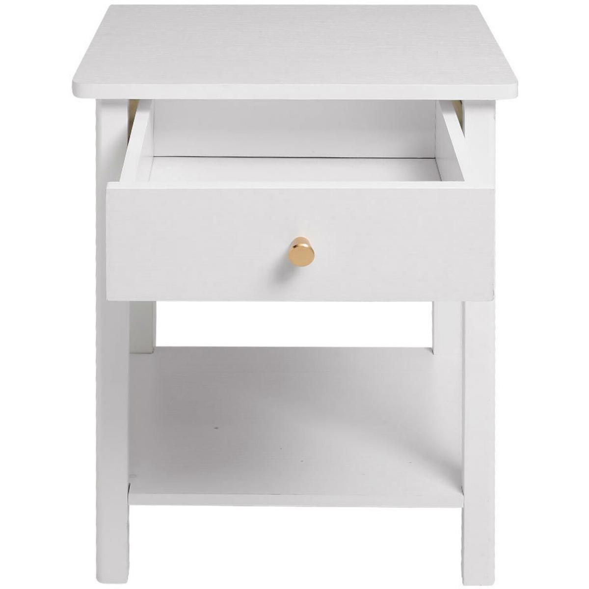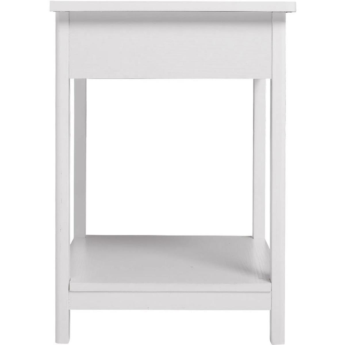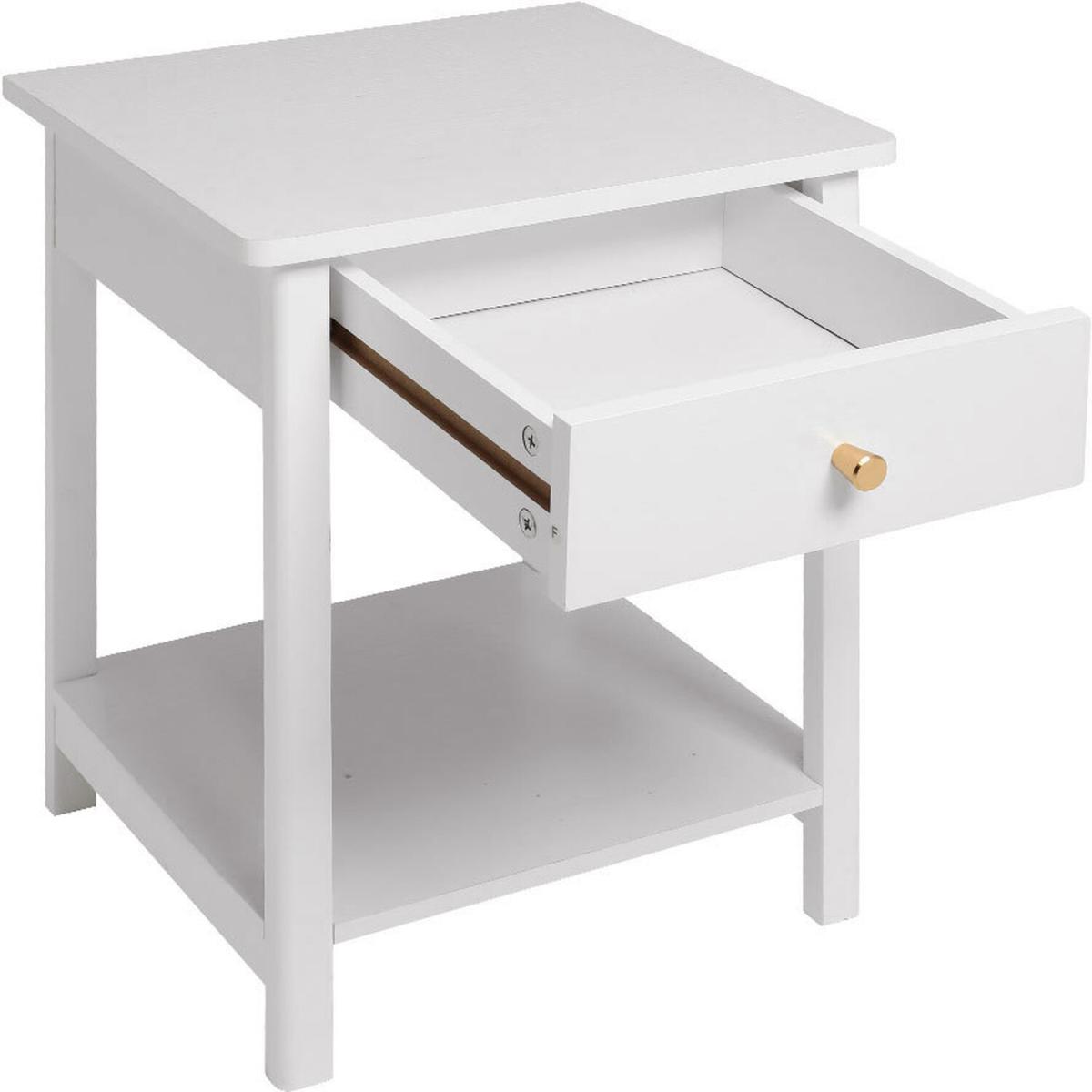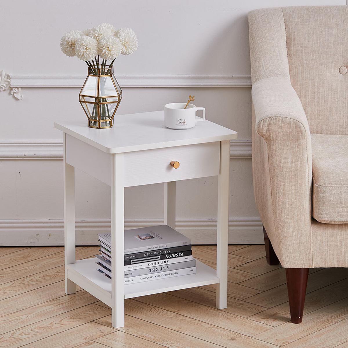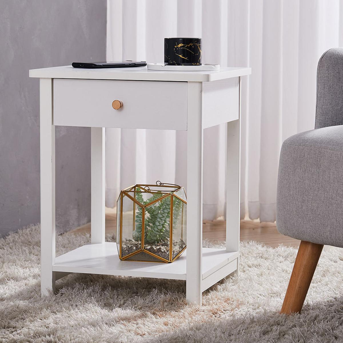 The industrial look of the white iron frame is complemented by the rustic top of the side tables, creating an exciting mix of styles. This charming side table is a decorative accent to your home while being practical for use in all rooms. The compact drawer design makes this end table more practical and aesthetically pleasing, with an open bottom design that provides more storage space.
