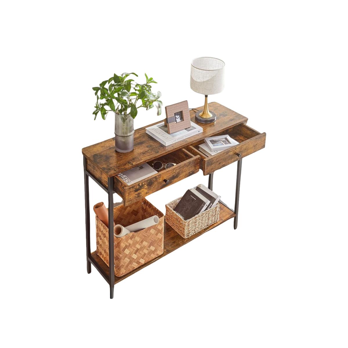 Embrace the timeless appeal of industrial design with our vintage brown console table, combining metal accents with a simple wood grain surface for a loft-inspired look reminiscent of New York City. Tired of cluttered entryways Our console table features two spacious drawers, providing ample storage for keys, wallets, and mail, helping you maintain a tidy and organized space. Crafted from solid wood chipboard and steel, this side table offers exceptional durability and stability. Adjustable feet ensure steady support, even on uneven surfaces, eliminating any wobbling. This hallway table strikes the perfect balance between functionality and space-saving design, making it ideal for various room sizes. With detailed assembly instructions, clearly marked parts, and an accessory pack included, assembly is a breeze. The simple structure allows you to set up this hallway table in no time at all, so you can start enjoying its industrial charm right away.