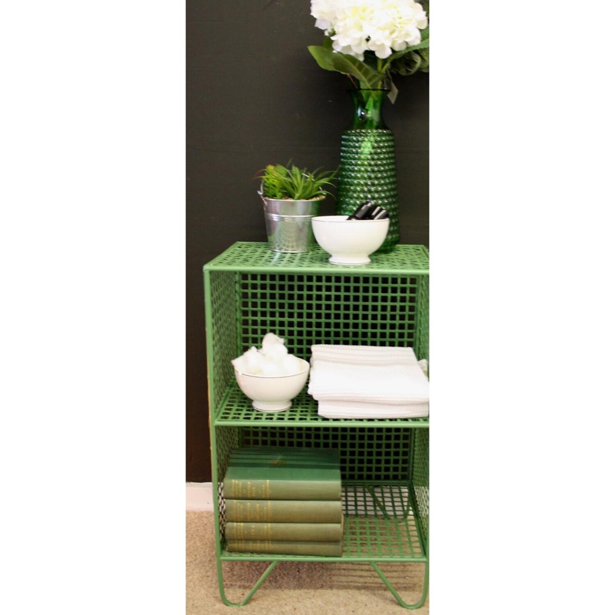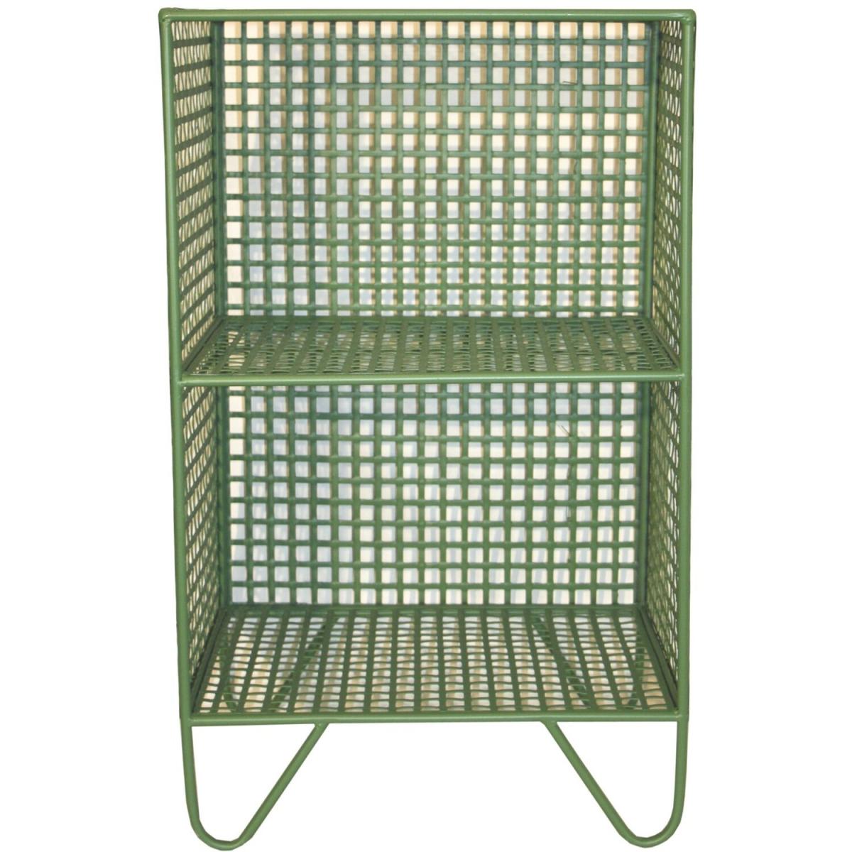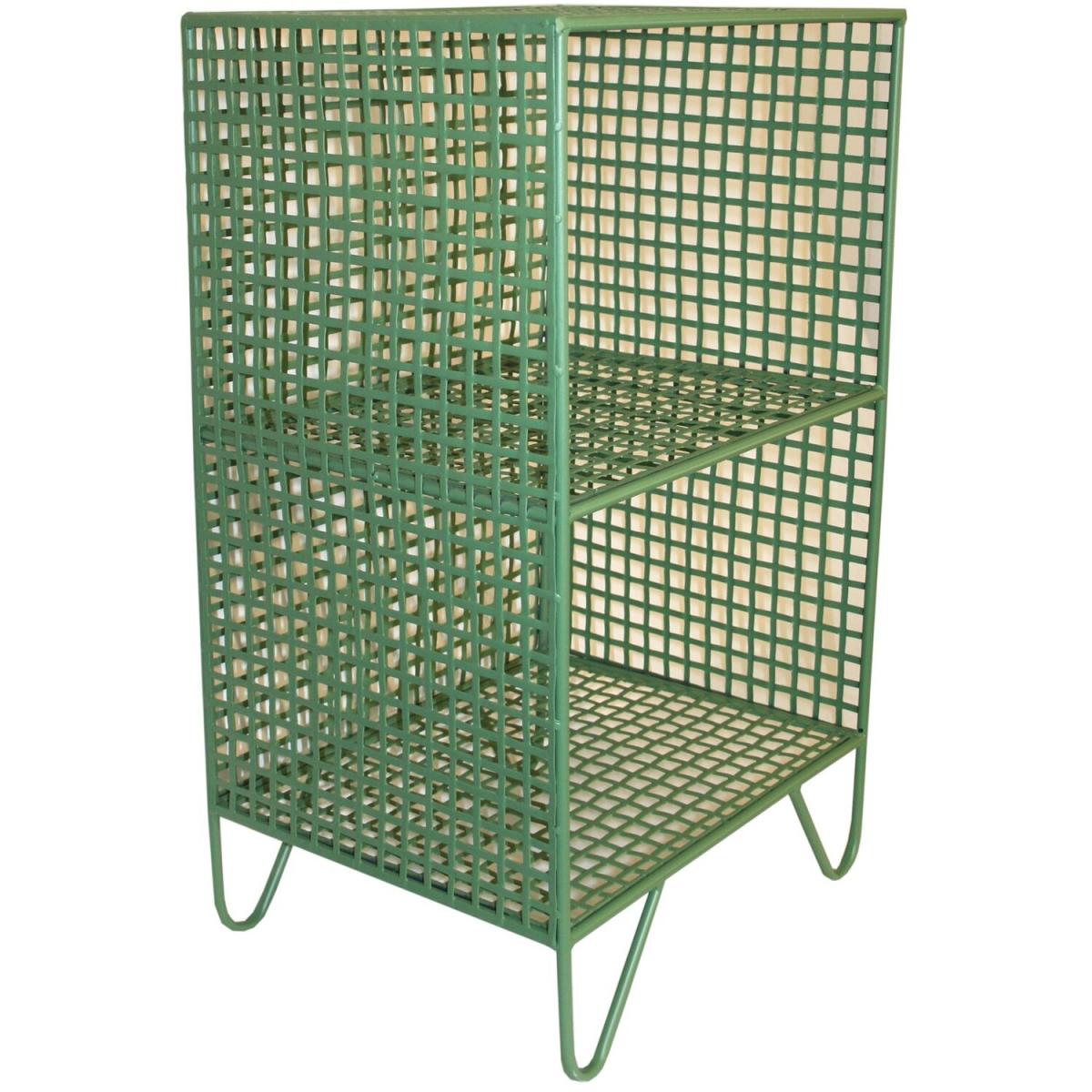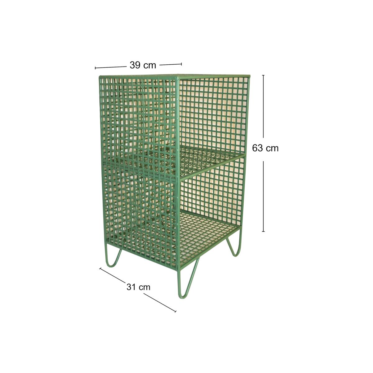 A stylish green painted metal free-standing table with two tiers for storage. This lovely table has a sturdy square metal lattice design with a flat back creating the perfect accent table for your home making it great for using as a side table with space for a table lamp and display items with two handy open-fronted tiers for storing newspapers, magazines, books or throws. This versatile table would be great for use as an industrial looking storage unit in any room in the house. With curved triangular metal legs, it combines modern practicality with a timeless traditional look which will suit any decorating style!