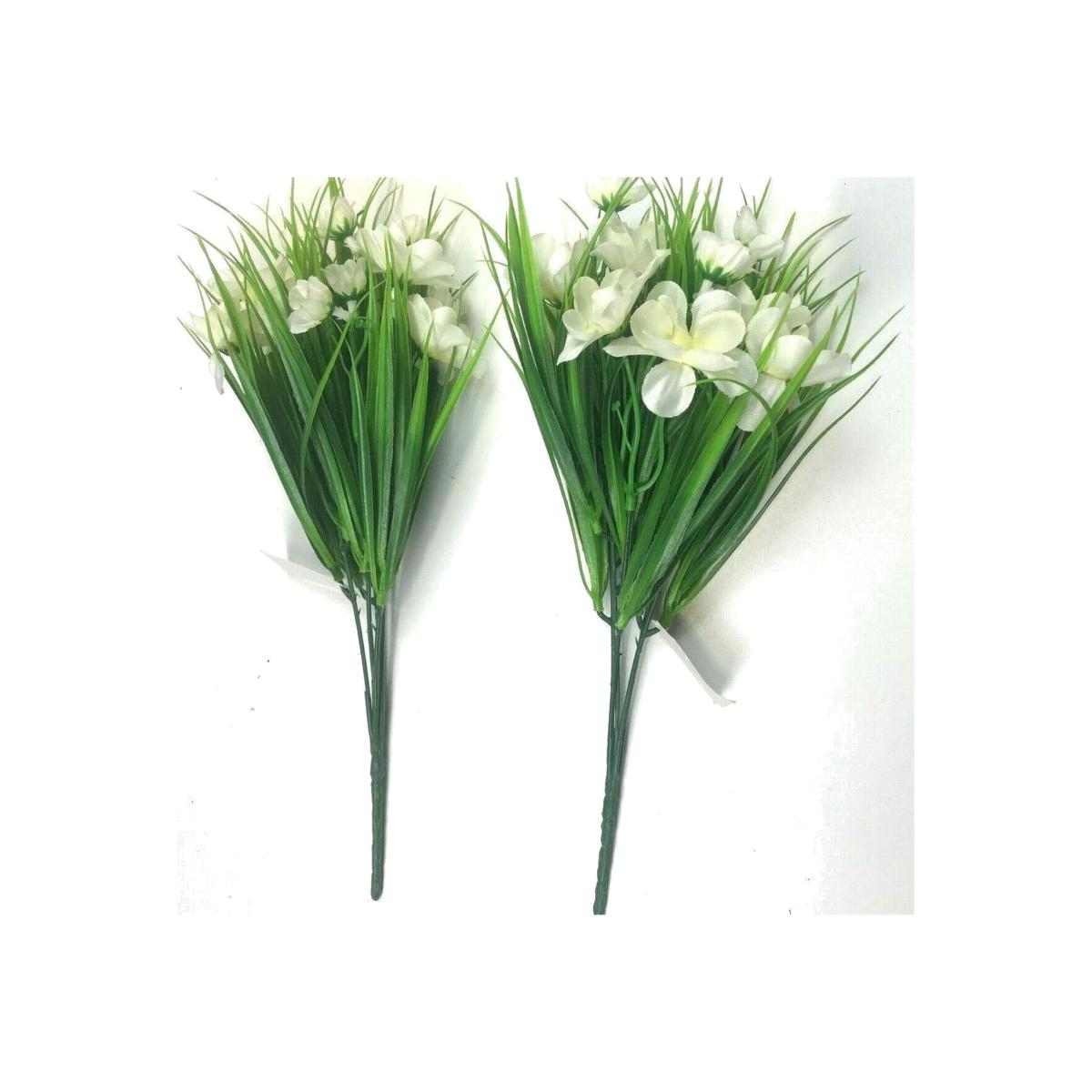 2 x Artificial Faux Grass Plant Bushes With White Flowers - White