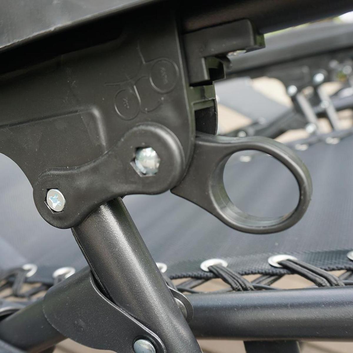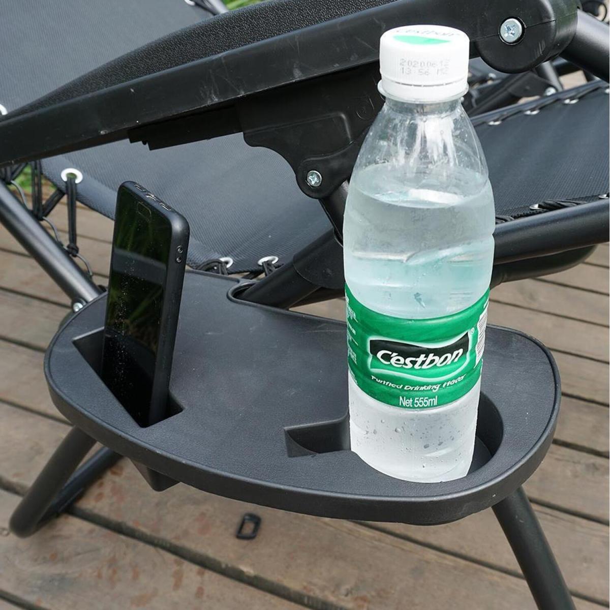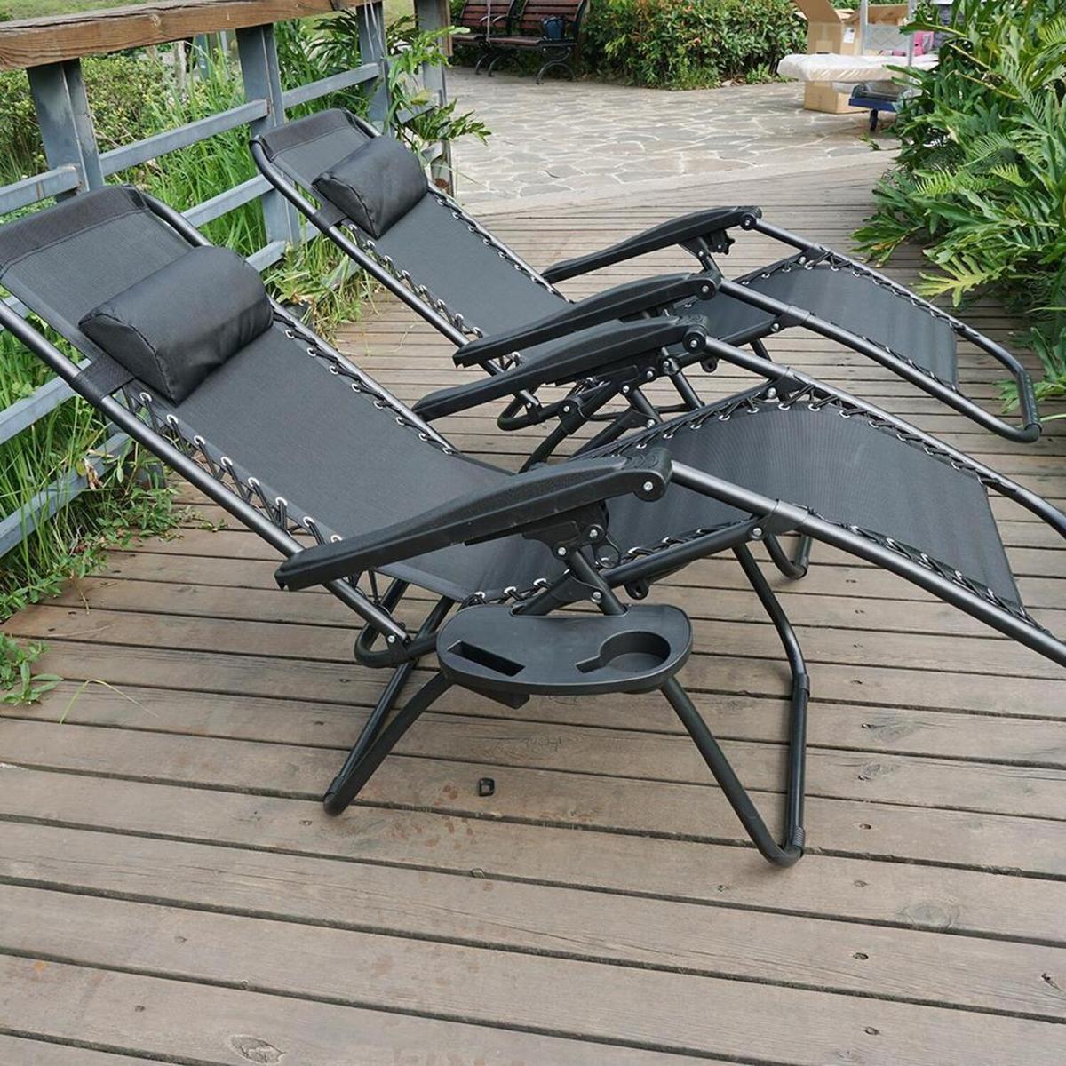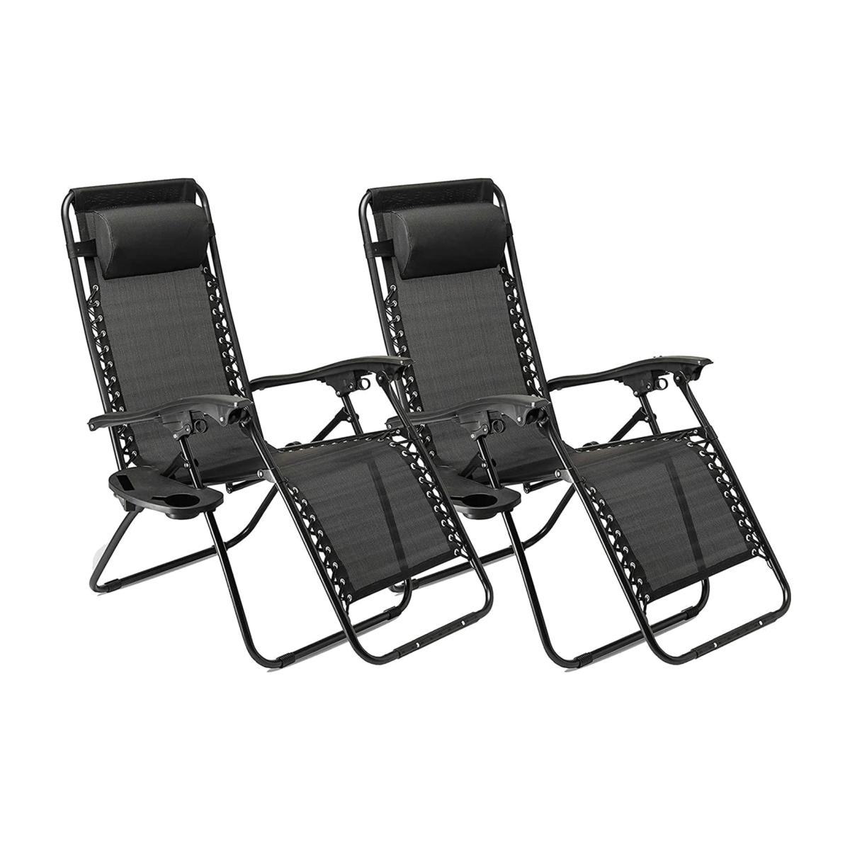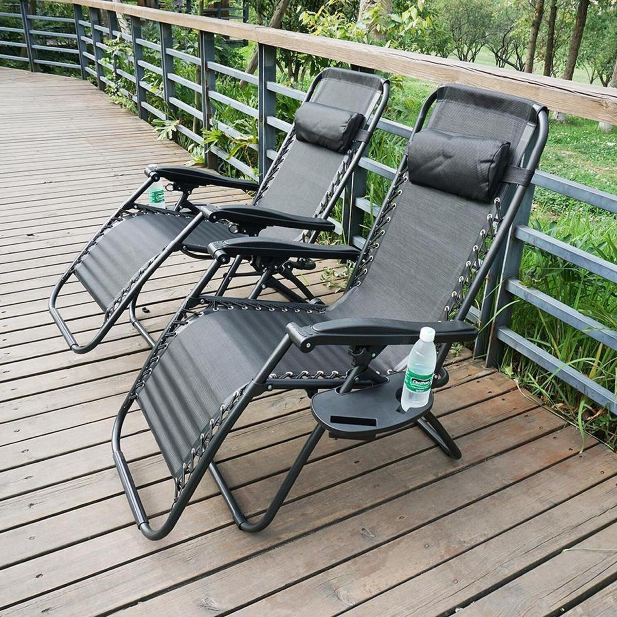 Gr8 Garden 2 x Textoline Zero Gravity Reclining Garden Chair Beach Sun Lounger Recliner Chairs Set in Black Weatherproof With Side Table Drinks Cup and Phone Holder. This is the new design and high quality outdoor camping beach folding sun lounger bed garden recliner chair. It features a high back and headrest cushion to give you added support and comfort while relaxing in the chair. It can be used both indoors and outdoors and has a great looking modern design that will help improve the look of your garden. This product is perfect for use in the summer months, in your garden or by the pool side and beach. This product is foldable for easy storage and transport and can be both folded and unfolded in seconds. It is both durable and robust as well as resistant to rust and wear. The chair is lightweight which allows you to carry and move the chair around easily. It is also easy to clean and maintain the product. This product is the ideal way to relax in your garden during the warmer summer months. Now you can enjoy your relaxing time with comfort and in style.
