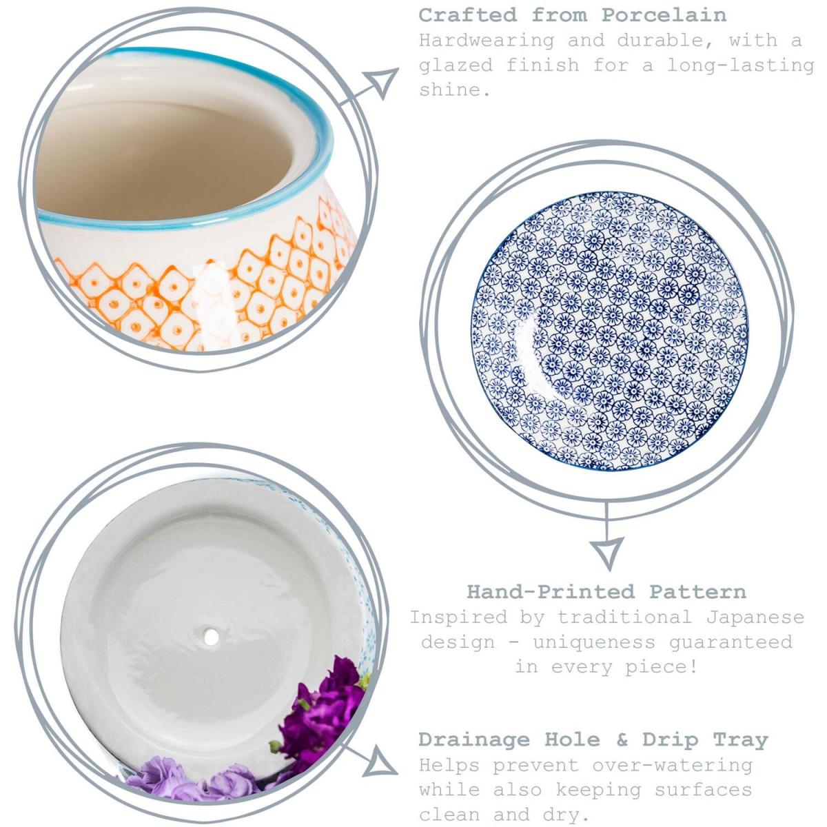 Show your favourite household garden plants and flowers off in style with these Hand-Printed Porcelain Flower and Plant Pots from Nicola Spring. With a diameter of 203mm and a height of 220mm, these pots are the perfect size for a wide array of plants and flowers. Their durable Porcelain construction means you can use them with confidence both inside and out, and their beautiful, vintage Japanese-style printed design makes them perfect for showing off a little bit of Summer, all year round! Each pot comes with a drainage hole in the bottom, and a drip tray to keep spills and mess to a minimum and ensure that both your plant and home are always pristine. Each individual piece has been carefully Hand-Printed with a vintage, Japanese-style pattern, giving every jar a truly unique finish. These jars co-ordinate with the many other beautiful crockery items in the Nicola Spring kitchen, dining, home and garden range - with a variety of patterns and combinations available, whether you're a fan of Scandi, Bohemian or Shabby Chic, you can be confident that the Nicola Spring crockery range will perfectly suit whatever your vision of home may be.