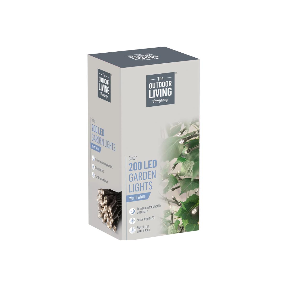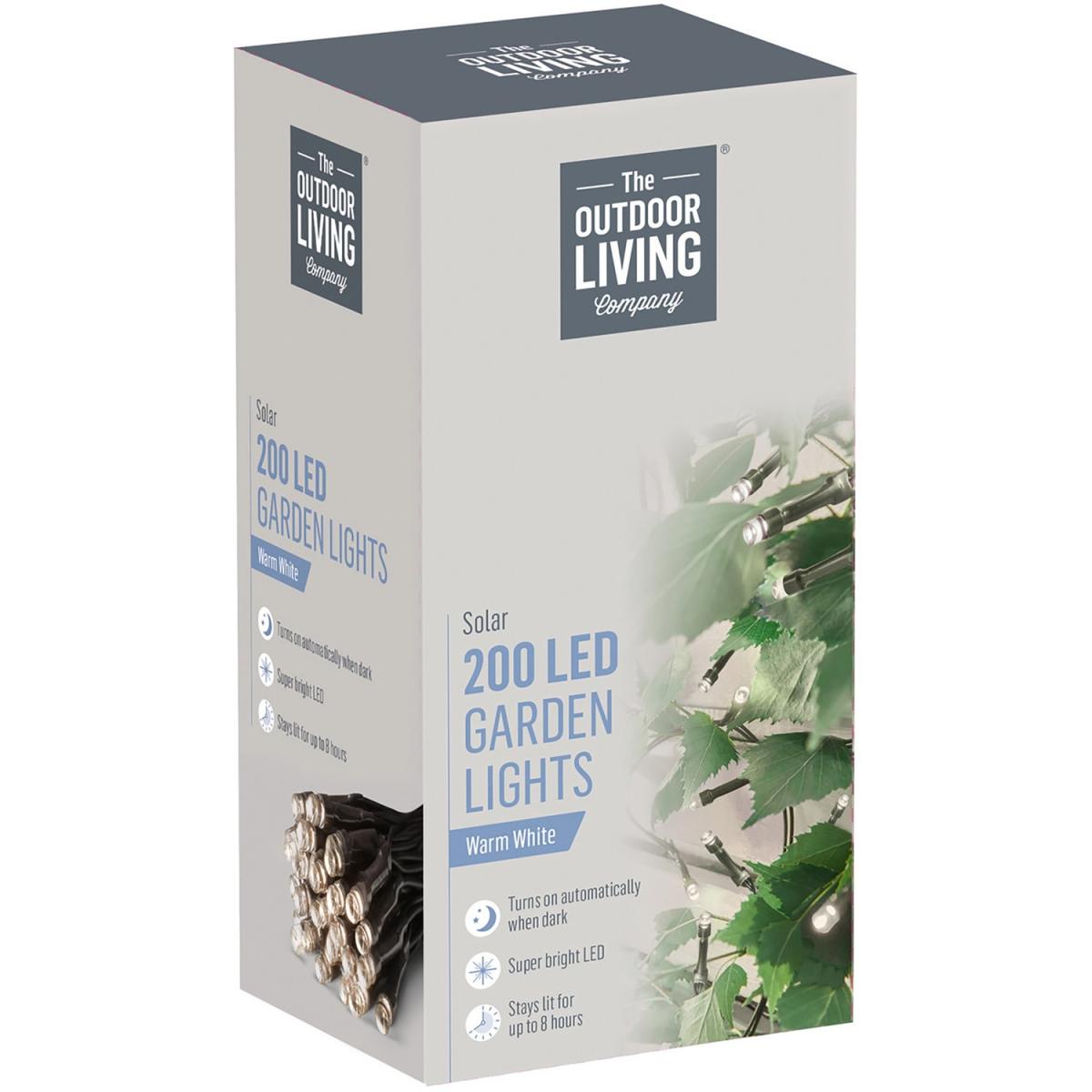 This set of 200 LED string lights are set out on a green cable which helps to blend them well into your garden and outdoor area. With their solar powered function and static setting, once charged will light up automatically for up 8 hours once dusk arrives. Giving off a bright warm white light to brighten up your garden. The lights have a generous 11.9m lit length range and a 1.8m lead cable from the solar charging panel, allowing you to place them in and around your garden or patio area. The solar charging panel requires 1 x AAA rechargeable battery which is included with the lights. These eco friendly LED lights are the perfect addition to lighting up your outdoor space and creating a welcoming atmosphere for all your friends and family to enjoy.
