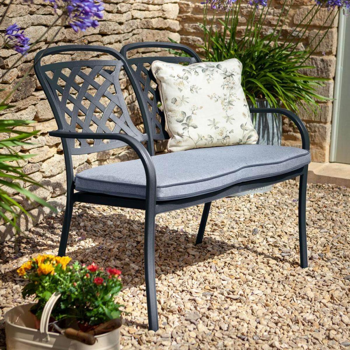 Consists of: 1 x Hartman Berkeley 2 Seat Bench - Antique Grey 1 x Hartman Berkeley Weatherready® Cushion - Platinum Part of the 2019 Hartman Berkeley outdoor furniture collection this 2 Seater Garden Bench is made from cast aluminium and comes in an attractive antique grey. The understated colour of the 2019 Hartman Berkeley 2 Seater Garden Bench allows it to blend in beautifully with any outdoor setting and the platinum Weatherready® Cushion only complements the overall aesthetic. These water-resistant cushions are perfect for use during the temperamental British Summertime as they do not retain moisture and the faux leather cover can be easily wiped clean.