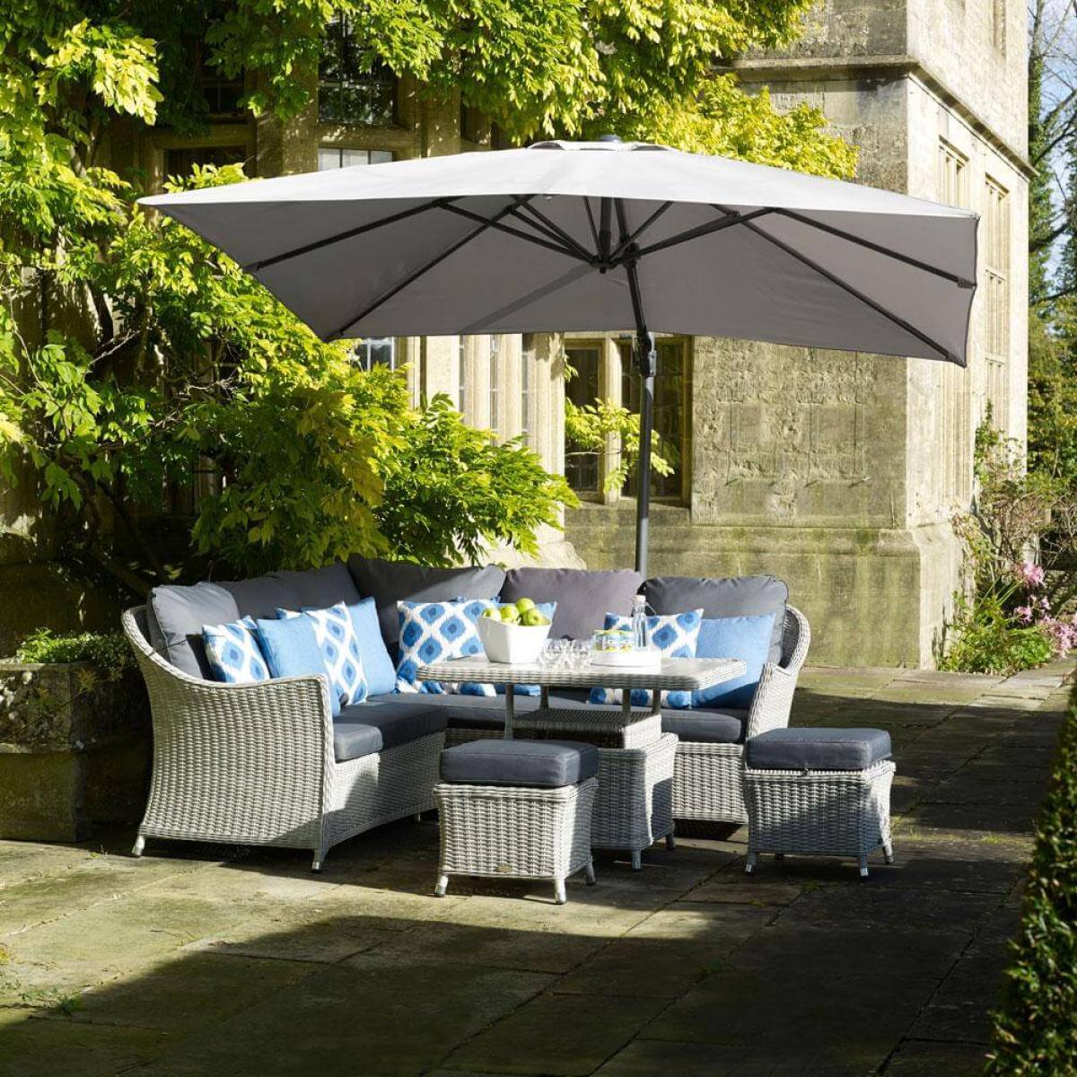 Set consists of:. Capable of rotating 360 degrees as well as tilting left, right, up and down, this grey Square Cantilever Parasol is part of the 2020 Bramblecrest Lichfield range. The water-resistant canopy is supported by a powder-coated aluminium pole, which stands in a granite parasol base. Made with crank handles for easy operation, this Bramblecrest parasol comes with a matching water-resistant parasol cover. Key features:.