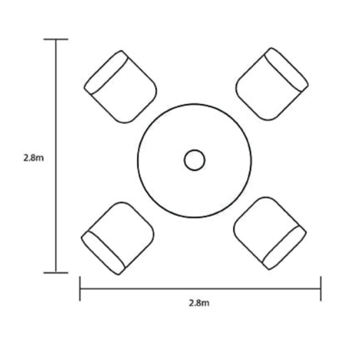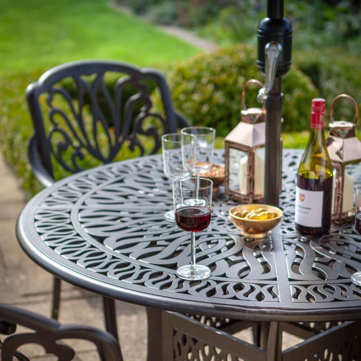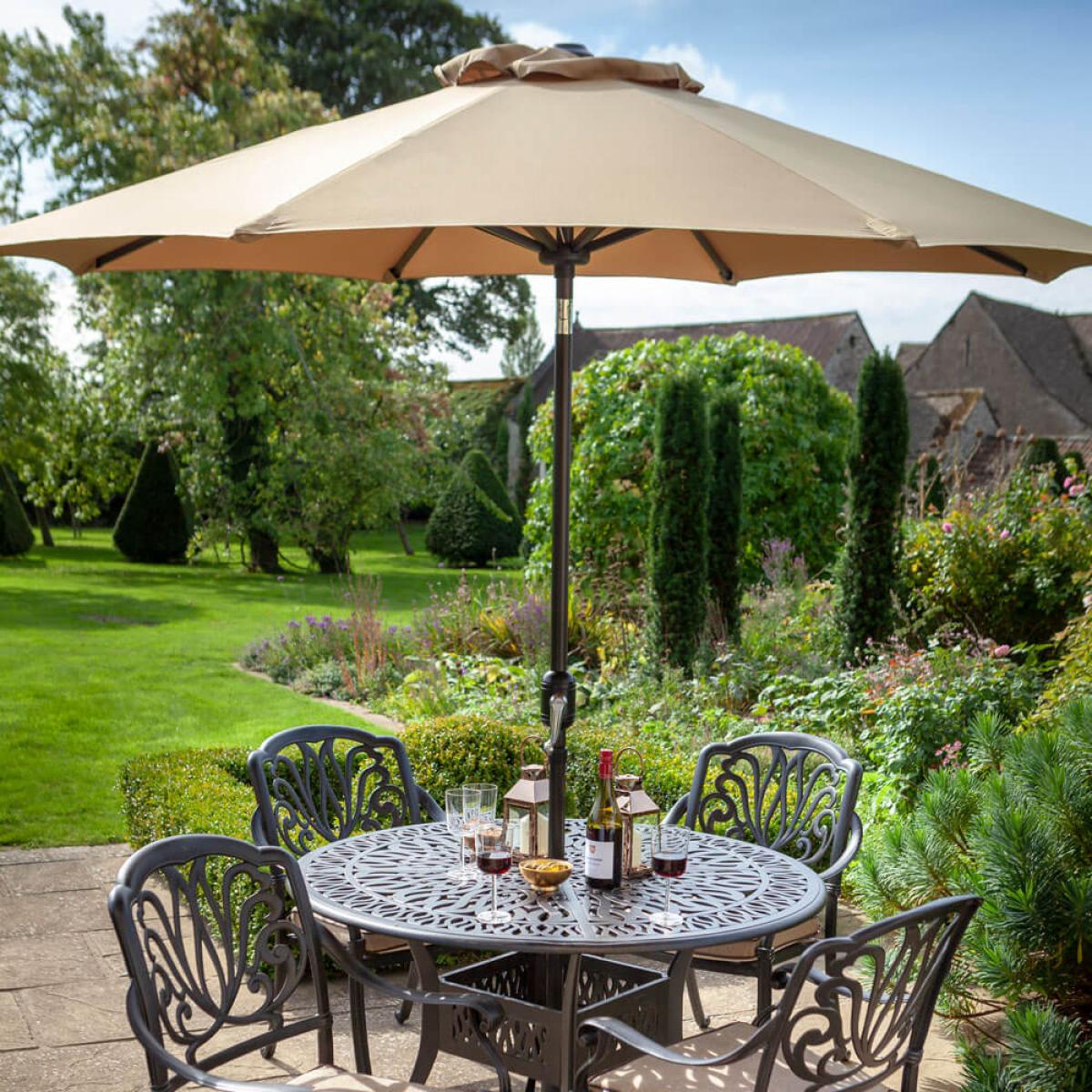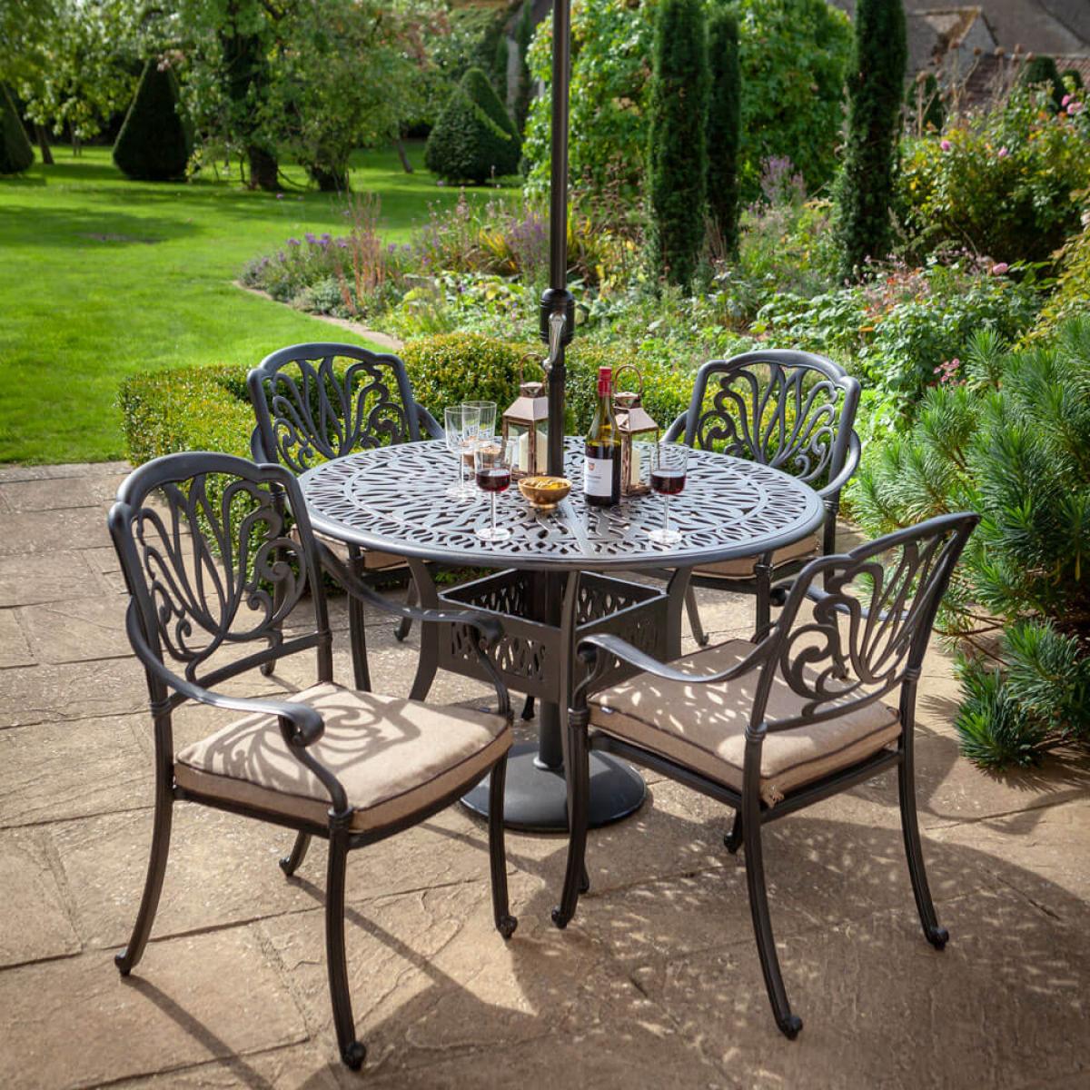 Set consists of:. Enjoy summer dining alfresco or a sunset tipple with company on the Hartman Amalfi 4 Seat Round Garden Set. This cast aluminium dining set is constructed in a wonderful contemporary design but with tradition at its heart. This 4 seat garden dining set will fit into compact gardens and varying patios alike. Contains a parasol that will provide ample shade and light rain cover, with a UV and shower resistant amber colour fabric. The parasol is held in place by 15kg weighted base that secures it centrally through the table. Cast aluminium furniture isn’t only an attractive material for the garden but boasts weather resistant qualities and will never succumb to the ravages of rust, just some. Simple maintenance. Will keep the set nicely for many years to come. The cushions are comfortable but are also prepared for a switch in forecast. They’re equipped with a Weatherready® system which repel light showers and simply allow heavier deluges to pass through the porous layers, simply drying overtime and in line with local conditions. We envisage many happy memories created around this attractive garden dining set.