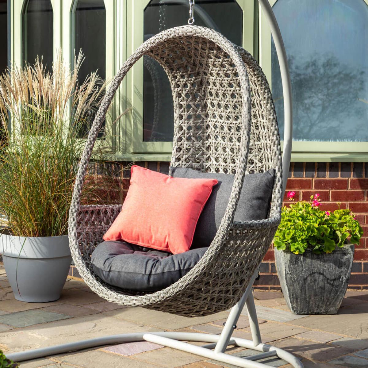 Set consists of:. The 2020 Hartman Heritage Outdoor Hanging Chair in Ash/Slate is a fantastic suspended cocoon chair to add into any garden or conservatory. Constructed from durable weather resistant rattan that’s been stretched tightly over strong aluminium frame, this hanging garden chair prospers from the enjoyably neutral Ash tone of the weave. The underlying structure is a powder coated aluminium which means it will easily resist rust and enable a longer life outdoors. The Slate tone cushions that accompany this rattan garden seat are equipped with Hartman’s patented Weatherready® system which deflects light showers with no fuss and remains stain, mildew and UV resistant. For any heavier rain the moisture will simply pass through the cushions’ permeable layers and right through the underside over time,. Local conditions allowing. , for best care store these cushions in the winter months. This hanging seat is destined to be a popular addition to many gardens this summer. 2020 Hartman Heritage Single Hanging Cocoon Chair key features:.