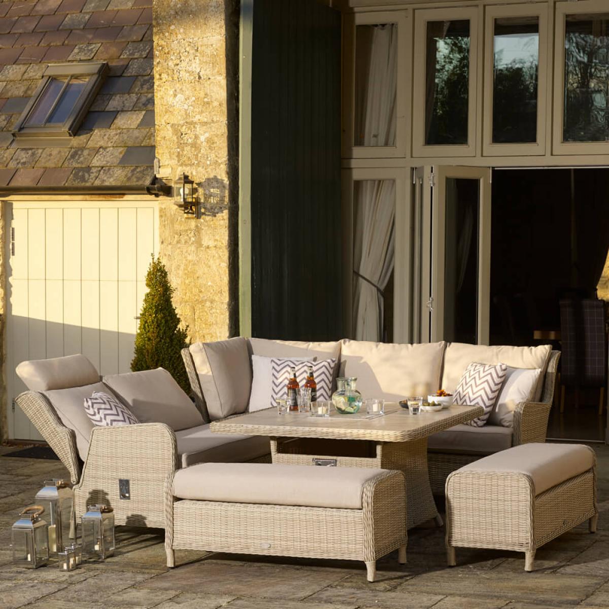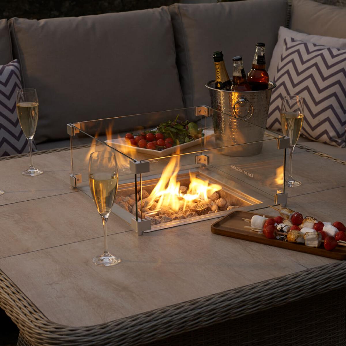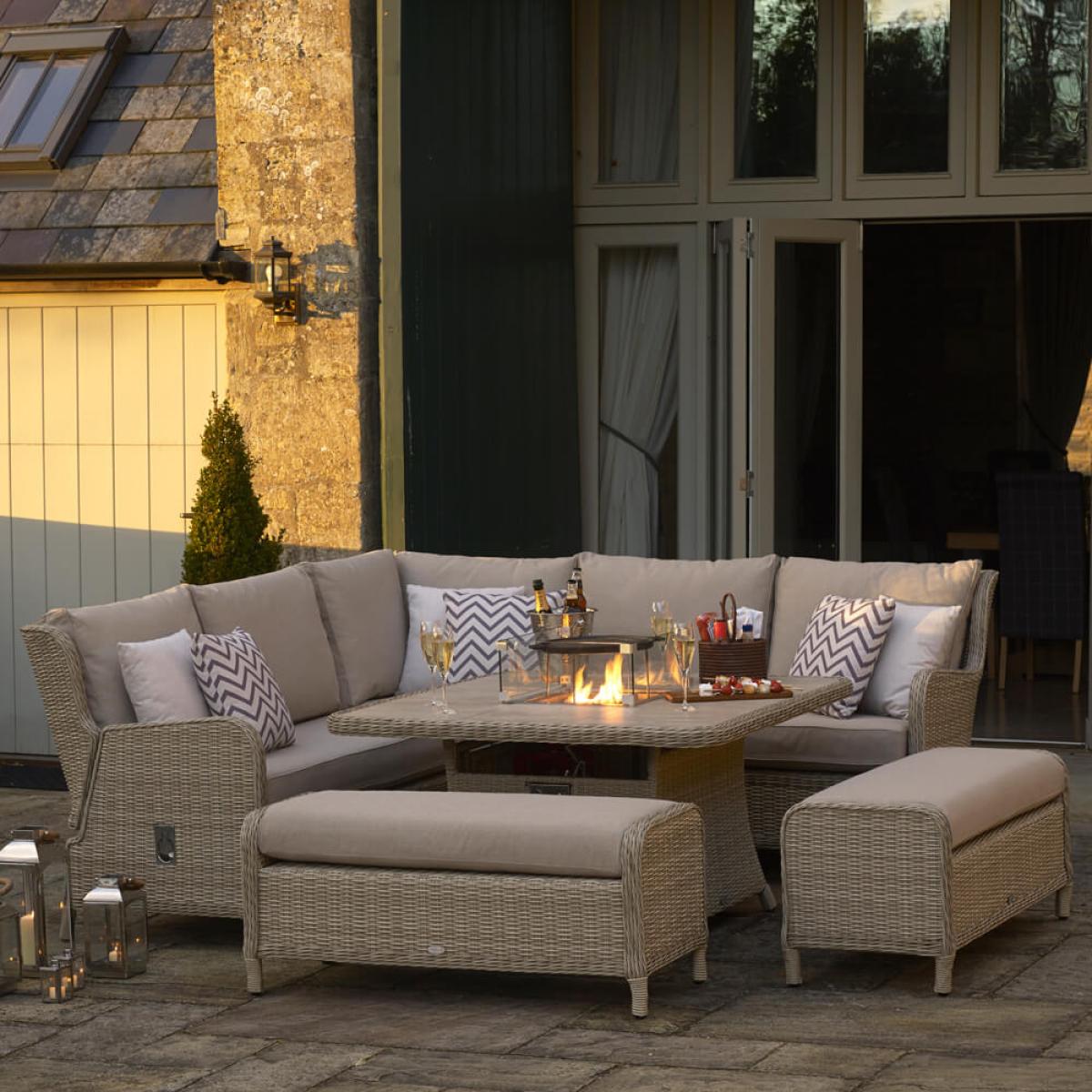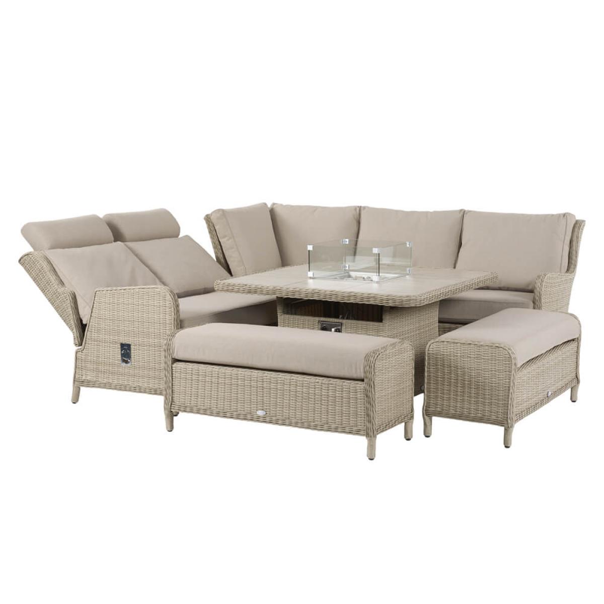 Set consists of:. About:. It’s quite simply a pleasure when those Spring or Autumn evenings can really be taken advantage of in the outdoors of our homes. The Chedworth Reclining Outdoor Sofa Fire Pit Table Dining Set provides precisely that, and more. Chedworth represents a new particularly lavish option from Bramblecrest, with touches of comfort and luxury in abundance. Firstly there’s an impressive two seat section that will recline to the level of comfort desired, specific fitted removable headrests can be attached to each seat for further comfort,. Sold separately. However it’s the central warming details that might just steal the show- a fully integrated gas firepit is built into the table top of this Bramblecrest furniture, complete with recessed glass guards to shield from wind and keep curious children at bay. A propane tank (sold separately) can be handily concealed within the table’s base – slid out on a easy access drawer mechanism. The fire pit will serve not only to keep the seated cosy but also as a flickering spectacle to savour. This large rattan garden set will seat as many as 8 people and comes with an irresistible reclining 2 seat sofa section. This sofa is a one of its kind to Inside. Out Living and indeed within the Bramblecrest dining set catalogue too, (along with the. Chedworth Square Adjustable Table Set. ). Have the person at the end simply reach down to the right and pull the piston operated lever and the two seats will recline pleasingly, fulfilling all lounging needs. A ceramic topped table is recessed fitted into the sandstone rattan weave seamlessly whilst when the firepit space can be concealed with a matching panel when not in use. There are thick stylised band border edges meaning the ceramic surface stays firmly in place. This rattan garden set benefits from the synthetic fibre, this material is superior at holding up against the elements and has UV stabilising properties. This Bramblecrest furniture is fine to be left out all year in that case. The extremely plump and comfy season proof cushions are Bramblecrest’s deepest fill, and softest to touch, yet. These Herringbone-Barley cushion covers retain a level of water resistance as well as anti-staining qualities, they’ll also deal with frost nicely too. Although we do just recommend storing these come the harsher winter months or any prolonged periods of heavier weather. Two long Bramblecrest Chedworth 2 seater stools also come topped with the same plush cushions, as seen on the sofa, and make excellent options for adults and kids alike. Excitingly al fresco cooking and enjoyment can be added to this dining set with the addition of the. Bramblecrest Square Griddle. That fits specifically over this fire-pit element, sold separately. The wonderful details and quality of this garden dining furniture means it stands out but also the neutral shades and elegant modern style means this recliner sofa set fits into many outdoor spaces easily. Chedworth Reclining Fire Pit Table Set Key benefits:. Further protect the integrity and finish of your furniture with a Bramblecrest protective cover set that has been designed to specifically fit this set, follow the link below to be take to this, sold separately:.
