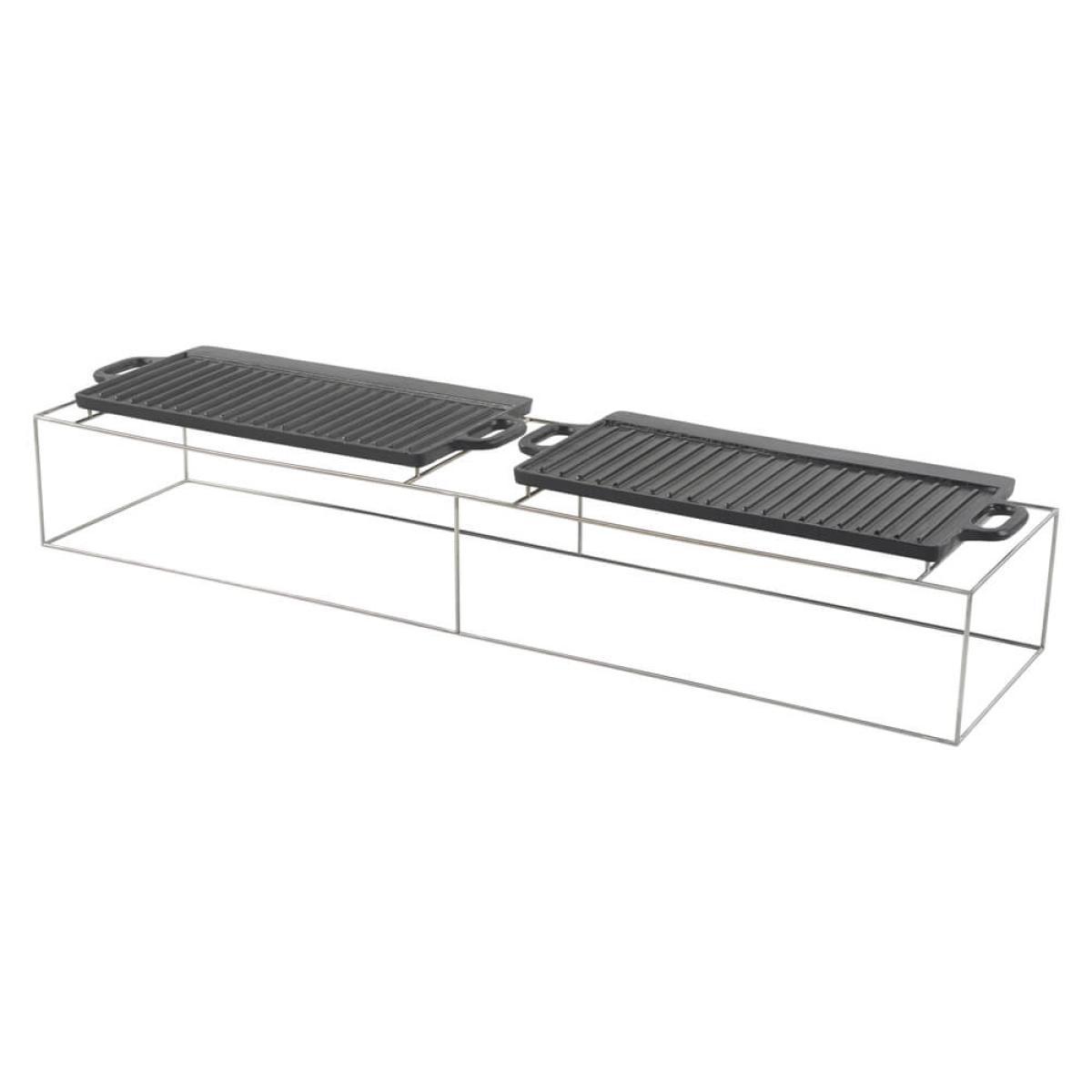 About:. Turn your rectangular Bramblecrst Fire Pit dining table into a truly alfresco dining experience with the Bramblecrest cast iron double griddle. This double griddle comes with reversible grilling surfaces, one ridged and one smoothed, both of which will serve any impromptu casual grilling when the time calls for it. This set fits specifically and perfectly within the glass surround of the Bramblecrest Rectangular Fire Pit Tables. (See list of links below to be taken to relevant matching sets). A best cleaning routine is to wash with non corrosive dish soap and warm water and then re-heat steadily (and briefly) to allow to dry with no danger of iron erosion, find out more. Here. So, why not add some culinary excitement to your outdoor gatherings this year!. To be used on:.