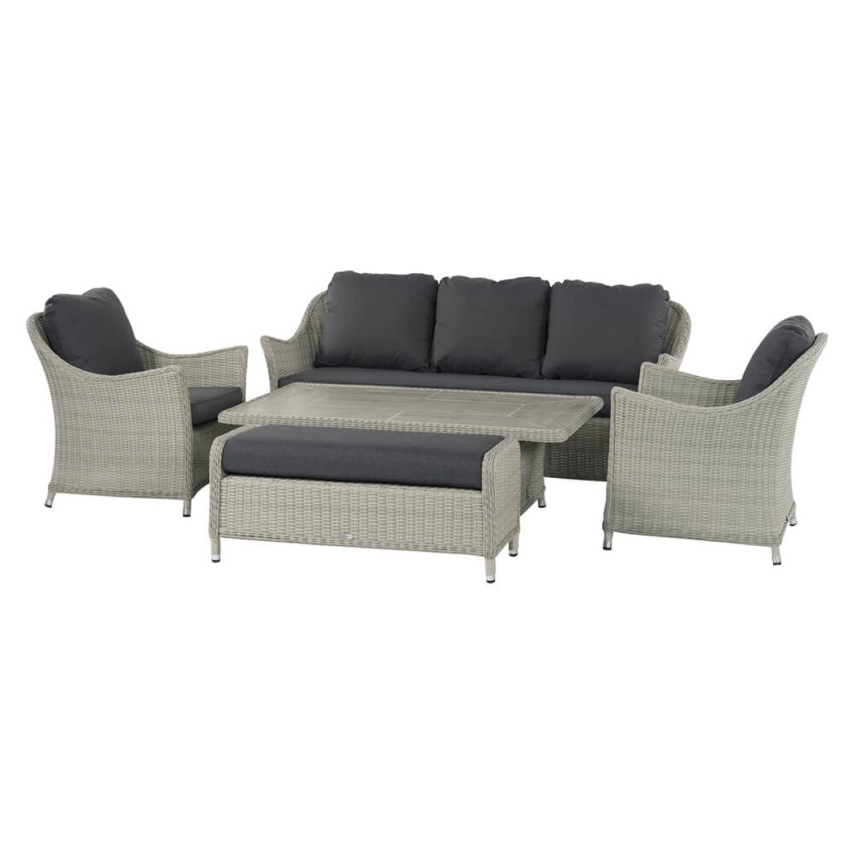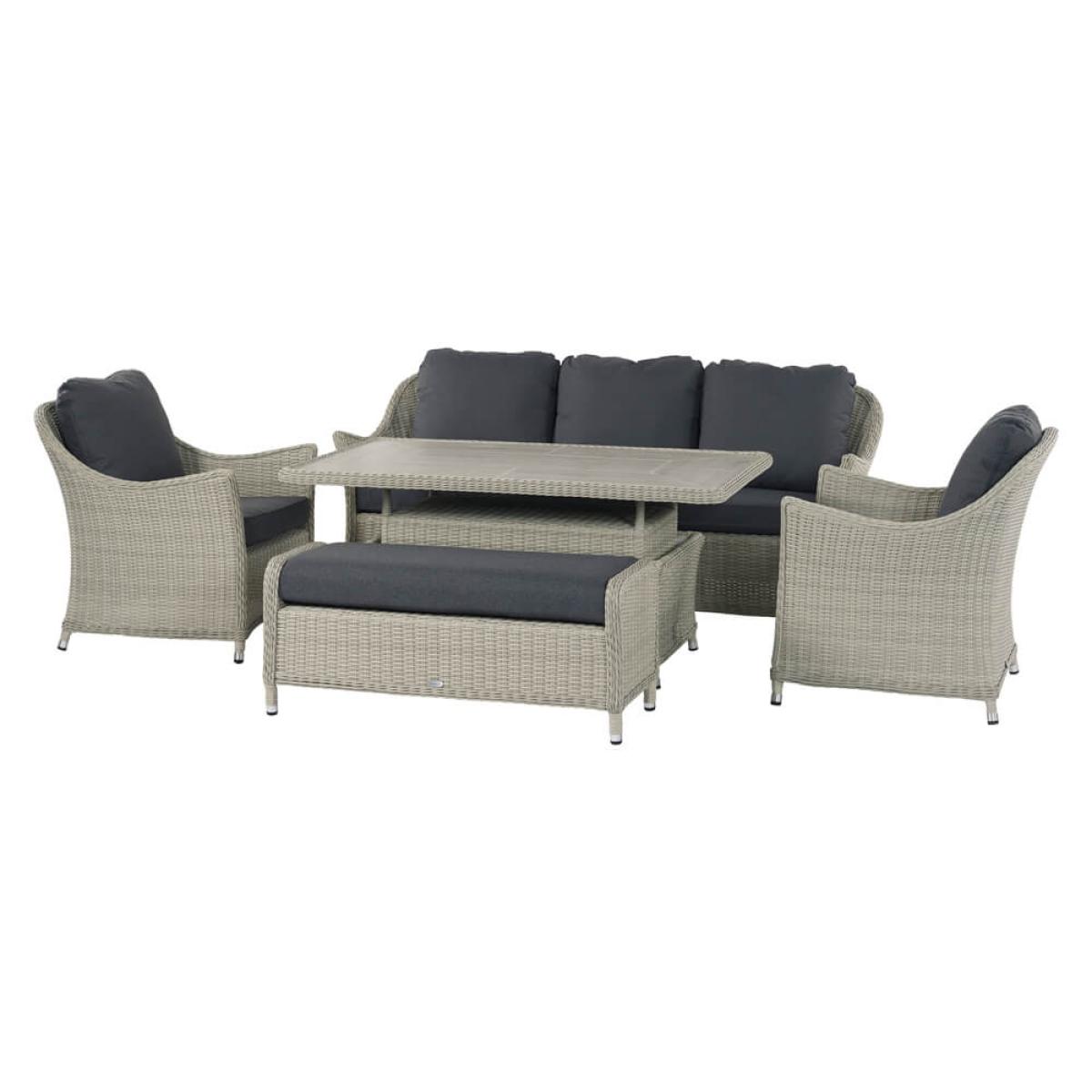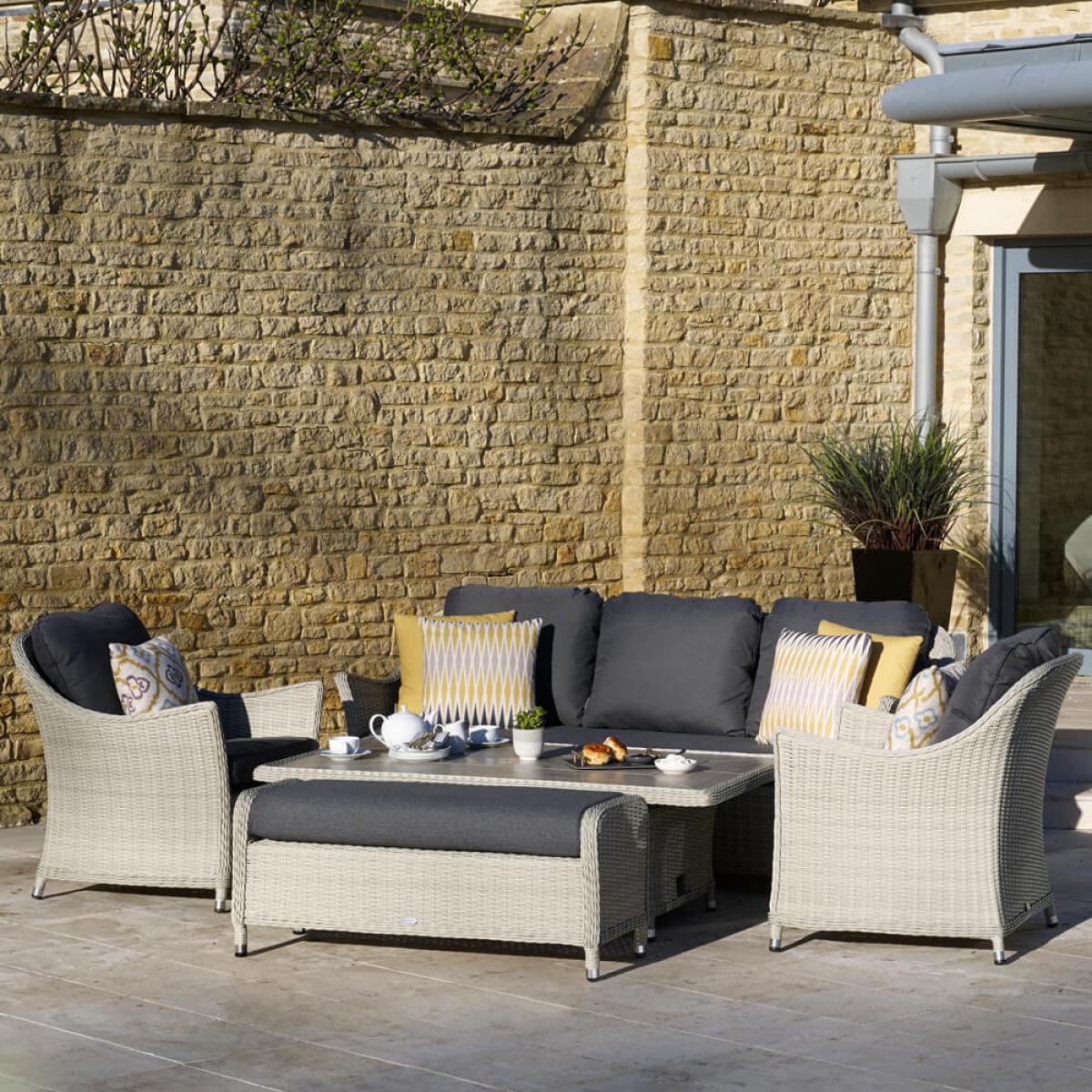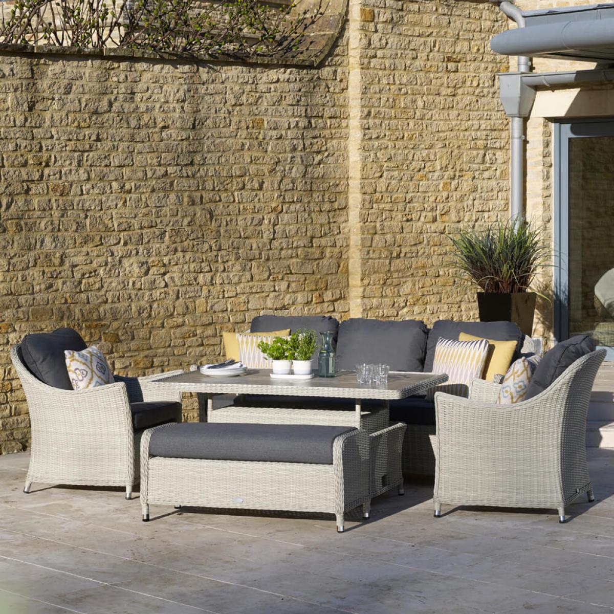 Set consists of:. About. The larger of the two Bramblecrest Monterey sofa sets, this collection of outdoor furniture is constructed from lightweight, weather-resistant rattan in a stylish dove grey, complemented with dark grey charcoal cushions. Consisting of a 3 seat sofa, 2 sofa armchairs, a 2 person casual dining bench and an adjustable rectangular dining table with a ceramic top, this garden sofa set is incredibly versatile and will suit any and all styles of garden decor. Lightweight yet durable, the top of the rectangular dining table can be easily raised for any occasion. The Season-Proof cushions are water resistant and will repel frost and staining also. We do however recommend that the cushions are stored indoors or in an outdoor. Cushion storage box. During the harsher winter months to increase their life span. The rattan weave furniture is by nature repellent against moisture so will fare very well against the elements. However, to best protect this set during the winter months a. Protective cover. Is worth considering, see details beneath the key features below. Bramblecrest Monterey 3 Seat Outdoor Sofa Set Key Features. :. Further protect the integrity and finish of your set with a Bramblecrest protective cover set made from durable polyester. These have been designed to specifically fit this set, follow the link below to be take to this. Sold separately:.