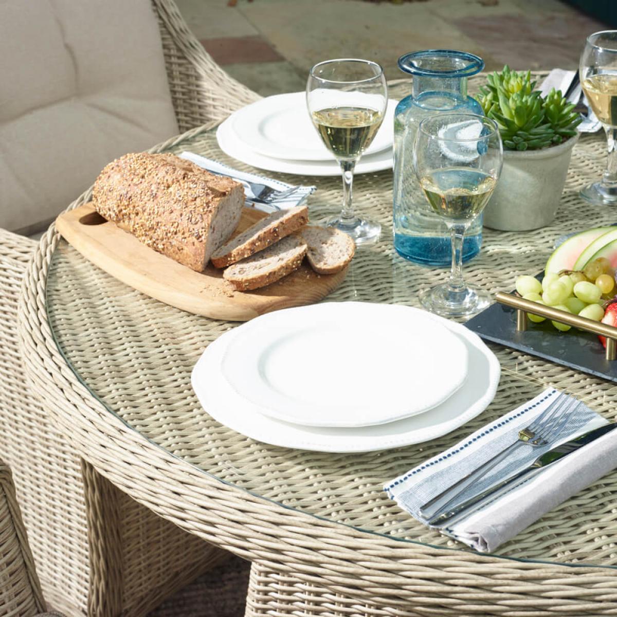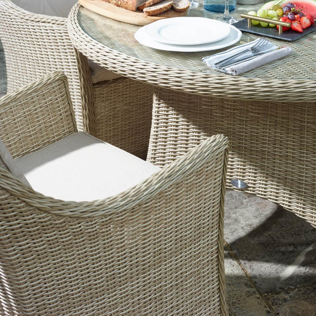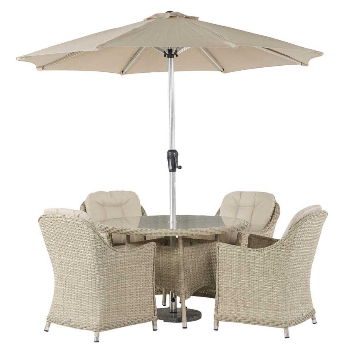 Set consists of: 1 x 2021 Monterey 122cm Round Table with Glass Top - Sandstone 4 x 2021 Monterey Armchair with Season proof Eco Cushions - Sandstone 1 x 2.5m diameter Crank Handle Parasol - Sand 1 x Granite Parasol Base - 15kgAbout:. Time outdoors will glide by very easily sat around the majestic 2021 Bramblecrest Monterey 4 Seat Garden Set in Sandstone rattan. This garden patio furniture is constructed from weather-resistant rattan a moisture resistant material that’s lightweight and easy to maintain. To best protect this set during the winter months a protective cover is worth considering see details beneath the key features below. Accompanying the armchairs are water-resistant oat shade eco-cushions these are made almost entirely from recycled bottles and boast resistance against light showers frost and flash downpours – for persistent rain and certainly during winter time we recommend storing these indoors. This rattan dining set consists of a 122cm round table with a recessed glass table top 4 Monterey arm chairs a crank-handle operated garden parasol and a granite parasol base. Aside from the 15kg granite parasol base all the furniture included in this Bramblecrest outdoor dining set is surprisingly lightweight and can be moved around with ease. Built on lightweight yet sturdy aluminium frames so rust isn't a concern. Also available in Dove Grey smooth weave rattan. Bramblecrest Monterey 4 Seat Outdoor Dining Set key features: Delightful sandstone smooth weave with UV stabilising qualities Season-proof cushions in oat shade with inbuilt water resistance whilst also being stain resistant. Appealing contemporary design with curved lines and flared armrests Leave outside with minimal maintenance required (except cushions) Constructed from mostly recycled materials including cushions Impressively durable aluminium frames that remain lightweight to move about Tempered safety glass used for the table top is recessed for a smooth dining experience. Parasol key features: UV50+ protection Water resistant Easy to clean Removable canopy Crank handles for easy operation Easy to move lightweight aluminium frame Integral wind safety vent Powder-coated aluminium frames will not rust Screw thread in parasol base to easily secure parasol in place. Further protect the integrity and finish of your Bramblecrest Set with a Bramblecrest protective cover made from durable weather resistant polyfibre that has been designed to specifically fit this set follow the link below to be take to this. Sold separately: Bramblecrest 100 & 120cm Round Dining Table Set Cover