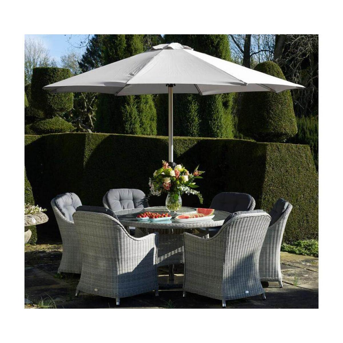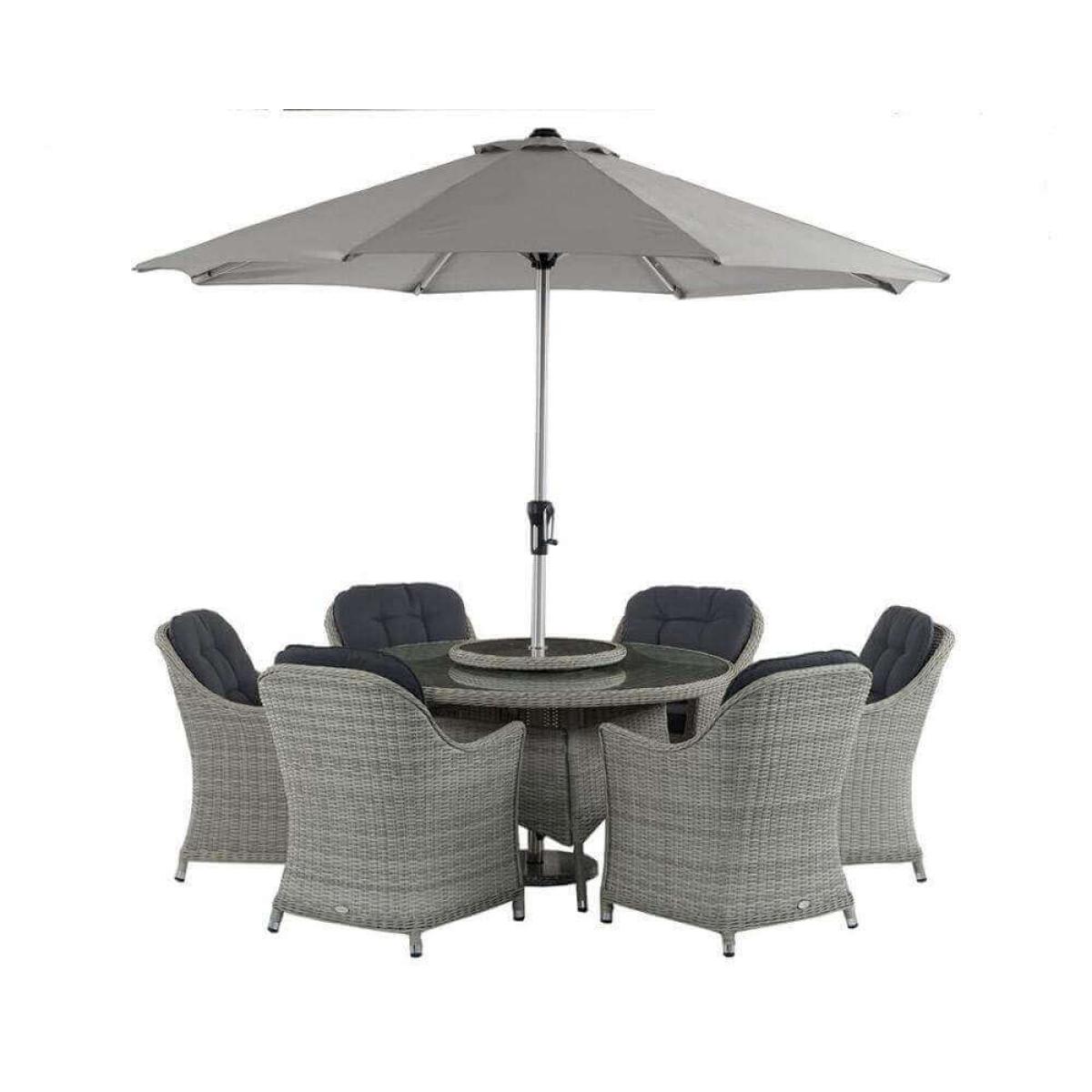 Set consists of:. About:. The ultimate set for stylish yet comfortable outside dining. This Bramblecrest Monterey dining set has a sociable round table big enough to accommodate 6 good sized armchairs, each with padded season-proof cushions. These cushions are frost and stain resistant and shower repellent. We recommend storing during prolonged periods of bad weather and the winter months. The rattan weave construction means of this Bramblecrest 6 seat dining set will be fine to face what the elements can throw at it, however, to best protect this set during the winter months a. Protective cover. Is worth considering, see details beneath the key features below. The contemporary grey furniture set also benefits from a Lazy Susan, Uv50+ rated parasol and weighted parasol base – ensuring you have some all important shade protection from the midday sun. Key Features. :. Further protect the integrity and finish of your set with a Bramblecrest protective cover set made from durable polyester. These have been designed to specifically fit this set, follow the link below to be take to this. Sold separately:.
