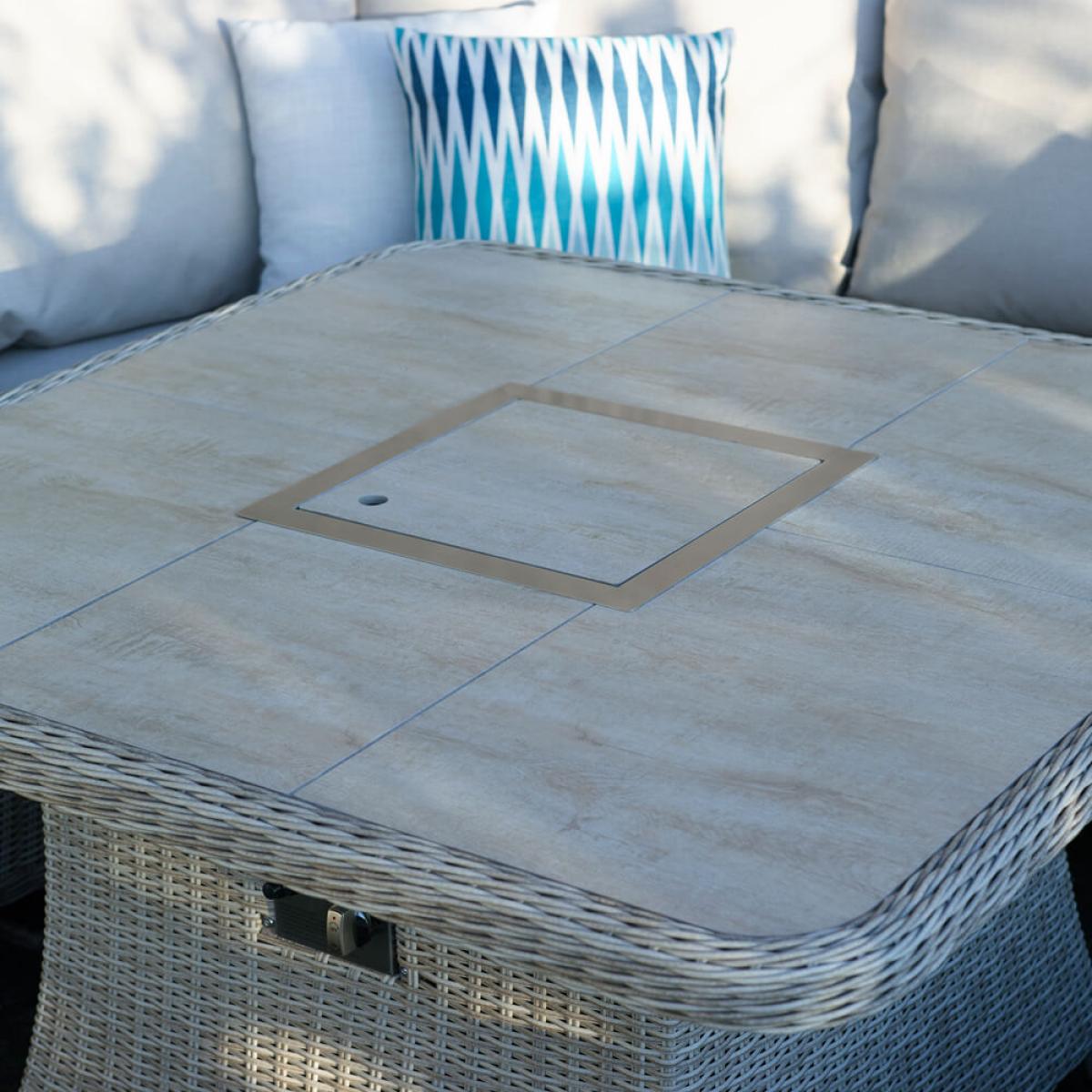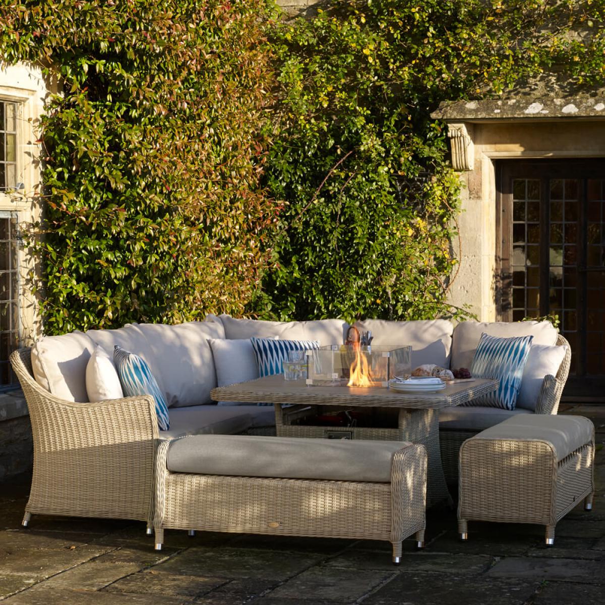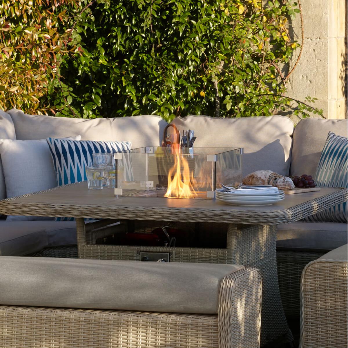 Set consists of:. About:. There will be no need to pack up the party and head inside when the light fades and mercury drops if using the Bramblecrest Monterey Sofa Set with Square Fire Pit Dining Table. This fire pit garden furniture is simple to operate and provides warmth and spectacle. The innovative gas fueled firepit emerges from the tactile ceramic tabletop, complete with protective tempered glass guards that keep the kids at bay but crucially shield against wind interference. The element of this rattan dining set is operated with a gauge on the side of the table and the tank, (sold separately), is handily hidden within the table suspended by a small concealed draw, this in turn stops the tank rusting if placed onto patios or decking. It’s not just the flickering illuminations that will have your guests chatting, this garden dining sofa set benefits from large plump oat season-proof cushions, meaning comfort is assured. Two benches also have the same soft eco season proofed cushions. These cushions not only boast a construction nearly entirely of recycled plastic bottles but also handily repel light showers, sudden downpours, frost and even stains. This rattan outdoor furniture is ready for the rigours of life outdoors, the nature of the resin rattan weave means this set will stand up to the elements throw at it. However, to best protect this set during the winter months a. Protective cover. Is worth considering, see details beneath the key features below. This furniture is an 8 seat garden set owing to its purposely curved form, helpfully fitting in somebody into the corner segment with no awkward knee-knocking uncomfortableness. If wanting to bring an element of alfresco dining to proceedings add the specially. Integrated griddle, sold separately. Bramblecrest Monterey Modular Sofa Casual Square Fire Pit Dining Set Key benefits. :. Further protect the integrity and finish of your furniture with a Bramblecrest protective cover set that has been designed to specifically fit this set, follow the link below to be take to this. Sold separately:.