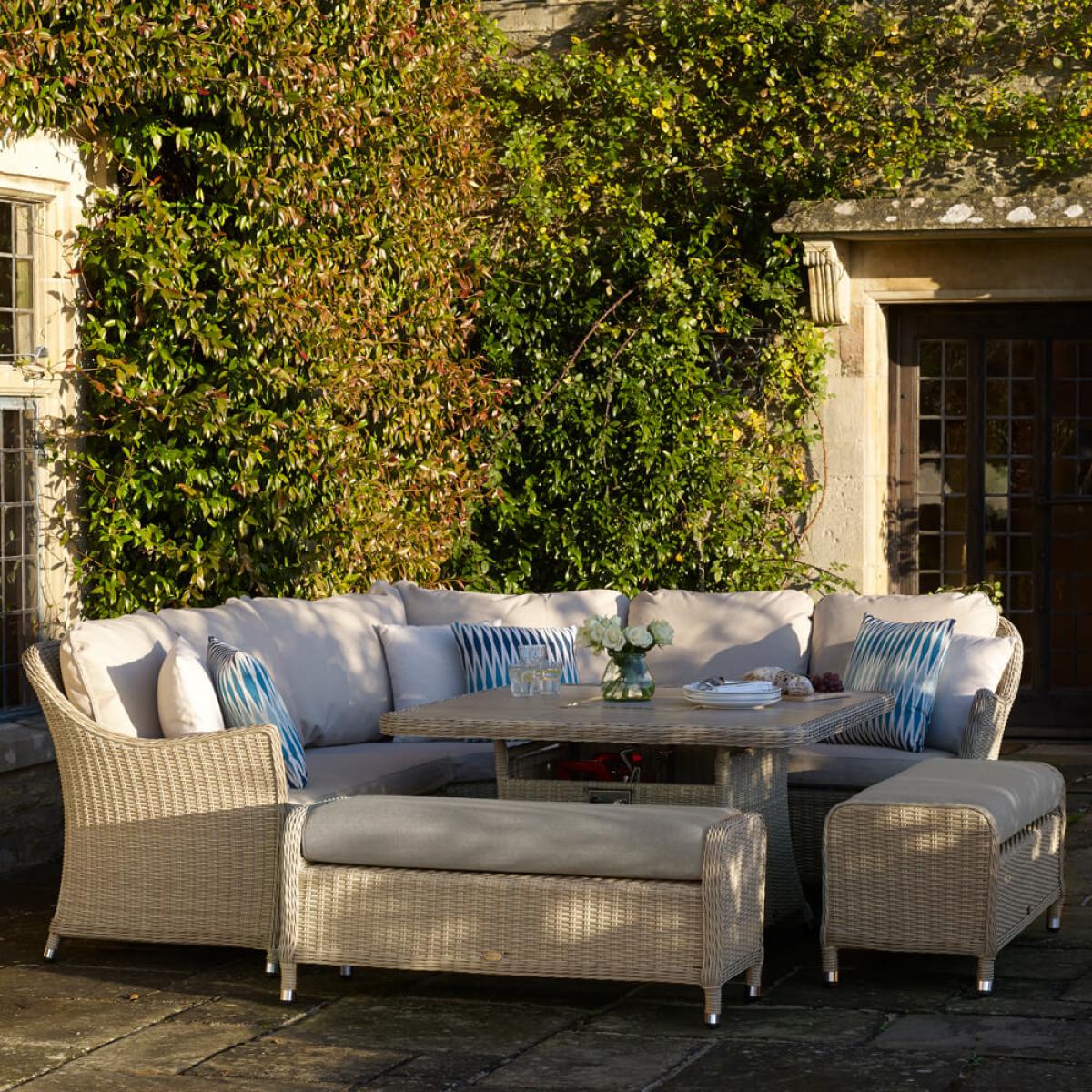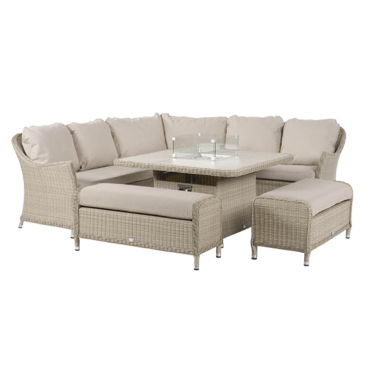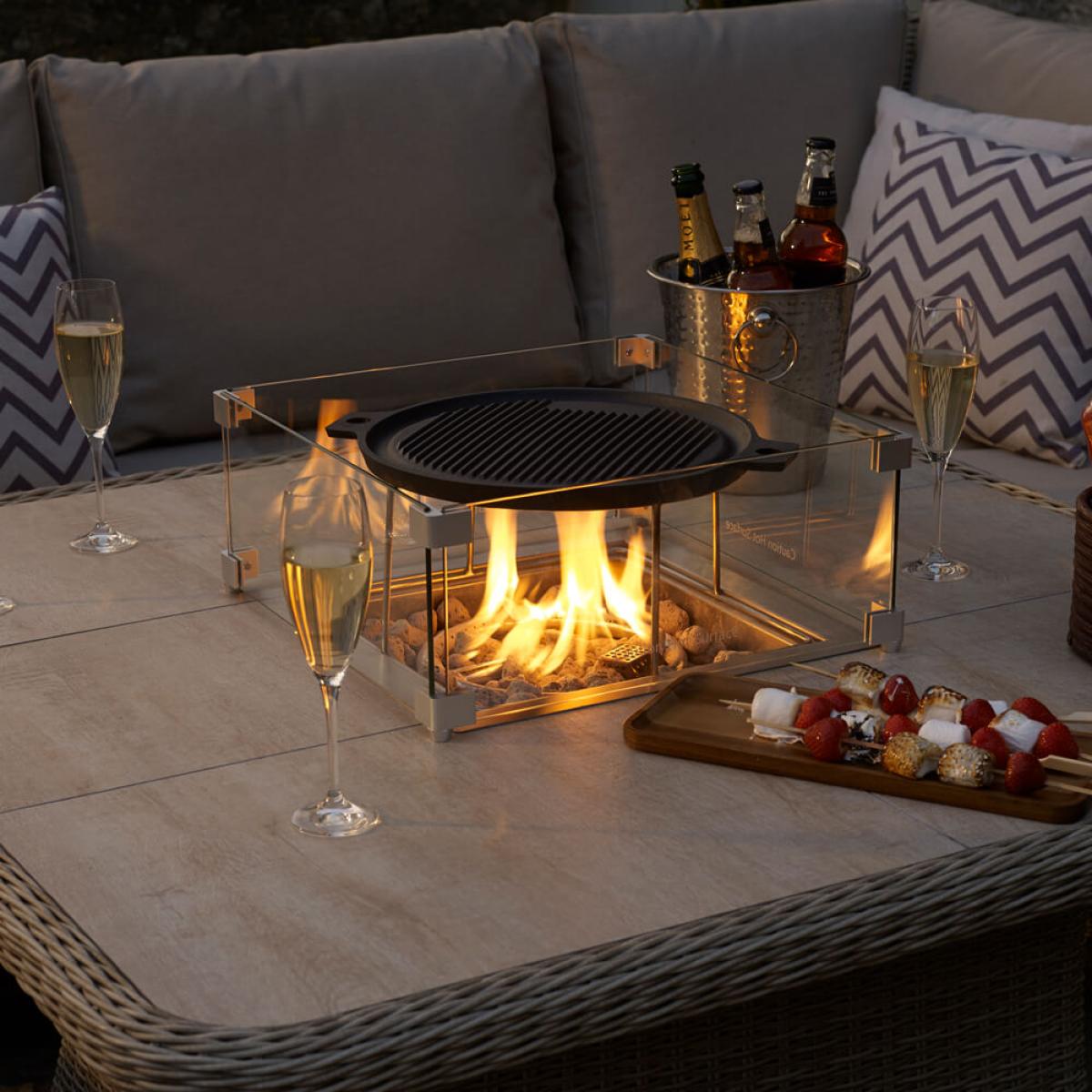Set consists of:. About:. There will be no need to pack up the party and head inside when the light fades and mercury drops if using the Bramblecrest Monterey Sofa Set with Square Fire Pit Dining Table. This fire pit garden furniture is simple to operate and provides warmth and spectacle. The innovative gas fueled firepit emerges from the tactile ceramic tabletop, complete with protective tempered glass guards that keep the kids at bay but crucially shield against wind interference. The element of this rattan dining set is operated with a gauge on the side of the table and the tank, (sold separately), is handily hidden within the table suspended by a small concealed draw, this in turn stops the tank rusting if placed onto patios or decking. It’s not just the flickering illuminations that will have your guests chatting, this garden dining sofa set benefits from large plump oat season-proof cushions, meaning comfort is assured. Two benches also have the same soft eco season proofed cushions. These cushions not only boast a construction nearly entirely of recycled plastic bottles but also handily repel light showers, sudden downpours, frost and even stains. This rattan outdoor furniture is ready for the rigours of life outdoors, the nature of the resin rattan weave means this set will stand up to the elements throw at it. However, to best protect this set during the winter months a. Protective cover. Is worth considering, see details beneath the key features below. This furniture is an 8 seat garden set owing to its purposely curved form, helpfully fitting in somebody into the corner segment with no awkward knee-knocking uncomfortableness. If wanting to bring an element of alfresco dining to proceedings add the specially. Integrated griddle, sold separately. Bramblecrest Monterey Modular Sofa Casual Square Fire Pit Dining Set Key benefits. :. Further protect the integrity and finish of your furniture with a Bramblecrest protective cover set that has been designed to specifically fit this set, follow the link below to be take to this. Sold separately:.