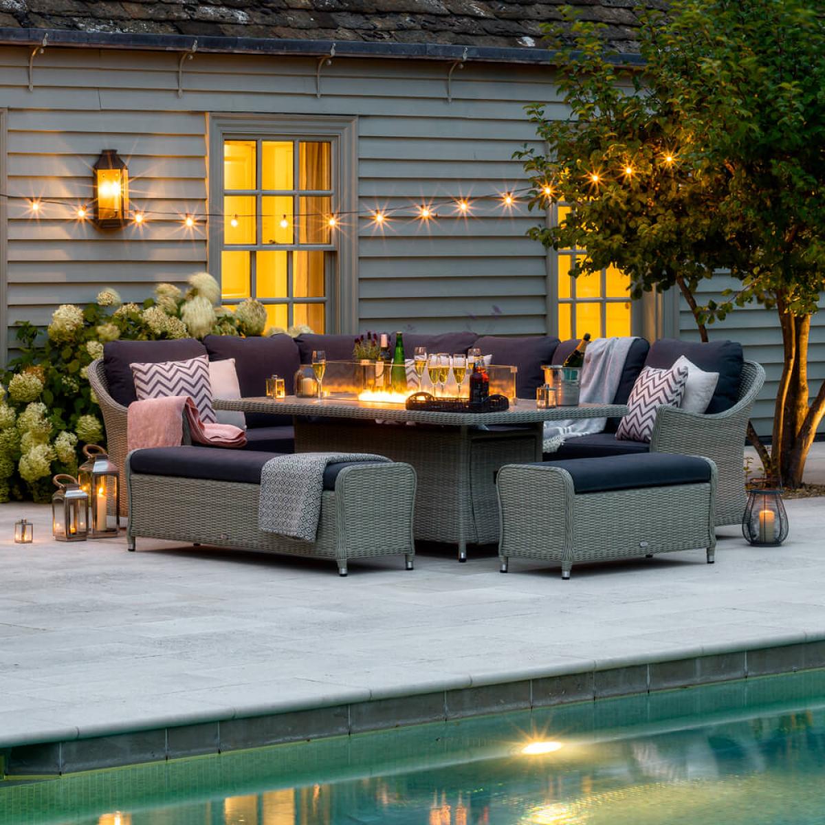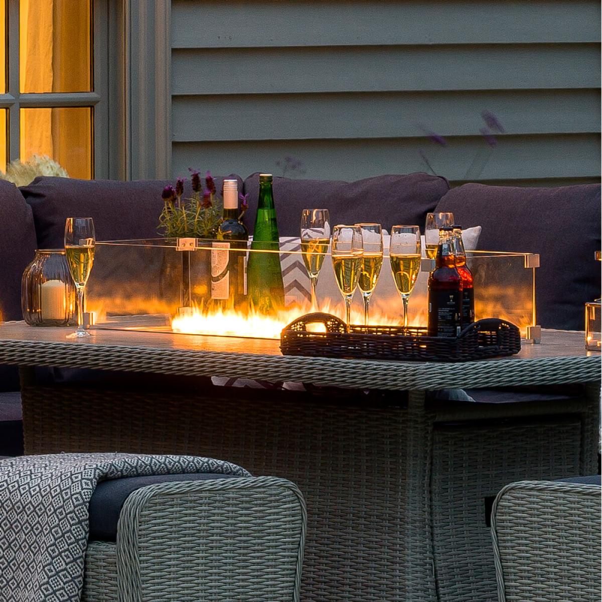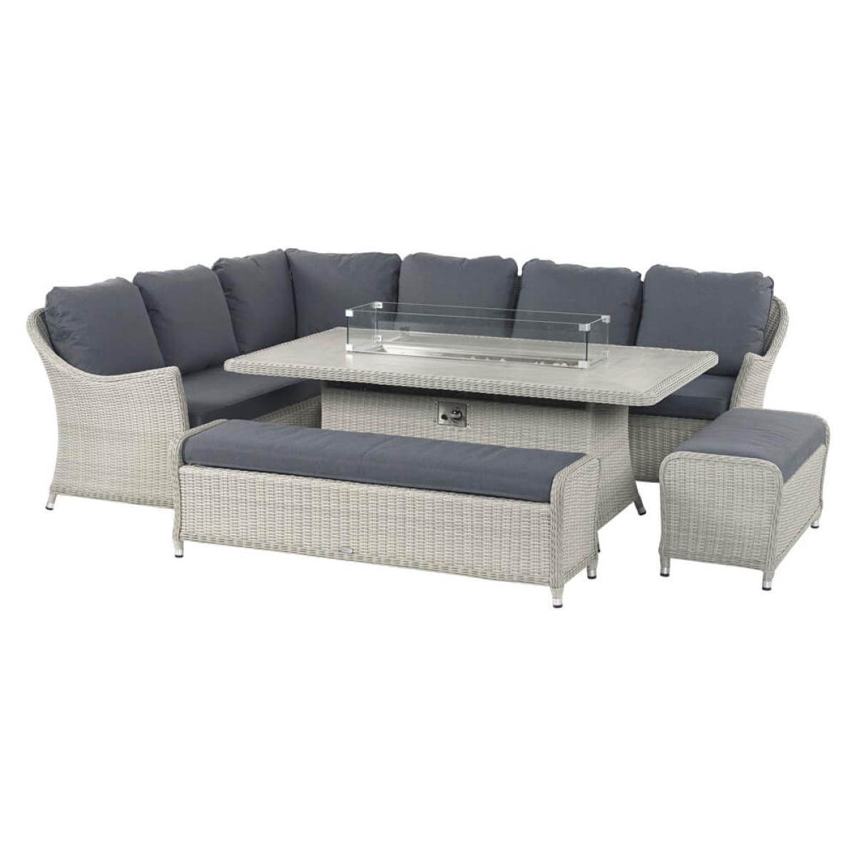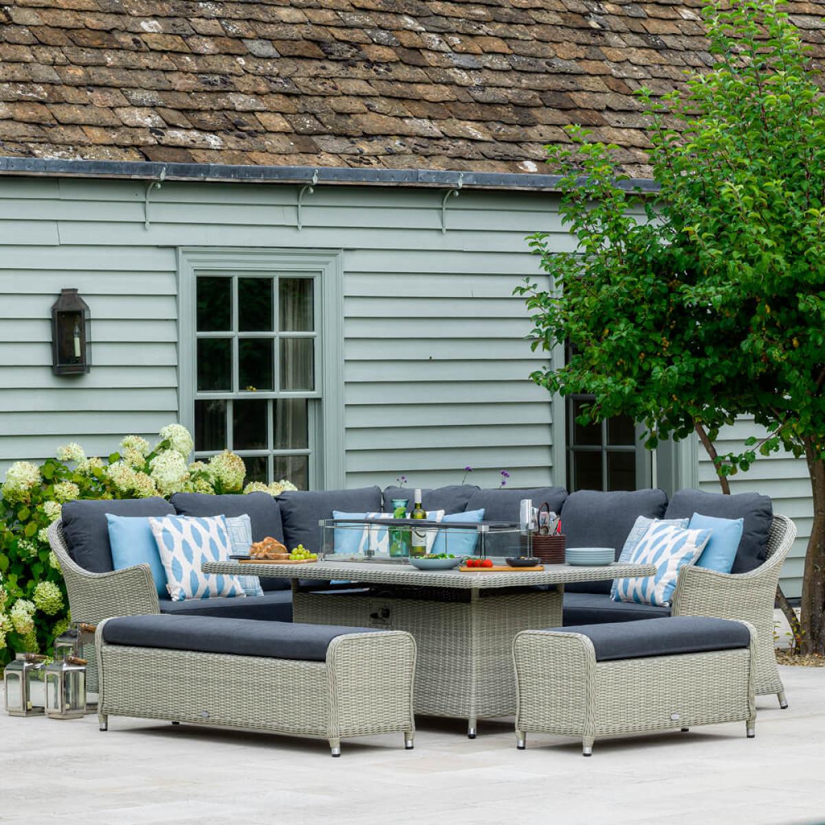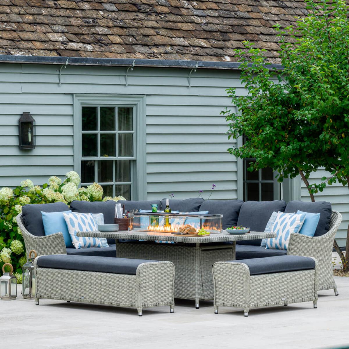 Set consists of:. About:. It will be easy to extend an afternoon’s lounging into an evening’s enjoyment with the Bramblecrest Monterey Fire Pit Table and Modular Corner Sofa Set. When the light fades and the mercury drops this fire pit garden furniture is easy to operate with an accessible dial on the table’s side. The fuel tank (sold separately) is handily hidden within the base of the table on a retractable drawer. Tempered glass shields also mean wind won’t interfere with the flames, but in no way tempers the warming heat output. There’s also opportunity to add some culinary alfresco excitement to proceedings with Bramblecrest’s new and specific fitting. Cast Iron Double Griddle. , a great way to share some delicious outdoor moments together, (to be purchased separately). The ceramic dining table surface is a lovely tactile feature, a subtle panel of the same ceramic fills the firepit feature when it’s not in use. This Bramblecrest furniture is a modern garden set with classic touches, suitable for many gardens. One large dining bench comes with a fully integrated storage compartment, just remove the cushion to access this, a casual dining bench also accompanies the large bench and corner sofa. This arrangement can seat a maximum of 10 people. Durability comes at no sacrifice to style with this garden dining furniture. The delightful dove grey smooth-weave construction is made from synthetic rattan wicker. A material which by its nature repels moisture, meaning this rattan garden set can be left out in all conditions and will stand strong. This weave is bound tightly around an aluminum frame that’s been powder coated to resist the ravages of rust. Further weather performance comes with the plump charcoal eco-cushions, a season proofing repels light showers and short sharp rain bursts and even frost. For anything heavier, and certainly during the winter months, we just recommend that these are stored indoors. With this Bramblecrest furniture you’ll be able to enjoy the outdoors of the home into seasons not usually associated with the garden, something which can’t be underestimated in coming months. Bramblecrest Monterey Modular Sofa, Large Rectangle Ceramic Casual Dining Table with Fire Pit Set Key Features:. Further protect the integrity and finish of your furniture with a Bramblecrest protective cover set that has been designed to specifically fit this set, follow the link below to be take to this. Sold separately:.