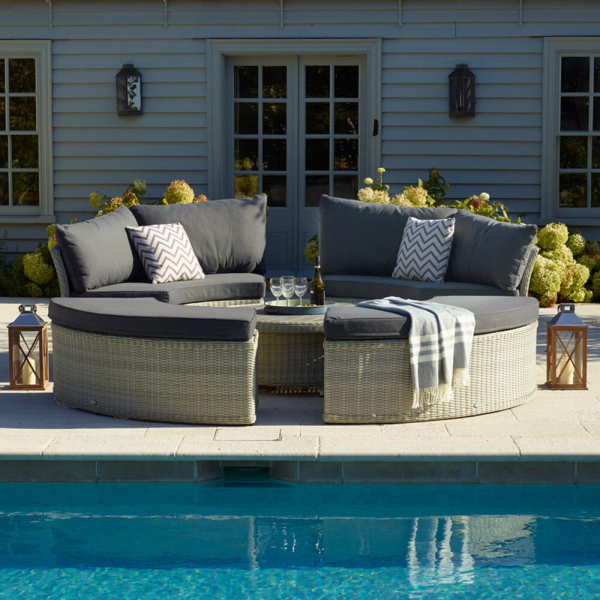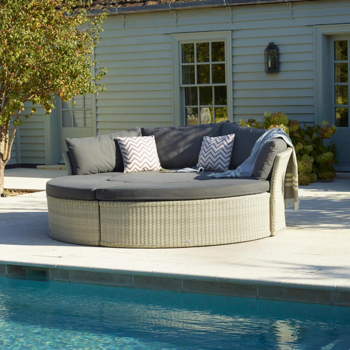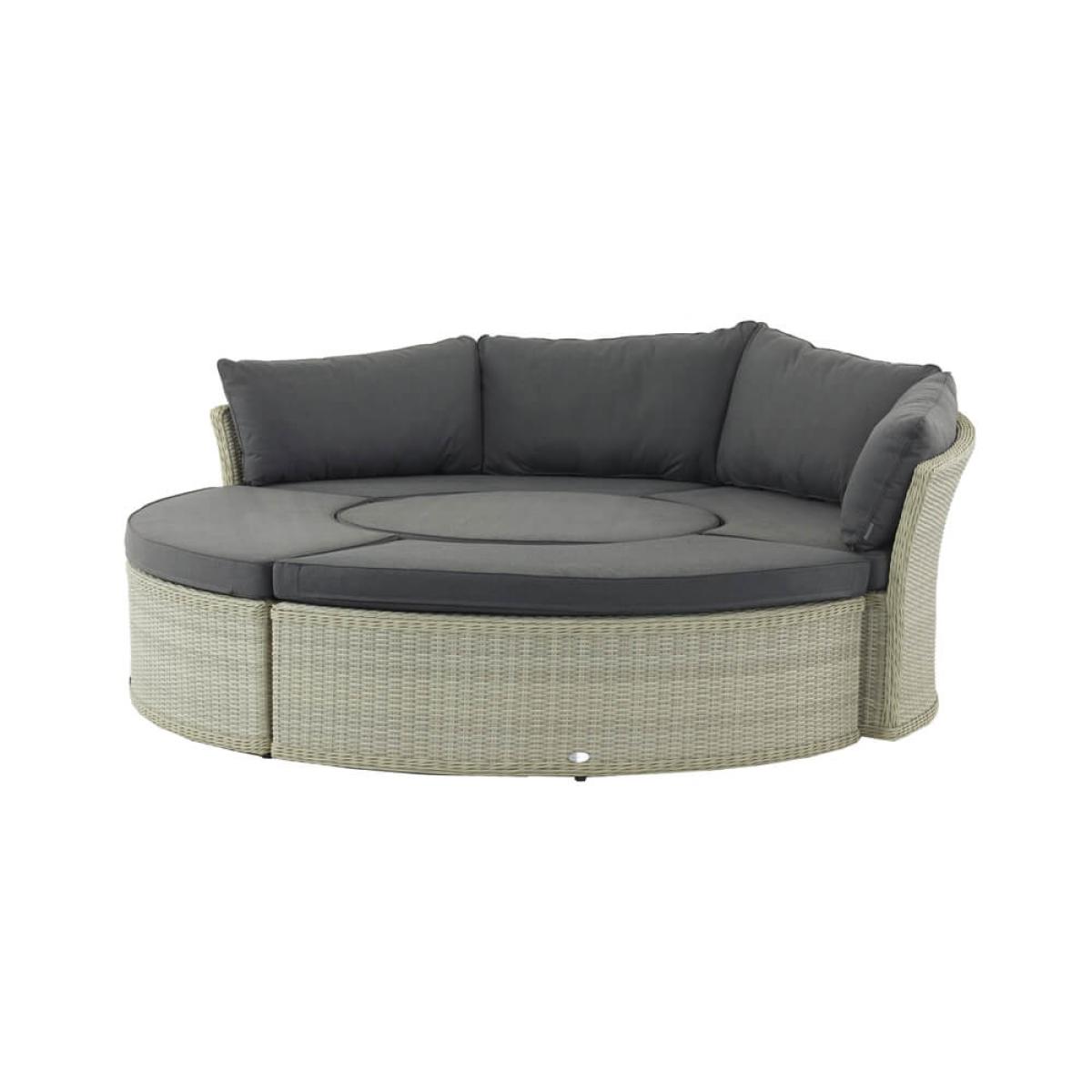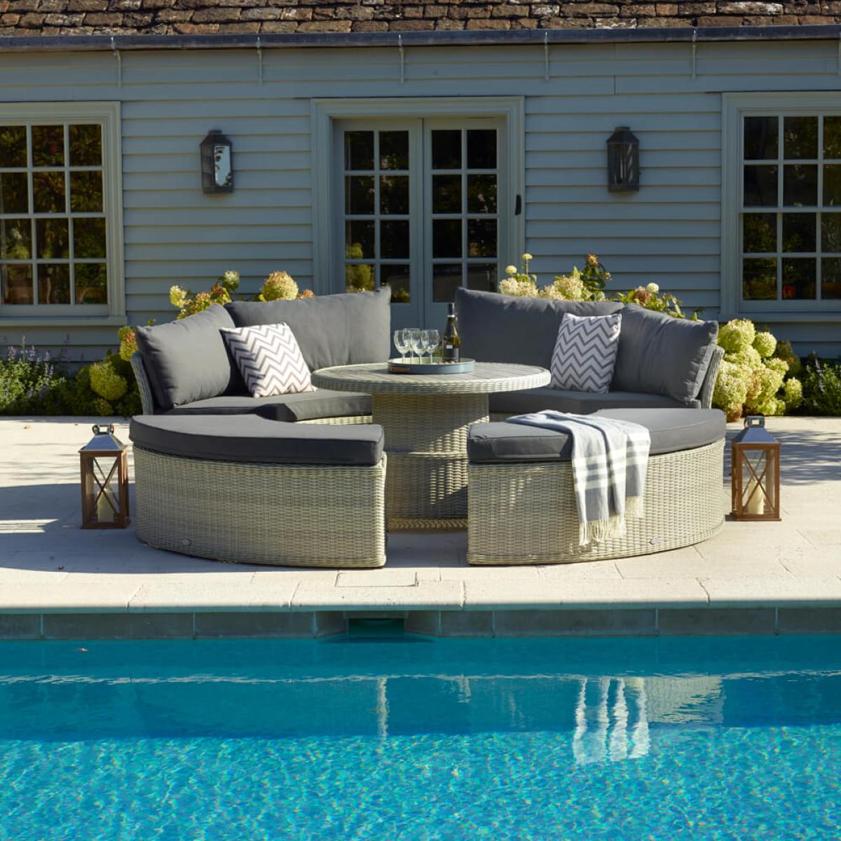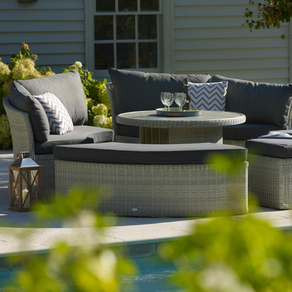 Set consists of:. About:. Welcome to the clever, comfortable and endlessly practical Bramblecrest Monterey Casual Dining Daybed. This spongey and comfortable casual daybed will seat 8 for casual drinks or even dinner and allow 4 for outstretched lounging. It’s the transformative adjustable table and cushion configurations that allow for multi-use for this elegant round garden lounge furniture. To explain – the table comes with a perfectly fitting round cushion topper that when placed atop and the surrounding curved benches brought together make one round daybed. Remove the round cushion top, part the benches and adjust the table and – voila! Drinks and dining is made easy. Strikingly inventive and good looking, the practicalities don’t end there. The construction of this outdoor patio furniture comes in an attractive smooth dove grey rattan. Rattan by nature is a synthetic fibre that repels moisture, this furniture is therefore largely fine to deal with the elements. There are, however, measures to give this rattan dining set the longest lease of life against harsher winter elements by using a Bramblecrest. Protective cover. , see details of the specific fitting covers beneath the key features. Whilst the cushions themselves are season proof so also have a level of repellency, they’ll deflect light showers and frost, for any heavier downpours and in the winter months we just recommend storing these indoors. Some may be surprised to learn that these plump welcoming cushions are made almost entirely from recycled plastic bottles. A sturdy yet lightweight aluminium frame supports this casual Bramblecrest dining set come daybed, so it won’t rust. We see endless hours spent laid out or casually dining on this fabulously innovative designed outdoor patio furniture. Bramblecrest Monterey Large Modular Casual Dining Daybed Set with Ceramic Round Adjustable Table Set Key Features:. Further protect the integrity and finish of your furniture with a Bramblecrest protective cover set that has been designed to specifically fit this set, follow the link below to be take to this. Sold separately:.