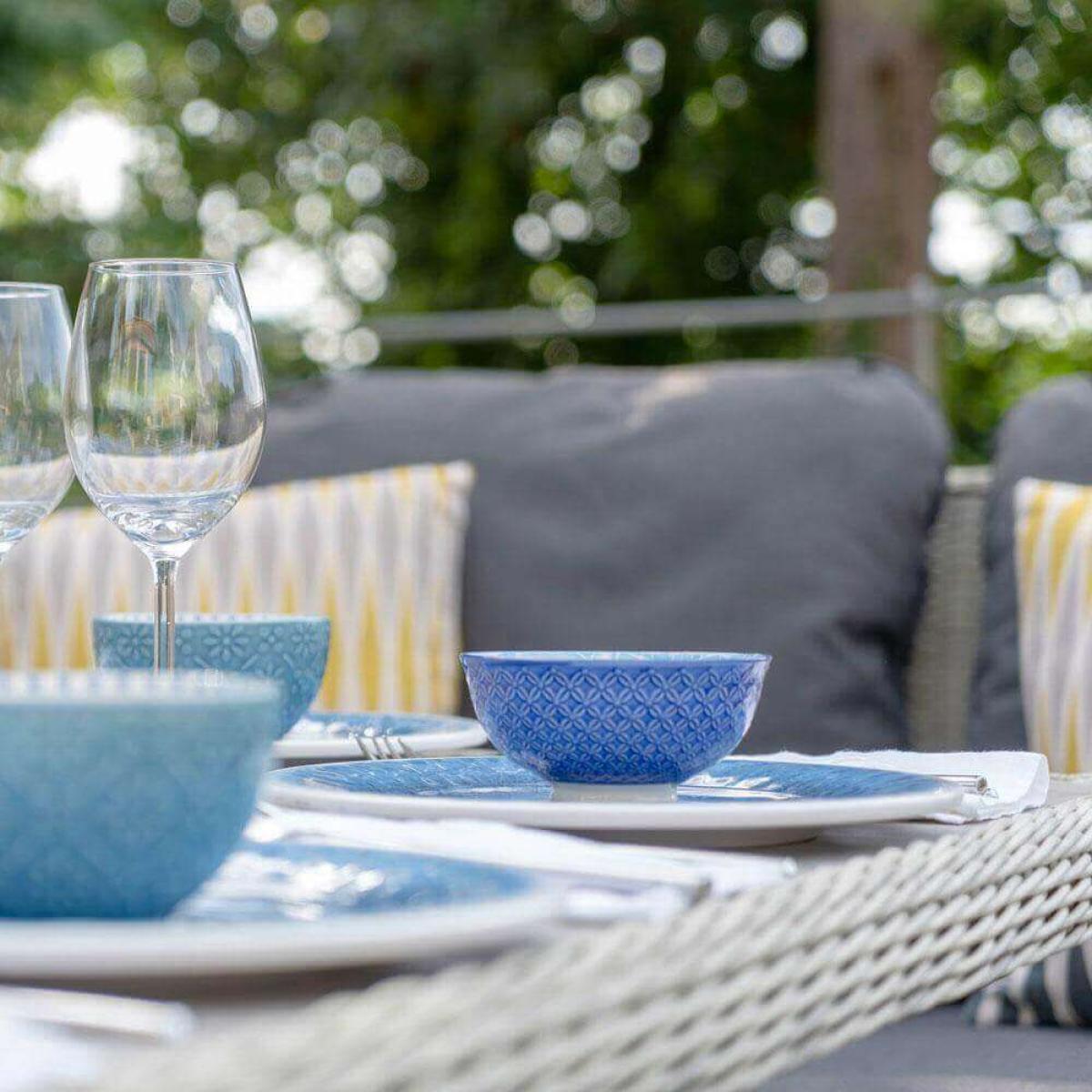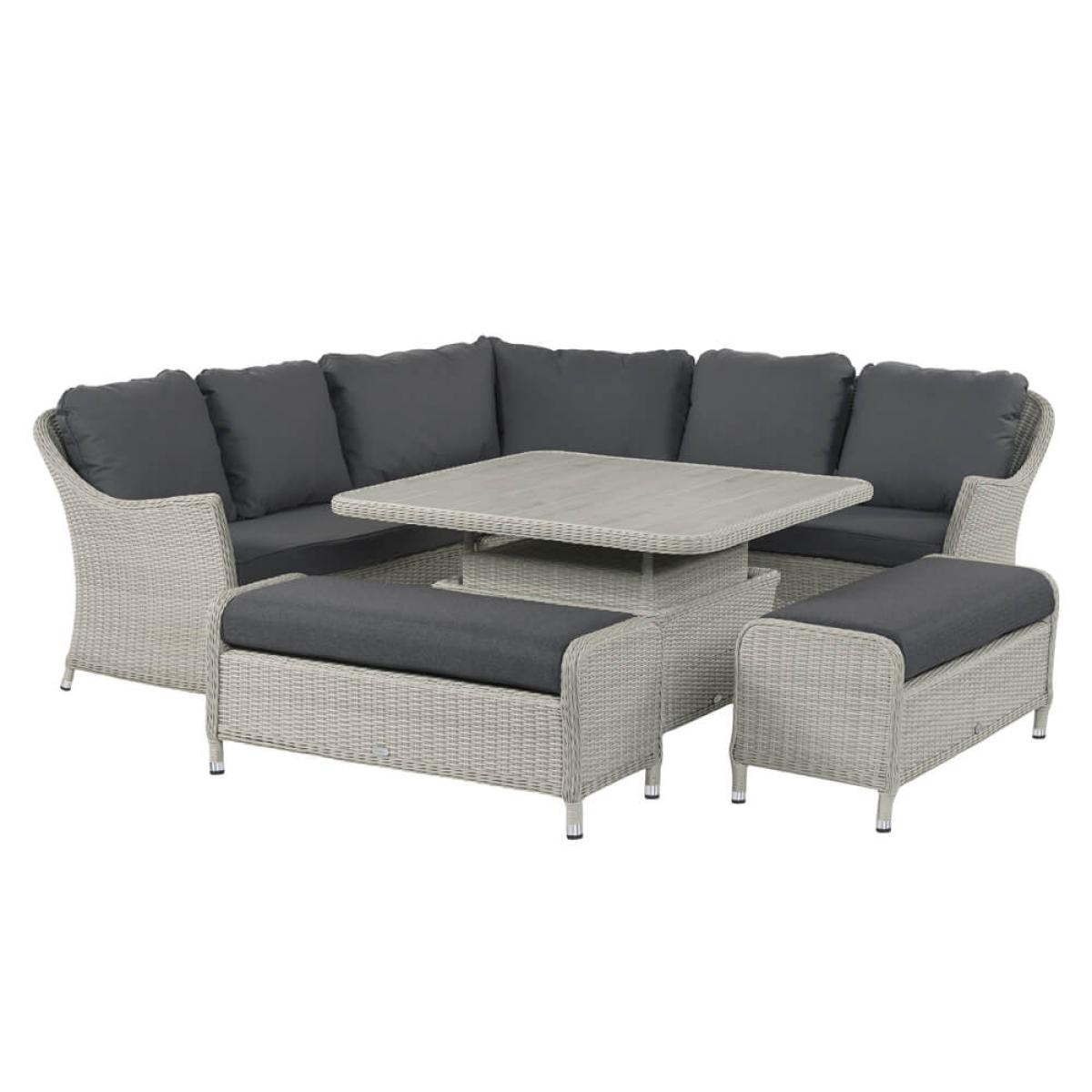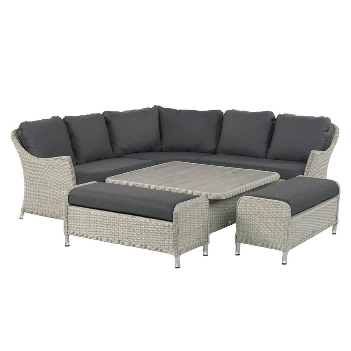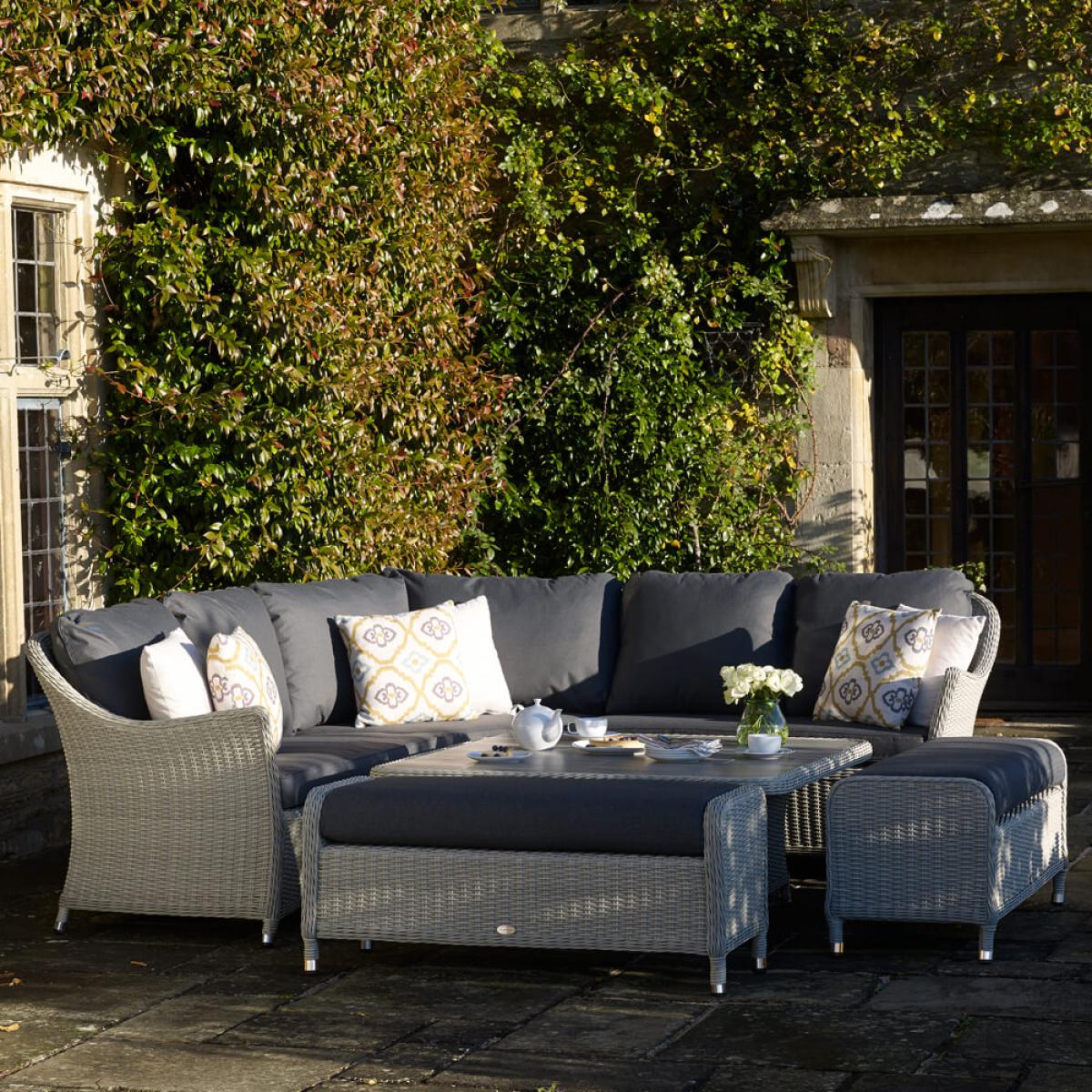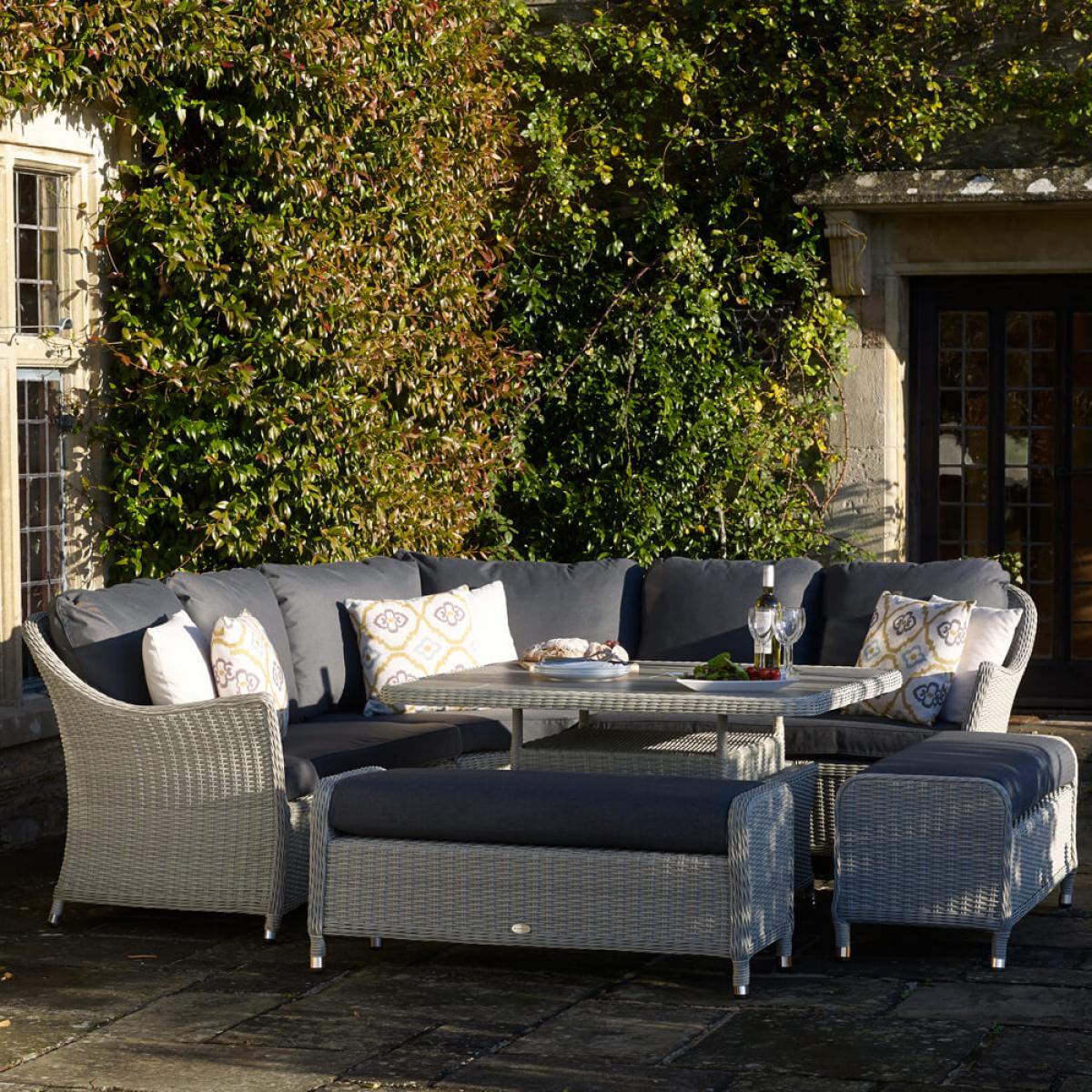 Set consists of:. About. The ultimate combination of comfort and style, this Bramblecrest Monterey Outdoor Sofa Set provides seating for up to 8 people. This collection of garden furniture consists of an adjustable square dining table that can be easily raised and lowered, a hard-wearing ceramic tabletop protector, an attractive modular sofa, and 2 sleek benches. All seating comes with charcoal shade cushions that are season-proof and shower, frost and stain resistant. This Bramblecrest garden furniture is ready for the elements owing to its rattan weave construction, a fibre that’s completely repellent against moisture. However, to best protect this set during the winter months a. Protective cover. Is worth considering, see details beneath the key features below. The cushions are fine to deflect showers butduring the wetter and colder winter months, and in prolonged bad weather, we recommend the cushions are kept indoors or in an. Outdoor cushion storage box. Now available as an attractive. Sandstone shade. Set, too. Bramblecrest Monterey Outdoor Sofa Set key features. :. Further protect the integrity and finish of your furniture with a Bramblecrest protective cover set that has been designed to specifically fit this set, follow the link below to be take to this. Sold separately:.