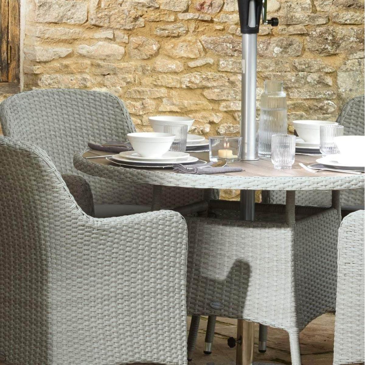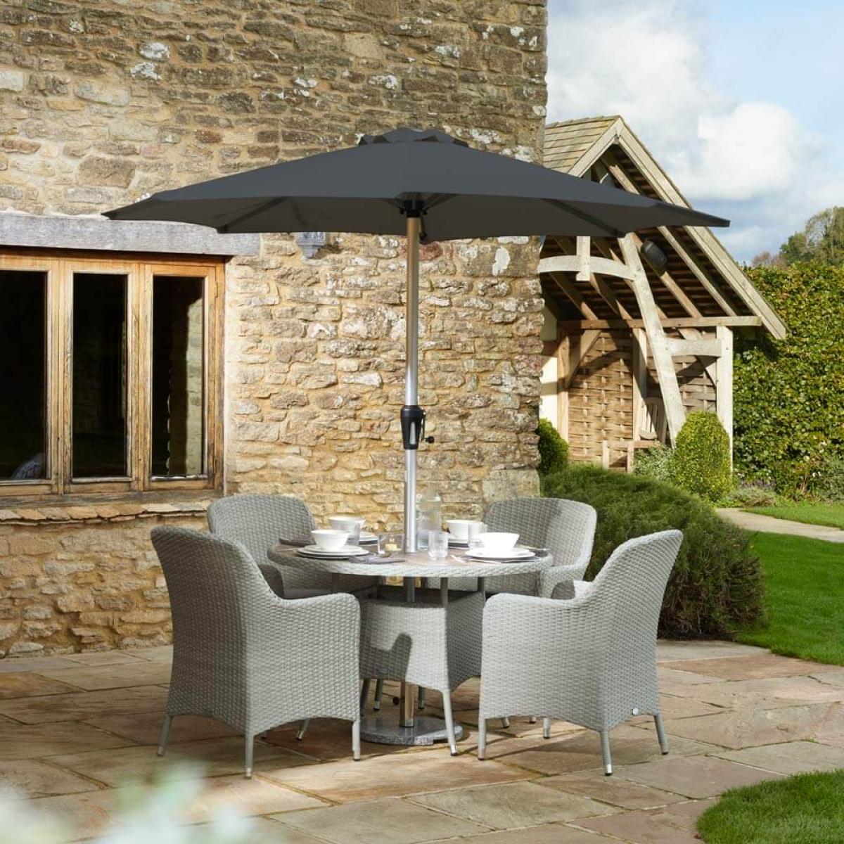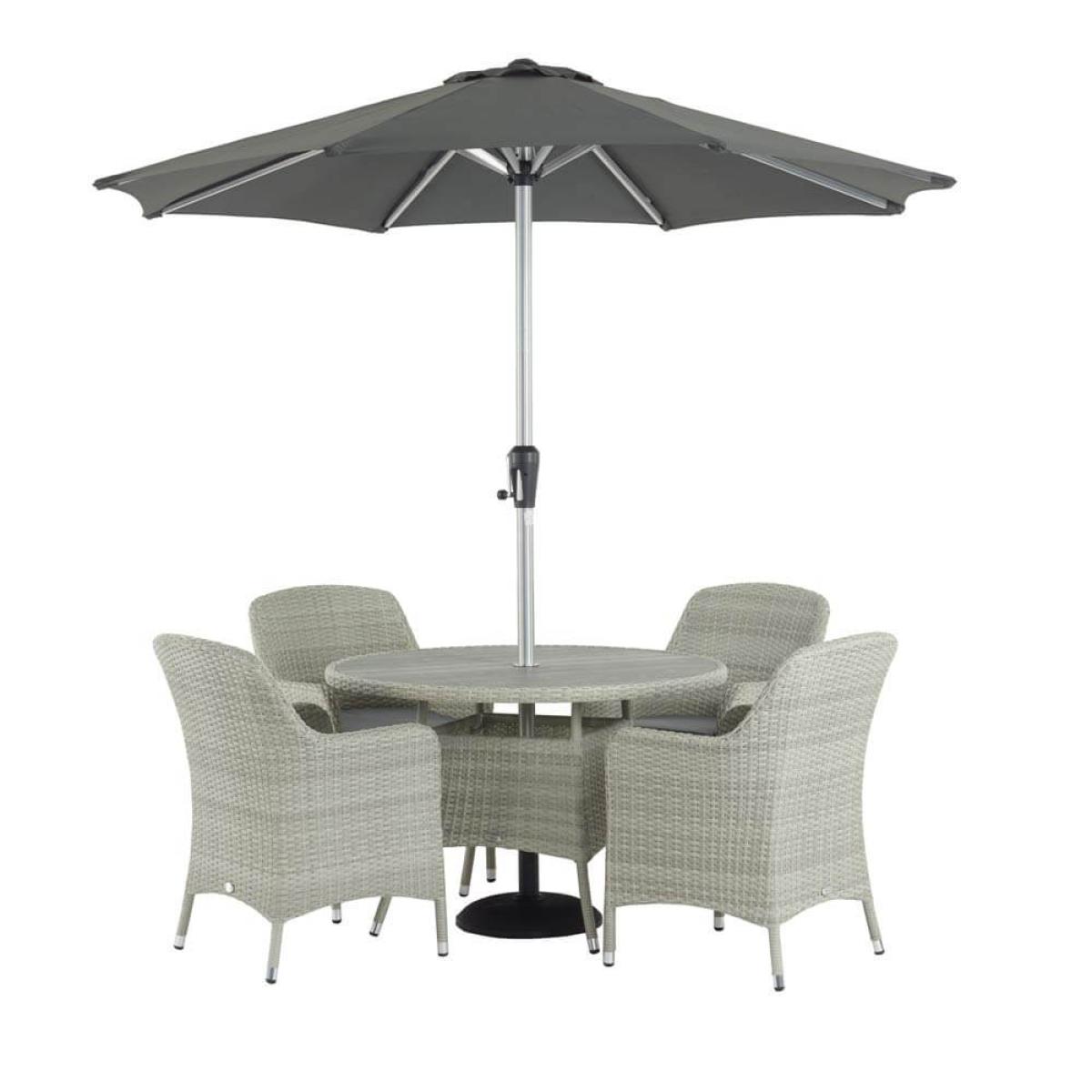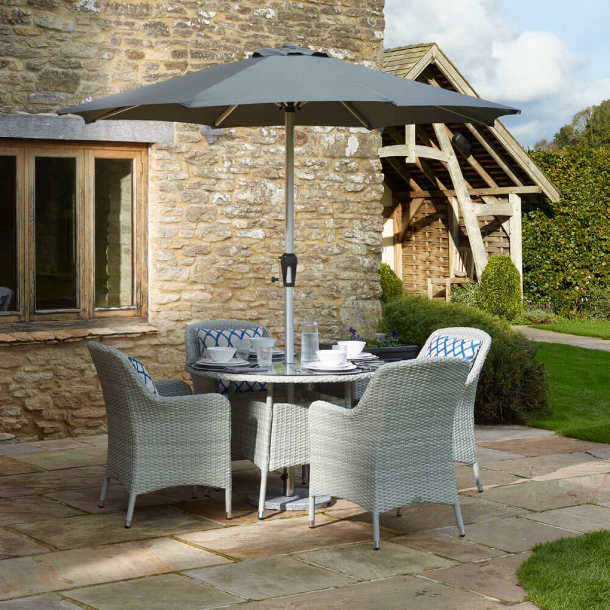 Bramblecrest Tetbury 4 Seat Round Table Set consists of:. About. Ensure easy hosting and dining this year with the 2021 Bramblecrest Tetbury 4 Seat round Dining Set, with Parasol. This elegant 4 seat garden table set will easily cater to garden gatherings with family and friends. This durable garden furniture is made from an extremely tactile and climate-resistant rattan weave, a material built with unpredictable weather in mind. The set is constructed from fully recycled materials which also ensures it is very lightweight for hassle free moving around the garden. To best protect this set during the winter months protective covers are worth considering, see details of these beneath the key features below. The Bramblecrest Tetbury range offers a number of functions and features that set it apart from other rattan garden furniture. It’s slimmed down design and lighter aluminium frame add to the ease of mobility, whilst the season-proof cushions included are new eco-produced models, they’re made almost completely from recycled bottles. The cushions are backed with a proofing liner so to limit water ingress and as a result can deal with light showers easily, however, we do recommend storing during heavy prolonged rain and the winter months to maintain their integrity for longer. The recessed tree-free tabletop is a resistant and attractive surface to dine from, this wood feel material is made from a synthetic composite that’s durable and easy to clean. A 2. 5 metre diameter parasol is handily operated by a crank handle, its concrete base weighs 15kgs for ample stability. Bramblecrest Tetbury 4 Seat Outdoor Dining Set key features:. Parasol key features:. Further protect the integrity and finish of your Bramblecrest Set with a Bramblecrest protective cover made from durable weather resistant polyfibre that has been designed to specifically fit this set, follow the link below to be take to this. Sold separately:.