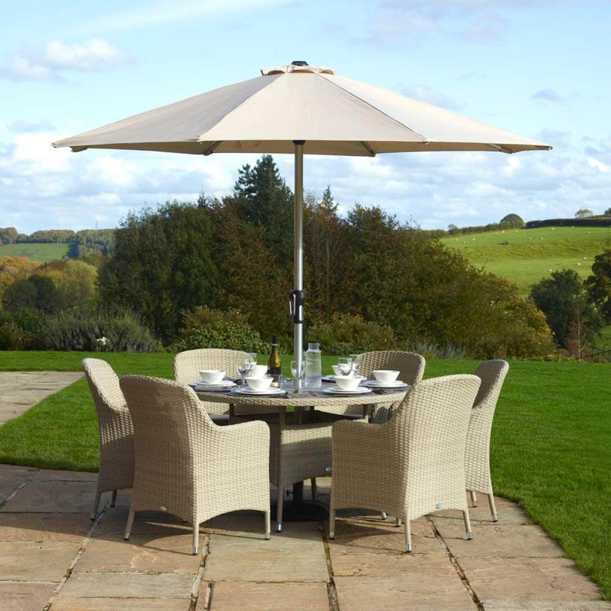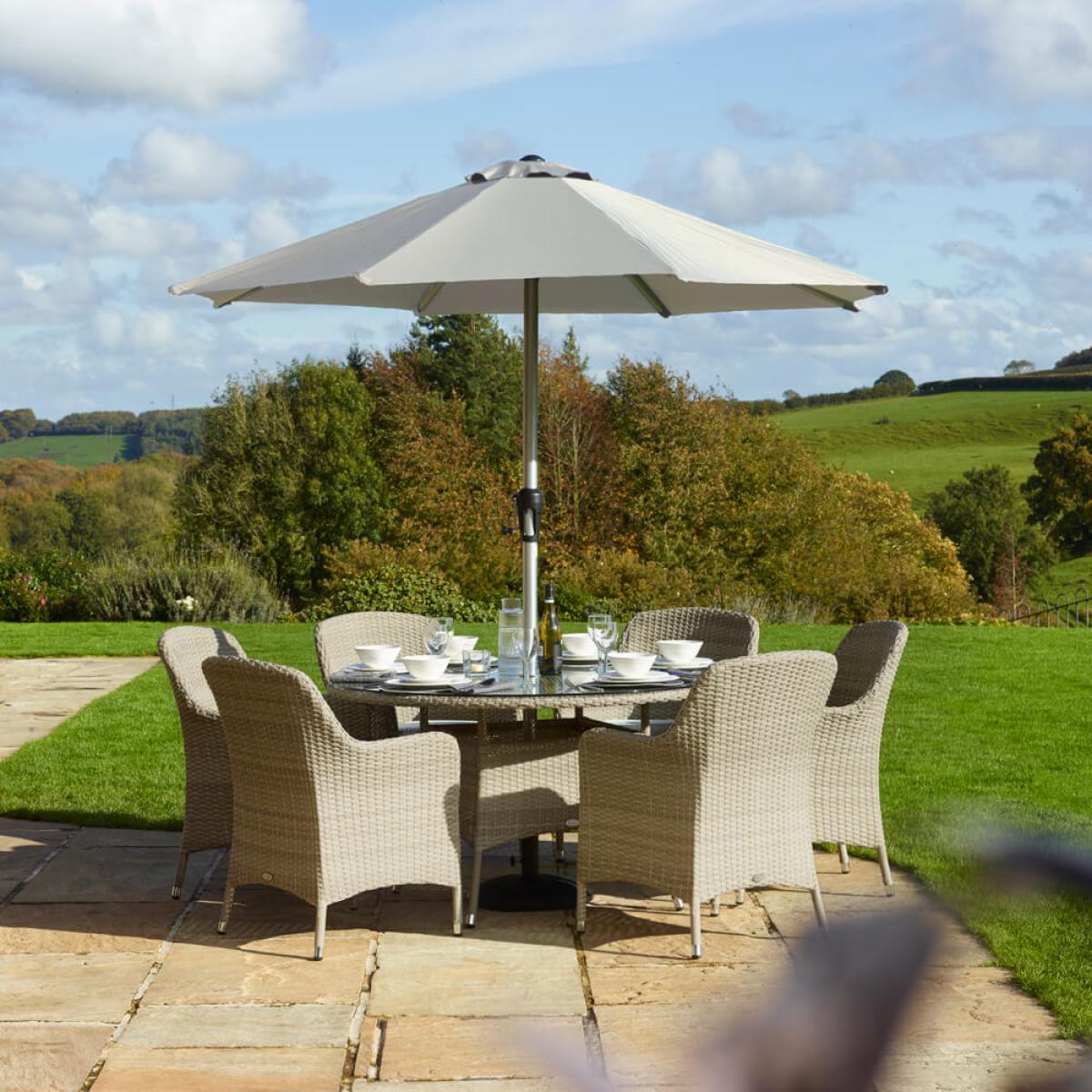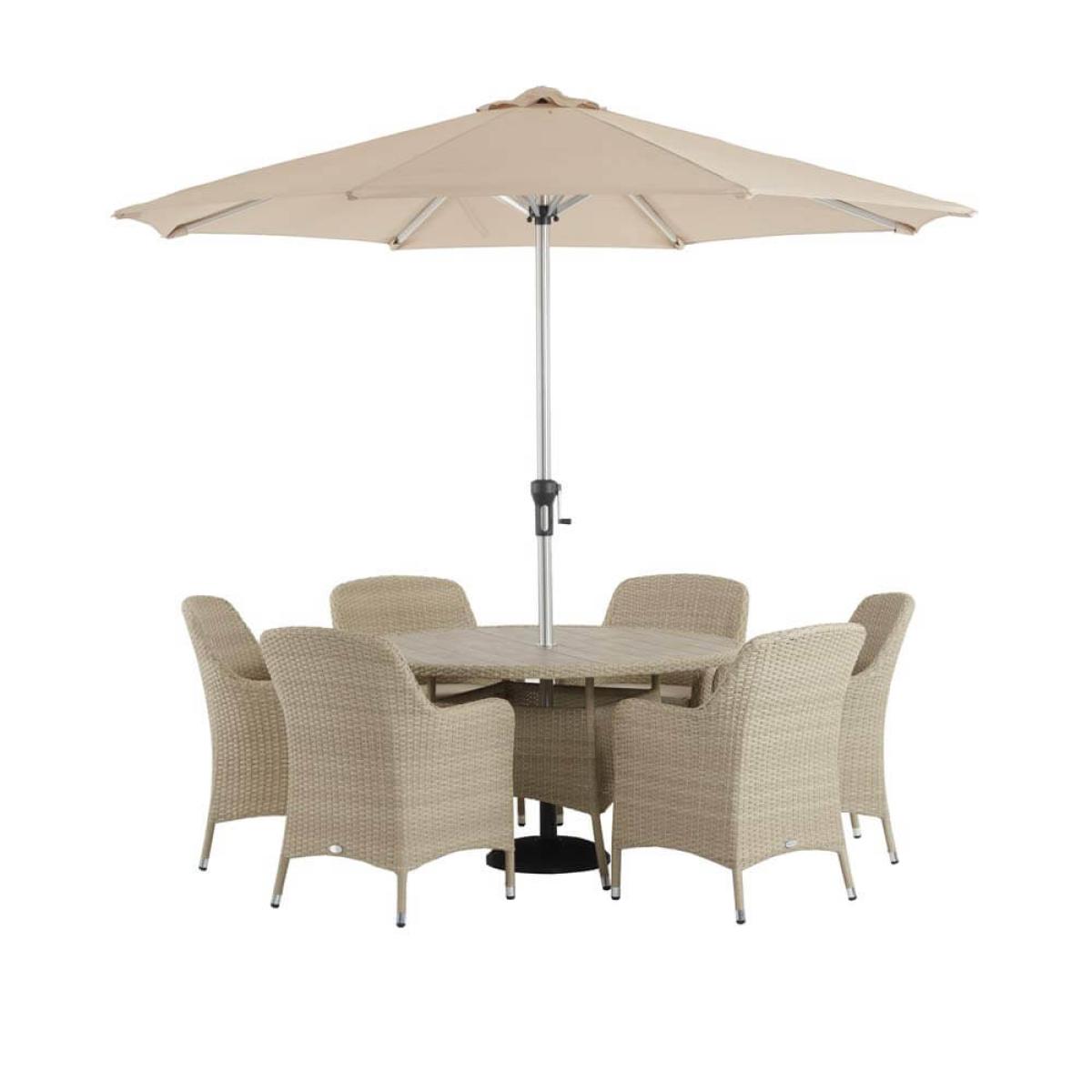 Bramblecrest Tetbury 6 Seat Round Table Set consists of:. About:. Boost your garden hosting with this appealing Bramblecrest 6 seat garden dining set. This chic and stylish outdoor dining option effortlessly fits increased seating into a relatively compact space. The round table is a diameter of 135cm with a tabletop constructed from a unique attractive ‘tree-free’ slat tabletop that’s not only great looking but maintenance free, this wood feel material is a synthetic composite that’s durable and easy to clean that’s incredibly durable and resistant to marking. The entire construction of this outdoor dining set is largely made from recycled materials. This extremely sturdy and climate treated synthetic rattan furniture is ready to stand up to the elements owing to an integral repellency to moisture. However, to best protect this set during the winter months protective covers are worth considering, see details of these beneath the key features below. The Season-Proof Eco Cushions are rain shower, frost and staining resistant. We recommend storing these cushions for the duration of the winter for best care. This lightweight garden furniture can easily be moved around the garden owing to its strong but agile aluminium frame, it will also never rust. The only notable weight comes with the 15kg Parasol base, anchoring down a sand coloured 3 metre diameter Parasol that’s crank handle operated for convenient shade coverage on warmer days. The 6 rattan armchairs included are high backed with styled and modern curved armrests for optimum comfort. Bramblecrest Tetbury 6 Seat Outdoor Dining Set key features:. Parasol key features:. Further protect the integrity and finish of your garden dining set with a Bramblecrest protective cover set that has been designed to specifically fit this set, follow the link below to be take to this. Sold separately:.