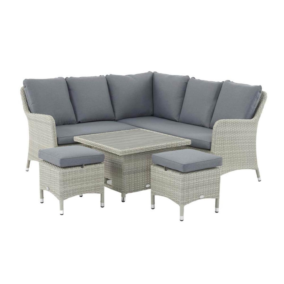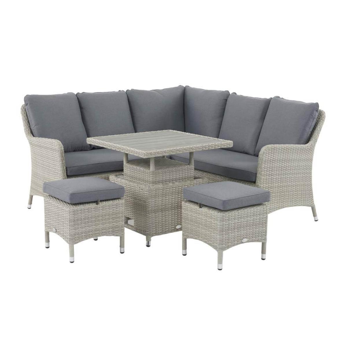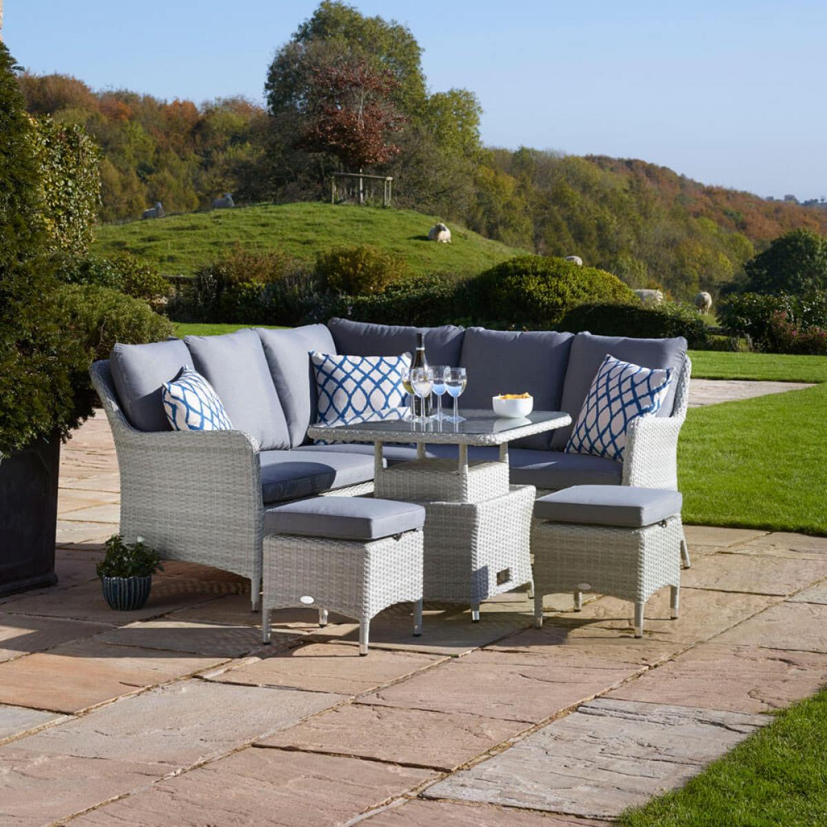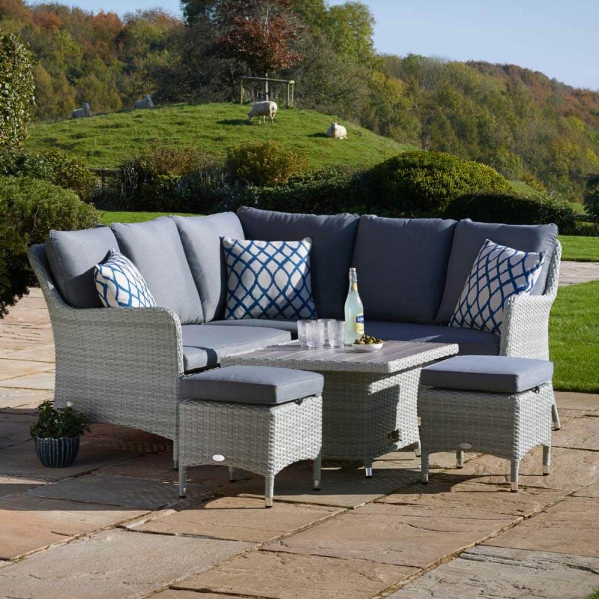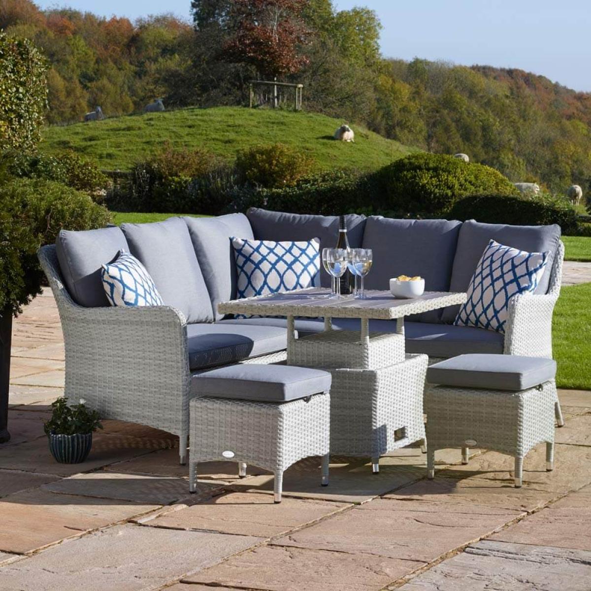 Bramblecrest Tetbury Mini Adjustable Table Set Consists Of:. About:. The Tetbury collection comprises of quality garden sofa sets, patio dining sets, bistro sets and reclining chair table combinations, all featuring a rattan weave construction that is smooth and durable. Rattan garden furniture is unique in that it can be left to the elements owing to its inherent repellency to moisture. Although to best protect this set during the winter months protective covers are worth considering, see details of these beneath the key features below. This set comprises of a modular corner settee and two stools and a handy adjustable table, lower for casual nibbles/drinks and elevate to dine off. It’s a perfect addition to the garden for hosting drinks with friends, or having the family over. An attractive ‘tree-free’ slat tabletop is not only great looking but maintenance free, this wood feel material is actually a synthetic composite that’s durable and easy to clean The Season-Proof Eco Cushions are made from nearly 100% recycled plastic bottles. The complementing dark grey colour season-proof cushions are shower resistant, as well as resisting frost and staining, too. We do still recommend storing these cushions during winter months to best increase their life span. This appealing outdoor sofa set has strong aluminium frames that retain stability but also allows nice and easy moving about the garden. The neutral cloud grey colour of the rattan ensures easy matching with many gardens. Key features of this Bramblecrest Tetbury Garden Sofa Set:. Product specific hard-wearing winter resistant protective covers are also available to fit this particular set, find this below:.