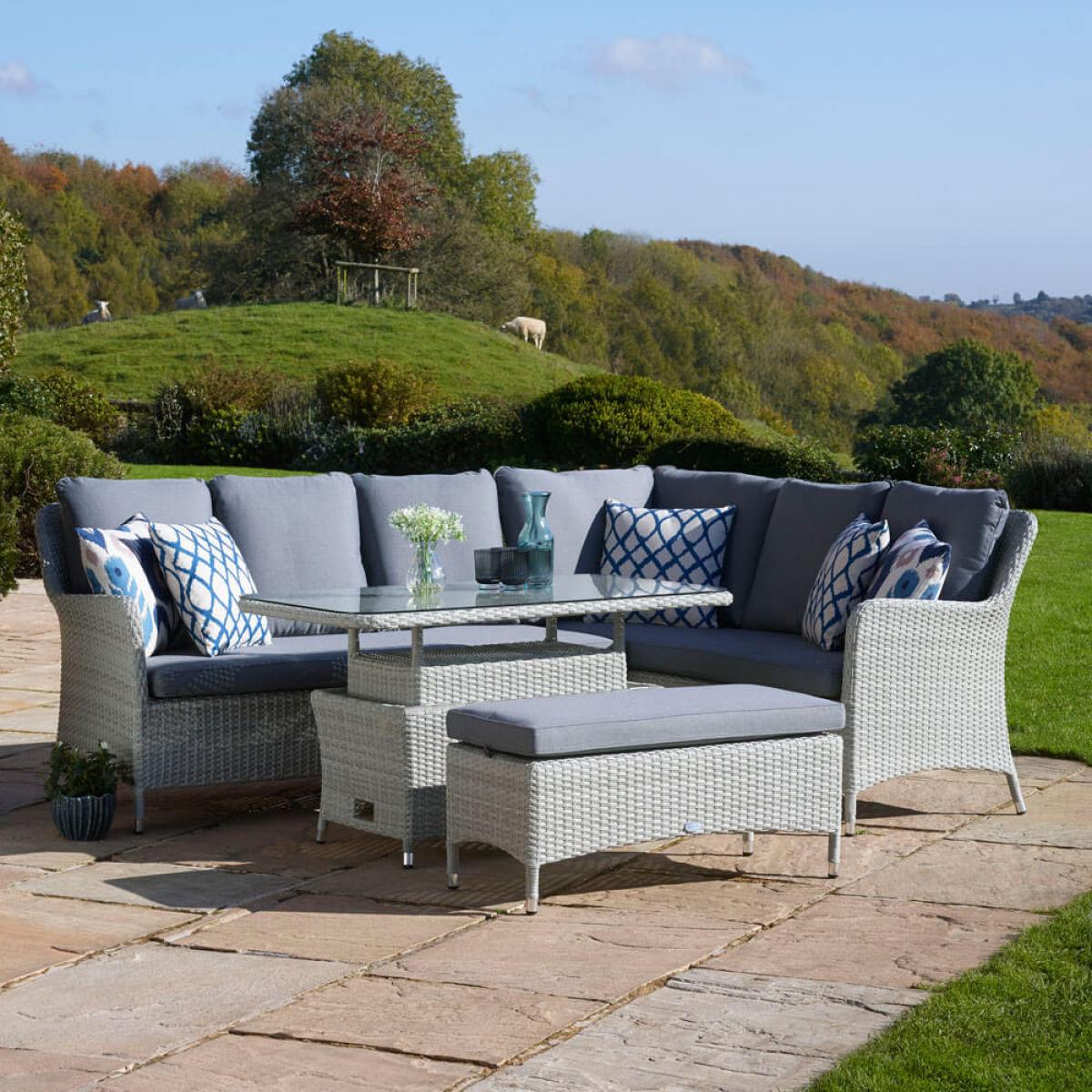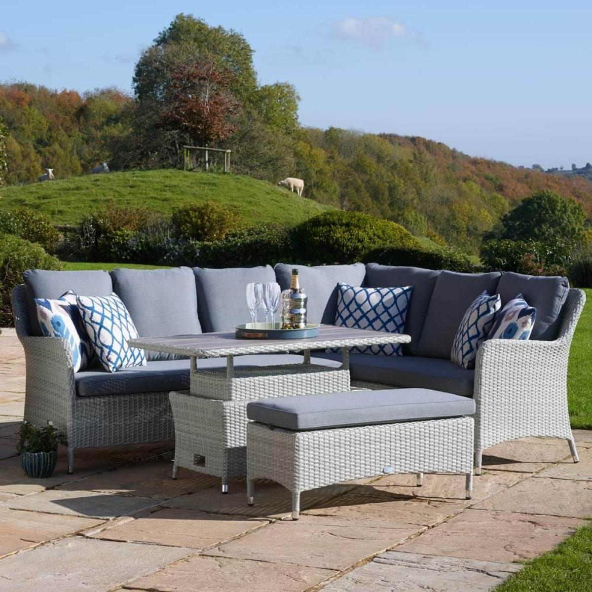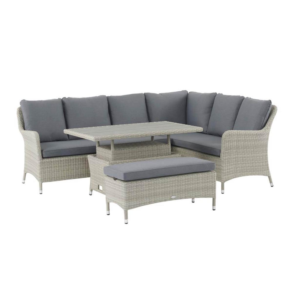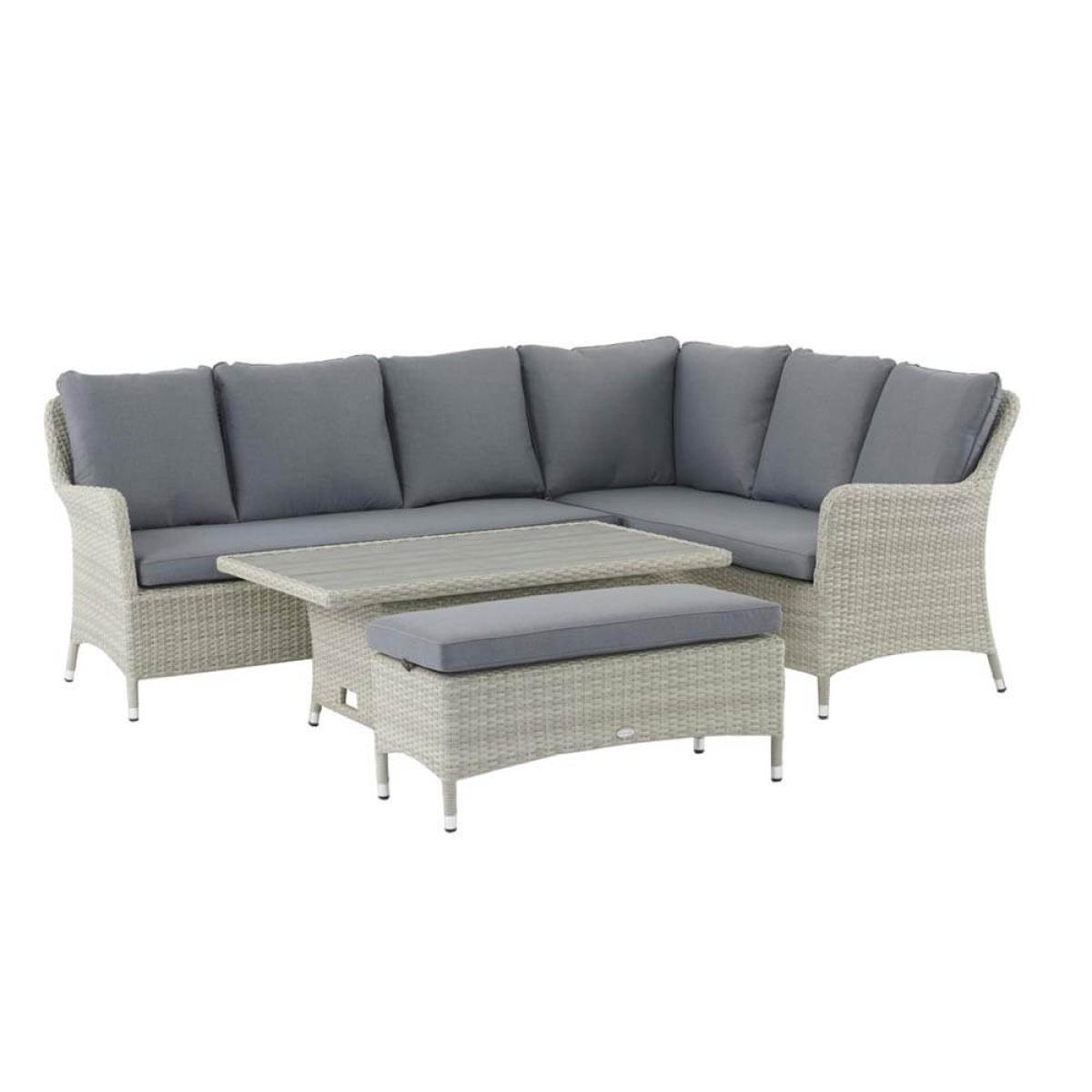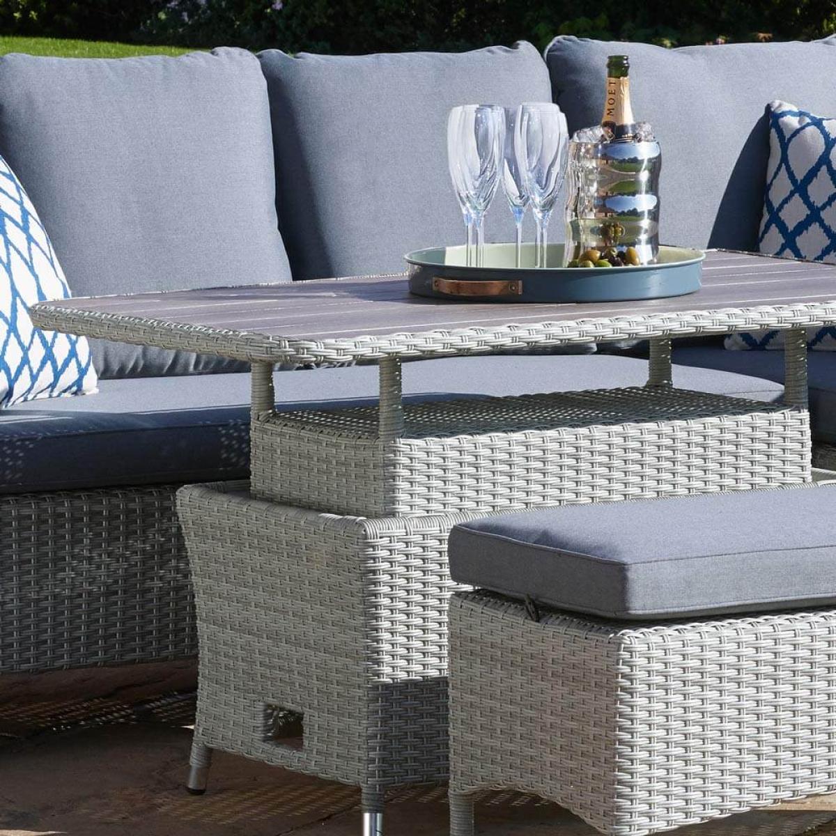 Bramblecrest Tetbury Rectangle Adjustable Table Set Consists Of: 1 x 2021 Bramblecrest Tetbury Modular Sofa with Pebble Grey Season-Proof Eco Cushion Set- Cloud 1 x 2021 Bramblecrest Tetbury Rectangular Adjustable Dining Table with Tempered Glass Top - Cloud 1 x 2021 Tetbury Casual Dining Bench including Eco Grey Season-Proof Cushion - Pebble GreyAbout:. Bramblecrest's fantastic 2021 Tetbury collection brings a raft of beautiful features and looks there's much to enjoy this time around. It's a selection of rattan garden furniture that retains integral quality in its craftsmanship and doesn’t compromise on style all while remaining at a steady price point. This Bramblecrest Tetbury Outdoor Sofa Set with Adjustable Rectangle Table brings enviable comfort into the garden with a spacious corner modular sofa. With the addition of the included independent dining bench this garden dining set will seat 7 diners. Perfect for a get together with friends or family. You won’t need to worry during the more challenging weather days either the smooth weave rattan is built to endure the elements. However to best protect this set during the winter months protective covers are worth considering see details of these beneath the key features below. Tasteful curved edges for armrests and soft corners make this truly modern outdoor furniture. The real crowd pleaser comes with the adjustable table simply elevate for dining and then lower again for casual occasions. This handsome table top is made from tempered glass so remains sleek yet is extremely durable and is easy maintenance. The plump seating season-proof cushions are made from almost 100% recycled plastic bottles these are shower resistant frost resistant and will resist staining. We just recommend storing these cushions during the winter months for best care. The cloud grey colour of the rattan nicely complements the darker pebble grey of the eco cushions we think the shade of this Bramblecrest garden furniture maintains useful neutrality it’ll fit into many patios or gardens easily. The lightweight aluminium frame offers stability but also allows for easy lifting. Bring on the sunnier days!This 2021 Bramblecrest Tetbury Garden Sofa Set features: Adjustable table means elevate tabletop for dining and lower again for casual use Lightweight aluminium frame construction means easy moving around the garden Sofa and independent bench setup allows up to 7 seated Stylish curved and soft edges gives a contemporary aesthetic Eco season-proof cushions nearly 100% made from recycled plastic bottles resists light showers UV and stains (store indoors for winter) Tempered glass tabletop is durable anti-marking and easy-wipe clean Neutral colour scheme means will suit many garden arrangement. Further protect the integrity and finish of your furniture with a Bramblecrest protective cover set that has been designed to specifically fit this set follow the link below to be take to this. Sold separately: Bramblecrest Tetbury Rectangle Modular Sofa Set Protective Cover Set