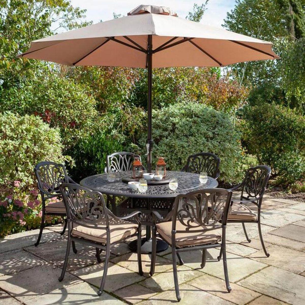 Set consists of: 1 x 2021 Hartman Amalfi Round Dining Table - Bronze 1 x 2021 Hartman Amalfi Lazy Susan - Bronze 6 x 2021 Hartman Amalfi Dining Chairs with Weatherready® cushions - Bronze/Amber 1 x 2021 Hartman 3m diameter Parasol - Amber 1 x Parasol BaseAbout:. An attractive yet practical garden furniture set the 2021 Hartman Amalfi 6 Seat Round Dining Table Set comes with 6 outdoor dining chairs with Weatherready® cushions. Whilst these cushions are equipped to repel light showers anything heavier will simply pass through the permeable layers drying naturally over time - local conditions dependent for best care store these cushions inside during the winter months. The set also comes with a large parasol that has been designed to stand in the centre of the table while being held in place by a 15kg weighted base. The round Hartman Amalfi outdoor dining table also comes with a matching rotator tray (or Lazy Susan) that's a considerable diameter of 61cm so it is easy for those sitting on one side of the table to pass things over to those sitting on the other. Best protected from the ravages of winter weather with a: Hartman Cast Aluminium 6 Seat Round Set Protective Cover