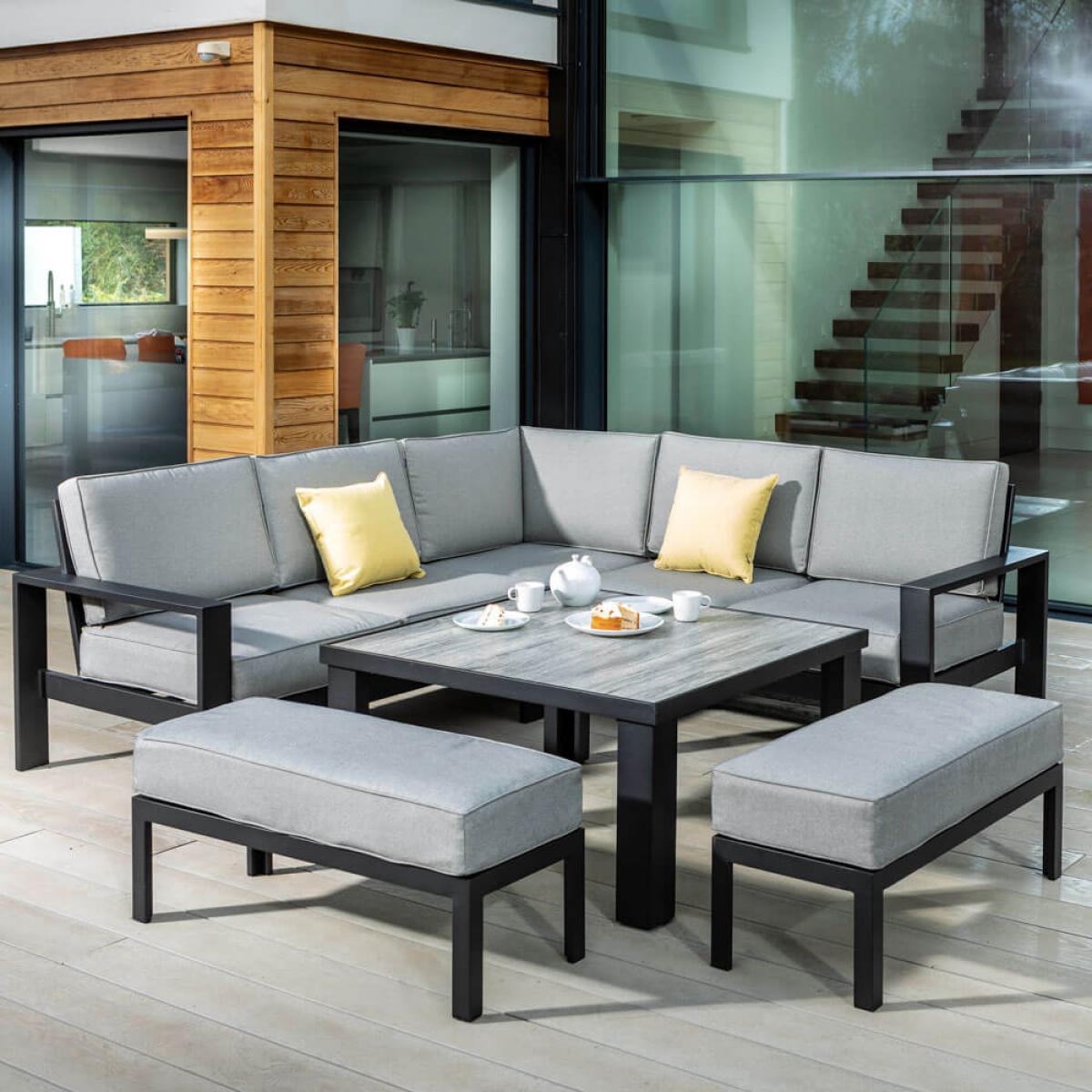 Set consists of:. About:. Introduce an air of modern sophistication and comfort to your outdoor space or conservatory with the effortlessly cool Hartman Apollo Square Casual Dining Set. Apollo marks a new range for the renowned garden furniture masters; Hartman. We think this sleek modern garden furniture will undoubtedly impress your guests with a number of pleasing features. Soft and enjoyably spongey Weatherready® cushions come in a versatile pewter grey, meaning this patio dining set will fit into many outdoor settings. These cushions will repel light showers and flash downpours, and in heavier downpours these allow water to pass completely through the purposely permeable inner layers, exiting with gravity through the high-quality upholstery’s underside. Store these during winter months for best care. A sturdy but incredibly lightweight aluminium frame is given a tasteful carbon colour powder coating, that gives the frame an appealing finish and helps preserve the metal. This attractive garden furniture set seats 8 people with a garden corner sofa and two independent benches. Benches that are made from the same robust aluminium and topped with the same deep fill cushions. This casual garden dining set oozes a refined style, demonstrated best by the sleek table. The surface of the low rise garden table, 64cm, is a lavish Tuscan ceramic glass that’s very easy to clean and hugely durable. Whether serving aperitifs and cocktails, mezze platters or simply cake and biscuits this stylish casual outdoor dining set will be the setting for great memories made in the garden or conservatory. Hartman Apollo Square Casual Garden Dining Set Key Features:. Further protect your Apollo Square Casual Garden Dining Set with the durable lined polyester specific fitting Hartman protective covers, click below to be taken to the specific cover for your furniture.