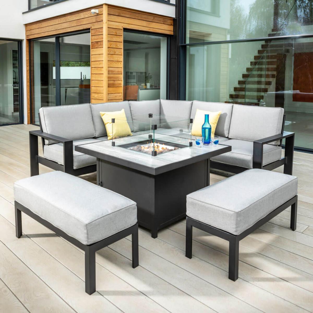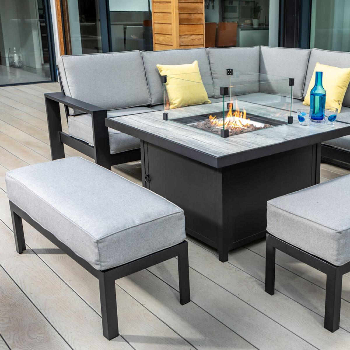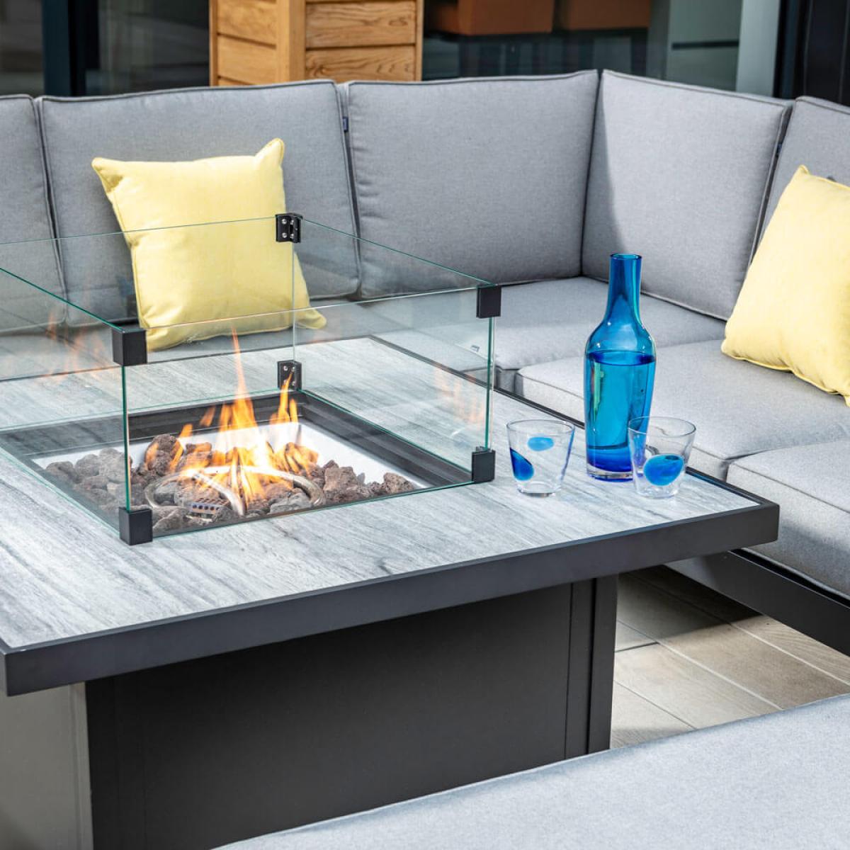Set consists of:. About:. Extend those summer evenings for yourself and guests in spacious comfort and warmth. The Apollo Square Causal Gas Fire Pit Table Dining Set marks an exciting new addition for loved garden furniture brand Hartman. An inbuilt gas fueled firepit pleasingly appears through the centre of the dining table, ensuring warmth and a flickering spectacle. A handy four sided glass guard protects the seated from over exposure, and the naked flames from any wind. The gas propane tank is easily connected and disconnected beneath the table with a wheel mounted extractable base, and hidden by a small hinged opening. To ignite the fire ring, simply turn the gas gauge found on the side of the table and push the igniter button. Surrounding the fire pit is a sizeable tabletop made from a high quality Tuscan ceramic glass, finished in a grained pewter tone which agreeably matches the upholstery and retains durable properties. This garden corner sofa set offers exceptional comfort with deep space to sit and recline into the thick and spongey cushions. This seat padding is equipped with Hartman’s Weatheready® microfibre function, which repels light showers and will simply allow heavier deluges to pass straight through the permeable layers. For best care store these in the winter months. A cast aluminium frame provides robust support, will never rust and is powder coated to preserve the finish in complementary carbon colour. This contemporary garden furniture really is as pleasing to look at as it is to sit upon. Two benches, with matching cushions, increase the number of seated to 8 people. This Apollo range represents a sleek and modern garden furniture option, and with attractively neutral colour palates, meaning it will fit into most outdoor settings with ease. With such warmth and comfort for the garden achieved this summer, you may well end up sitting outside into the early hours!. Key Features:. Further protect your Apollo Square Casual Garden Dining Set with the durable lined polyester specific fitting Hartman protective covers, click below to be taken to the specific cover for your furniture.