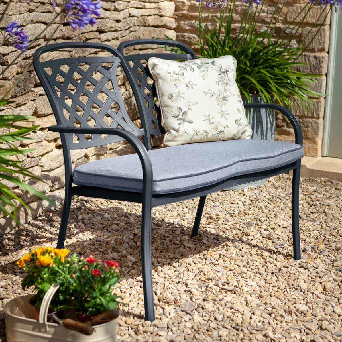 Consists of:. About:. Take a seat in amongst the tranquillity of the garden upon this 2 seater Berkeley Garden Bench by Hartman. This elegant patio bench is made entirely from cast aluminum and styled in a contemporary lattice design in a pleasingly neutral Antique Grey colour, perfect to insert into many garden plans. The very nature of cast aluminium garden furniture means integral resistance to the elements, this bench will happily last for the long run and still hold its looks. A 2 person seat cushion sits atop of this cast aluminium garden bench in a platinum grey that complements the shade of the metal and ensures spongey comfort. Unfavourable turns in weather won’t be a concern, this seat pad is Weatherready® equipped so will easily repel lighter showers. If caught in heavier, longer deluges the cushion will simply allow the rainwater to drain right the way through its permeable layers, passing through its underside in time,. Drying naturally in line with local conditions. We still do recommend storing this cushion during the winter months for best care, however. Versatility is key with this stylish garden bench, easily paired with much of the extensive Antique Grey choices of the wider Berkeley range. Hartman Berkeley 2 Seater Garden Bench With Cushion Key features:. Although cast aluminium furniture is by nature resistant and ready for the outdoors to best shield your furniture from tree debris, bird droppings or simply to keep it tidied away we recommend the use of a protective cover, below is a link to the specific fitting Hartman protective cover to be purchased separately:.