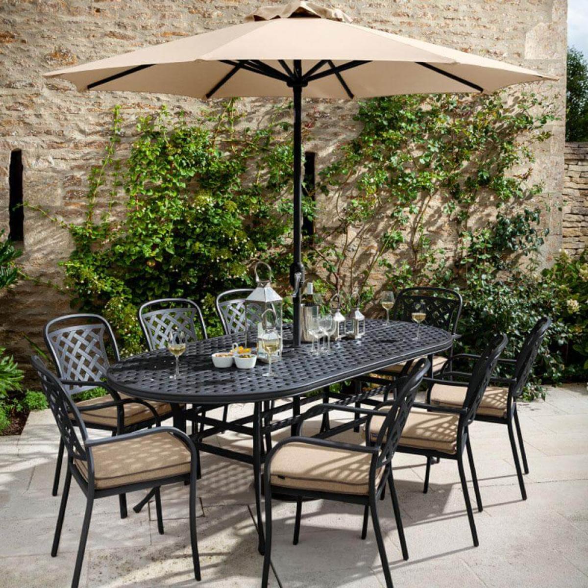 This Set consists of. :. About:. Comprised of a large oval-shaped dining table, 8 outdoor dining chairs with Weatherready® cushions, parasol, and a 15kg weighted base, this garden dining set belongs to the Hartman Berkeley collection. The table and chairs are made from cast aluminium, a metal that is ideal for patio furniture as it is not only hard-wearing and durable but lightweight too. The Weatherready® cushions that come with the outdoor dining chairs are made from an amber-coloured microfibre material that boasts light shower resistant properties, are extremely soft but also retain a layering system boasting permeable layers that allow heavy deluges simply to pass straight through the underside over time then,. Drying naturally – local conditions dependent, for best care store these cushions inside during the winter months. Hartman Berkeley 8 Seat Garden Dining Set With Oval Table key features:.
