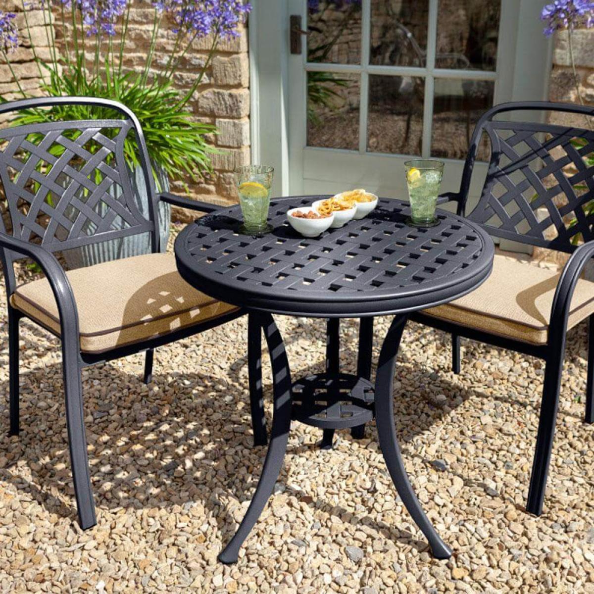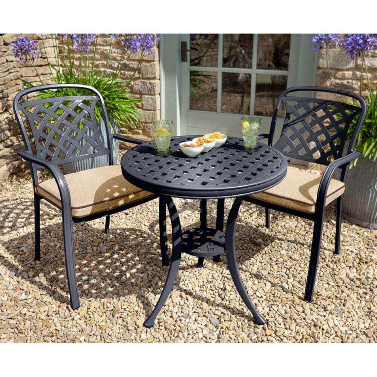Set consists of:. About:. Made from bronze-coloured cast aluminium, the Hartman Berkeley Garden Bistro Set comes with 2 outdoor dining chairs and a round bistro table. The Weatherready® garden chair cushions are made from a light shower resistant material that is easy to clean and maintain, the permeable layers built into these microfibre cushions simply allow heavier deluges to drain all the way through and out through the underside, drying in line with local conditions. Just store these in the winter months. Although cast aluminium furniture is by nature resistant and ready for the outdoors to best shield your furniture from tree debris, bird droppings or simply to keep it tidied away we recommend the use of a protective cover, below is a link to the specific fitting Hartman protective cover to be purchased separately:.