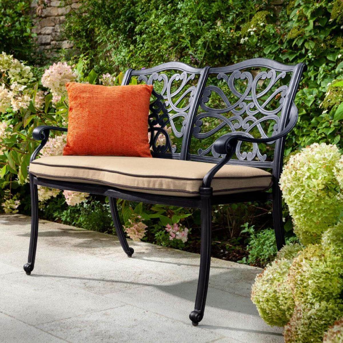 This Hartman Capri product consists of:. About:. Made from cast aluminium, the Hartman Capri 2 Seater Garden Bench is not only robust and hard-wearing but also easy to maintain and relatively lightweight. As much a decorative feature as a practical piece of outdoor furniture, the ornate pattern on the back of this garden bench exudes elegance but stops shy of veering into ostentatious. The amber colour of the Weatherready® cushion complements the overall aesthetic of the Hartman Capri 2 Seat Garden Bench by introducing a burst of colour that offsets the dark bronze aluminium. These cushions don’t only look the part either, they provide light shower resistance, and if caught in heavier deluges will simply dry off overtime due to a permeable layering interior, draining off through the cushions underside, local conditions dependent. Be sure to store this cushion in the winter months for best care. Although cast aluminium furniture is by nature resistant and ready for the outdoors to shield your set from tree debris, bird droppings or simply to keep tidy we recommend the use of a protective cover, below is a link to the specific fitting Hartman protective cover to be purchased separately:.