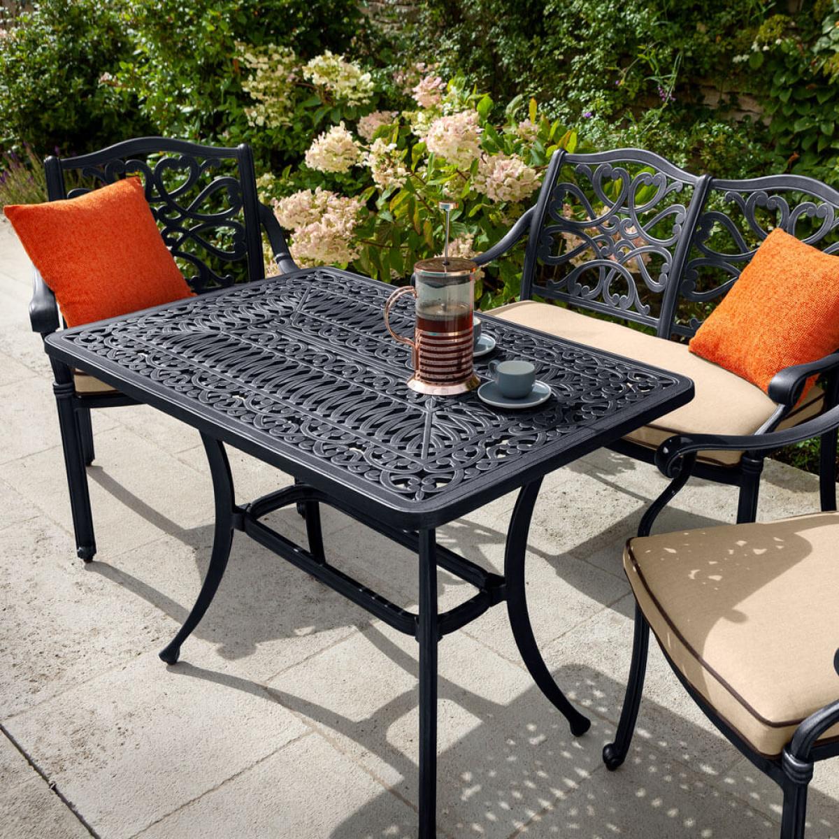 This 4 Seater Coffee Set consists of:. The Hartman Capri 4 Seater Coffee Set in Bronze/Amber will be a wonderful addition to any balcony, patio or lawn. This garden coffee set will serve as the perfect setting for mornings in the sunshine or some slow paced brunching. This 4 seat cast aluminium set boasts traditional design fused with modern touches. Classic curved design along with time honoured patterning are given a deep bronze. Cast aluminium also benefits from an inbuilt ability to deal with moisture and months in wet weather, naturally forming a barrier between the elements and the integrity of the metal. A. Small amount of maintenance. Will keep this traditional garden furniture in a great condition. The climate proofing doesn’t stop there either, Weatherready® cushions ensure that light showers will simply bead off. Any heavier rain will pass through the purposely porous layers, exiting through the cushions’ underside and drying naturally in line with local conditions. The seat padding comes in a complementary amber, we just recommend storing these in the winter for best care. Two dining chairs with wide supportive backs in trademark cast aluminium patterning is also echoed on the 2 seater bench.