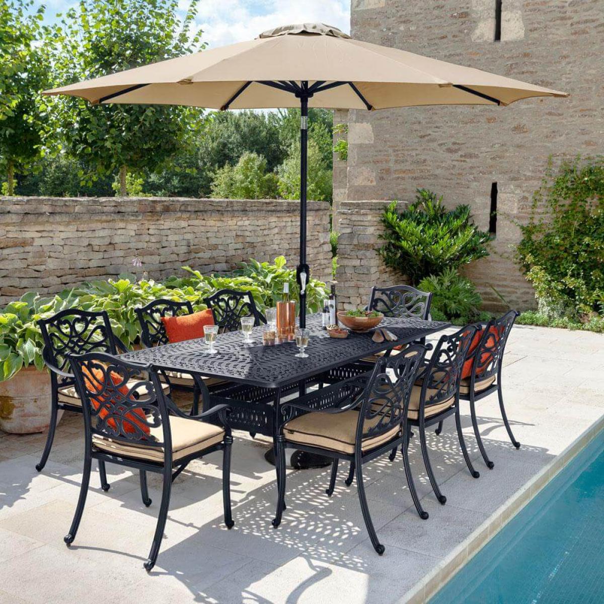 Set Consists of:. About:. Designed to allow its users to make the most of the glorious British summer, this 2021 Hartman Capri 8 Seat Garden Dining Set comes with a cast aluminium outdoor dining table, 8 matching dining chairs with Weatherready® Cushions cushions that repel light rain showers, UV and mildew. Whilst the Weatherready® cushions are equipped to repel light showers, anything heavier will simply pass through the permeable layers drying naturally over time – local conditions dependent, for best care store these cushions inside during the winter months. This set also comes with a 3 metre parasol, and a 15kg weighted base. The Hartman Capri dining chairs have a particularly elegant design on their backrests, which only stands out more when its bronze colour is set against a beautifully vibrant garden backdrop. The cast aluminium used to make the rectangular dining table and chairs isboth lightweight and hard-wearing, making it the perfect material for garden furniture such as these. Another fantastic choice of materials can be found in the faux leather cushions, which are not only easy to clean but water-resistant too. Although Cast Aluminium furniture is by nature resistant and ready for the outdoors to best increase the life of your furniture we recommend the use of a protective cover, below is a link to the specific fitting Hartman protective cover to be purchased separately:.