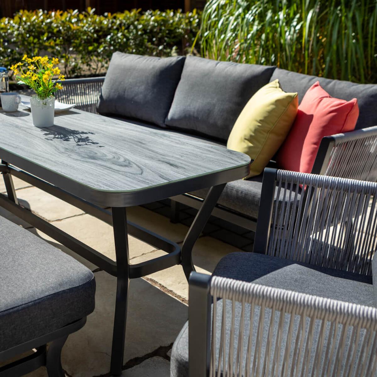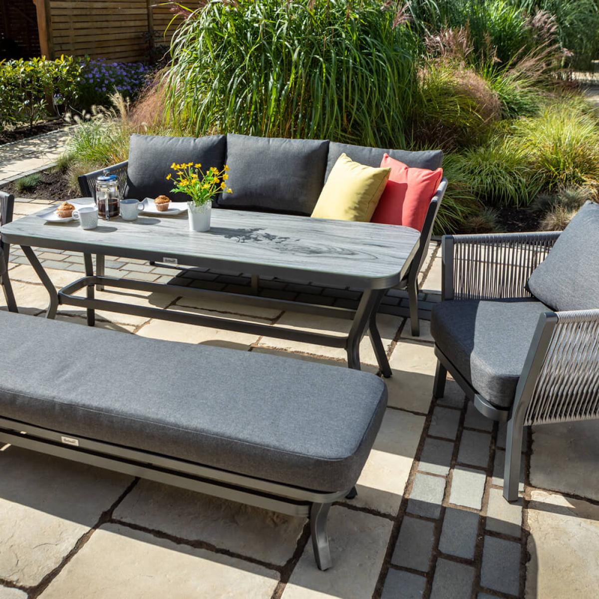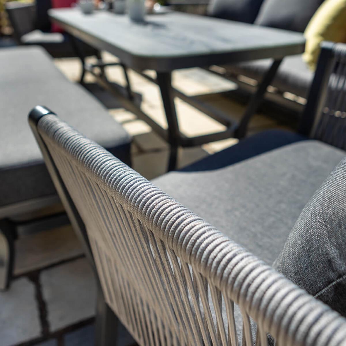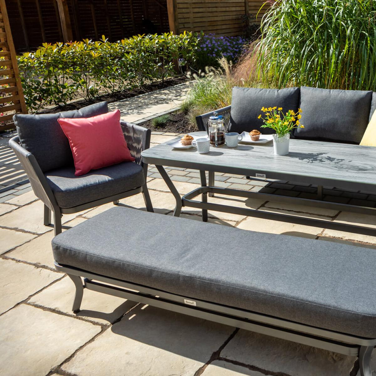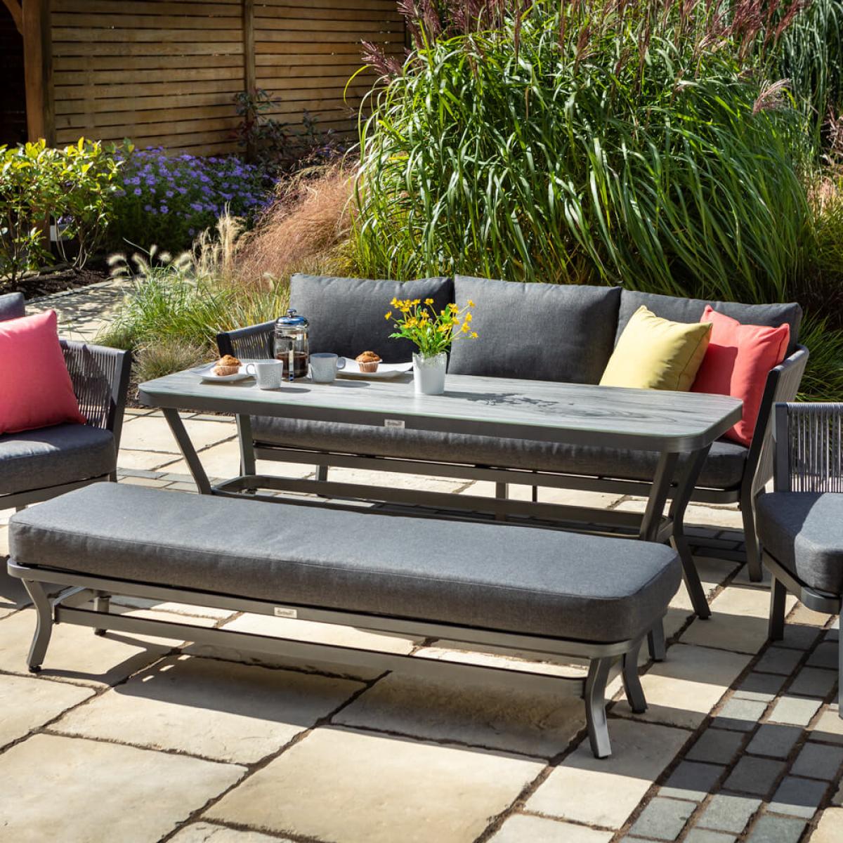 Set consists of:. About:. Celebrate freedom of expression in the garden this year with the freeform configuration of this Hartman Dubai Sofa Dining Set. New to Inside. Out Living, the Dubai range brings style and substance together in one modern package. The fabulous offerings from this collection will breathe modern style into any garden. The Hartman Dubai Rectangular Casual Dining Bench Set consists of three differing seat types for ultimate preference based positioning. Sun worshipping on your terms! This aluminium frame furniture takes all the sturdy structural benefits from traditional cast aluminium garden furniture, but hones it into a wonderfully sleek modern-art inspired design featuring more lightweight contemporary frames. There’s much to savour with this patio garden furniture, whether it’s the extremely lavish tempered Tuscan ceramic glass dining surface or the delightful finish of the powder coated metalwork and their playful angles. The table surface is anti marking and extremely easy to maintain – just wipe clean with a damp cloth. This garden dining furniture set has a spacious sofa that seats 3, the long dining bench also seats 3 people and at maximum capacity with the two dining arm chairs also in use this outdoor sofa set will accommodate 8 people. The chairs boast a unique panel design made from strung rope, a lovely quirk which will be sure to spark conversation. The table itself benefits from a slender design and a generous yet practical length of 170cm. Soft and extremely plump thick-set cushions are inviting and comfortable, these slate shade cushions benefit from Hartman’s Weatheready® system too. A technology that deflects light showers and flash downpours but allows heavier deluges to simply pass through the purposely permeable inner layers, draining through the underside over time and in line with local conditions. We do still recommend storing these cushions in the winter months, however. The neutral tasteful grey tone of this aluminium garden furniture will slot into many gardens with ease. And remember – get creative with the configuration!.