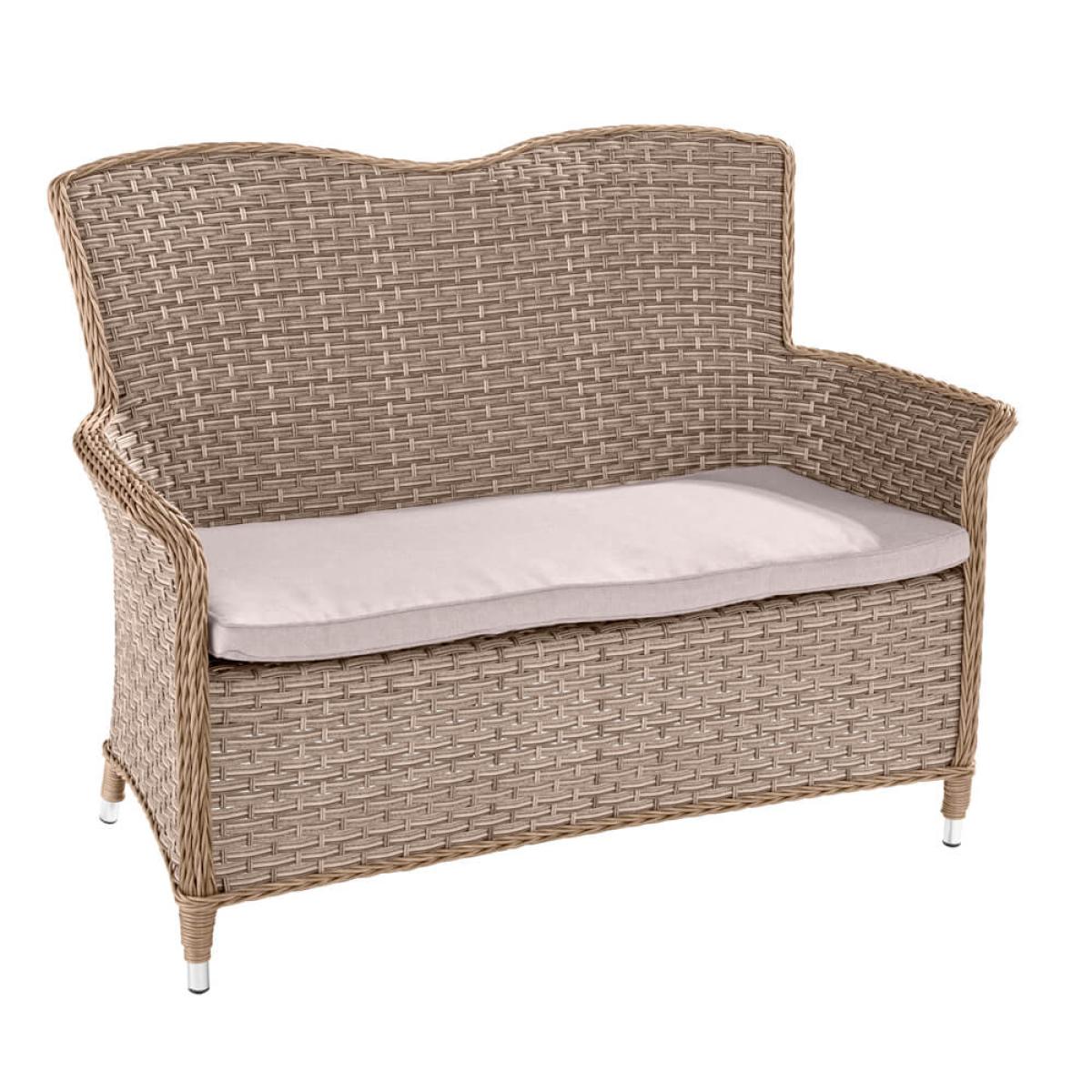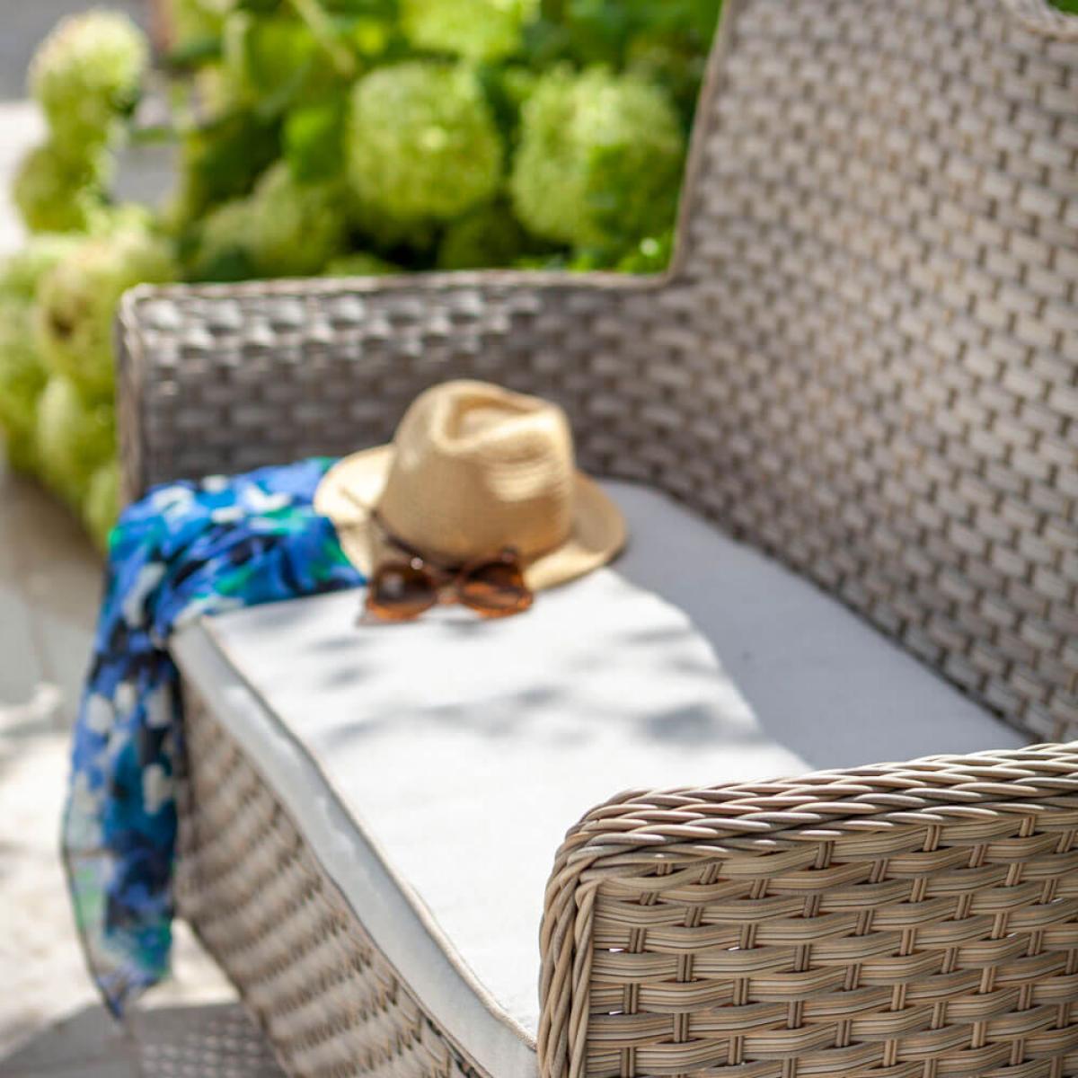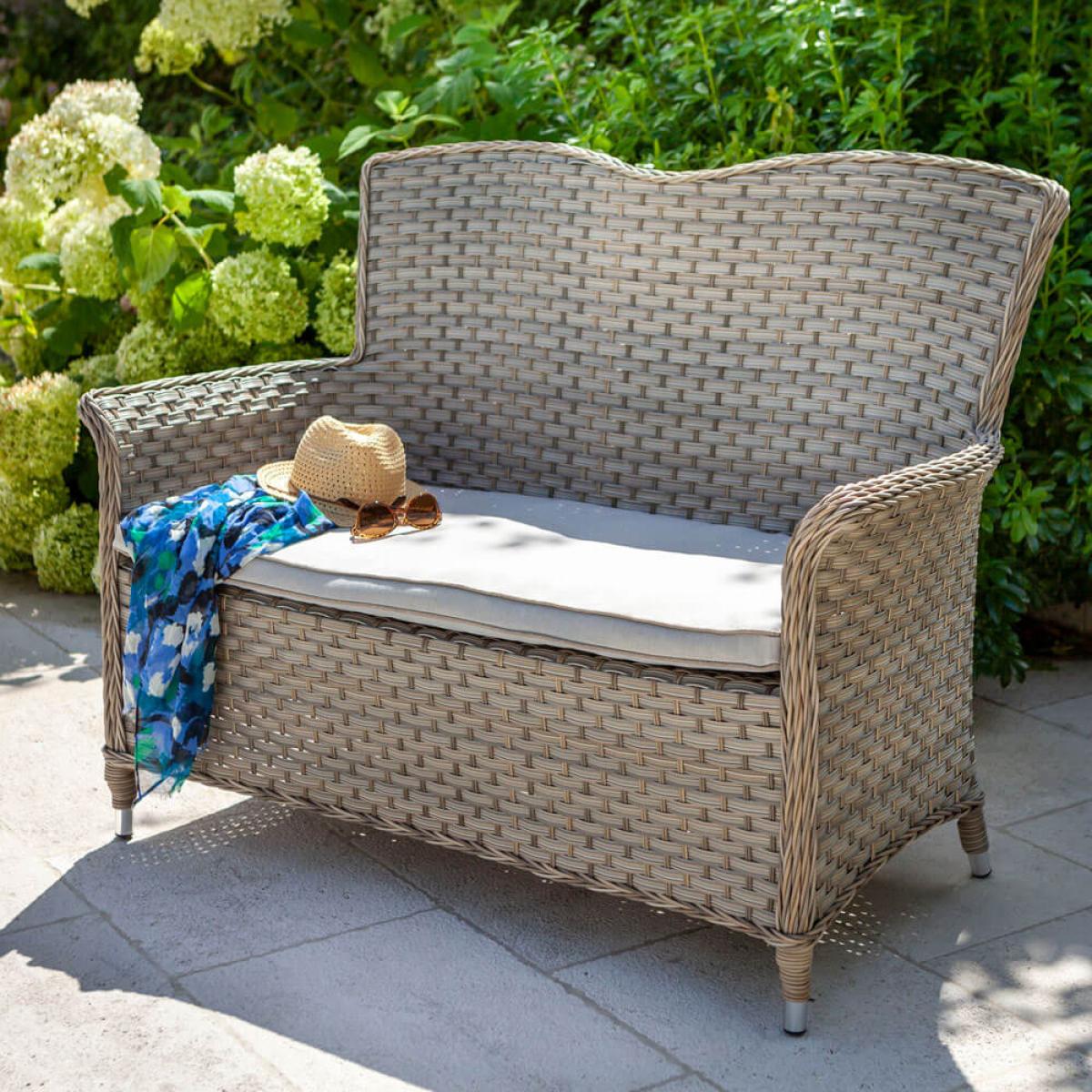 Set consists of:. About:. Add a small designated area of tranquillity to your outdoor space, place this Hartman Heritage garden bench alone in a quiet corner or separated with a trellis. Alternatively, this rattan garden bench could be added to any garden dining set from the Heritage range to help boost seating numbers. The resin wicker is bound tightly around a lightweight aluminium frame that will remain completely rust free. The rattan itself is inherently resistant to moisture damage, meaning it can deal with undesirable weather. However, to best protect this bench during the winter months a protective cover is worth considering, visit the link below for this. A comfortable Weatherready® cushion stretches the width of this 2 seater bench, this seat padding can repel light showers. Anything longer and eventually the water will simply run through the permeable layers, exiting through the underside over time, drying naturally in line with local weather conditions. Just store these in the winter months for best care. This garden bench is suitably neutral in colour shade allowing for easy insertion into many garden arrangements, the lightweight frame means it’s physically easy to move around, too. This bench can be further protected with a furniture cover, purchased separately and designed specifically to fit this product.