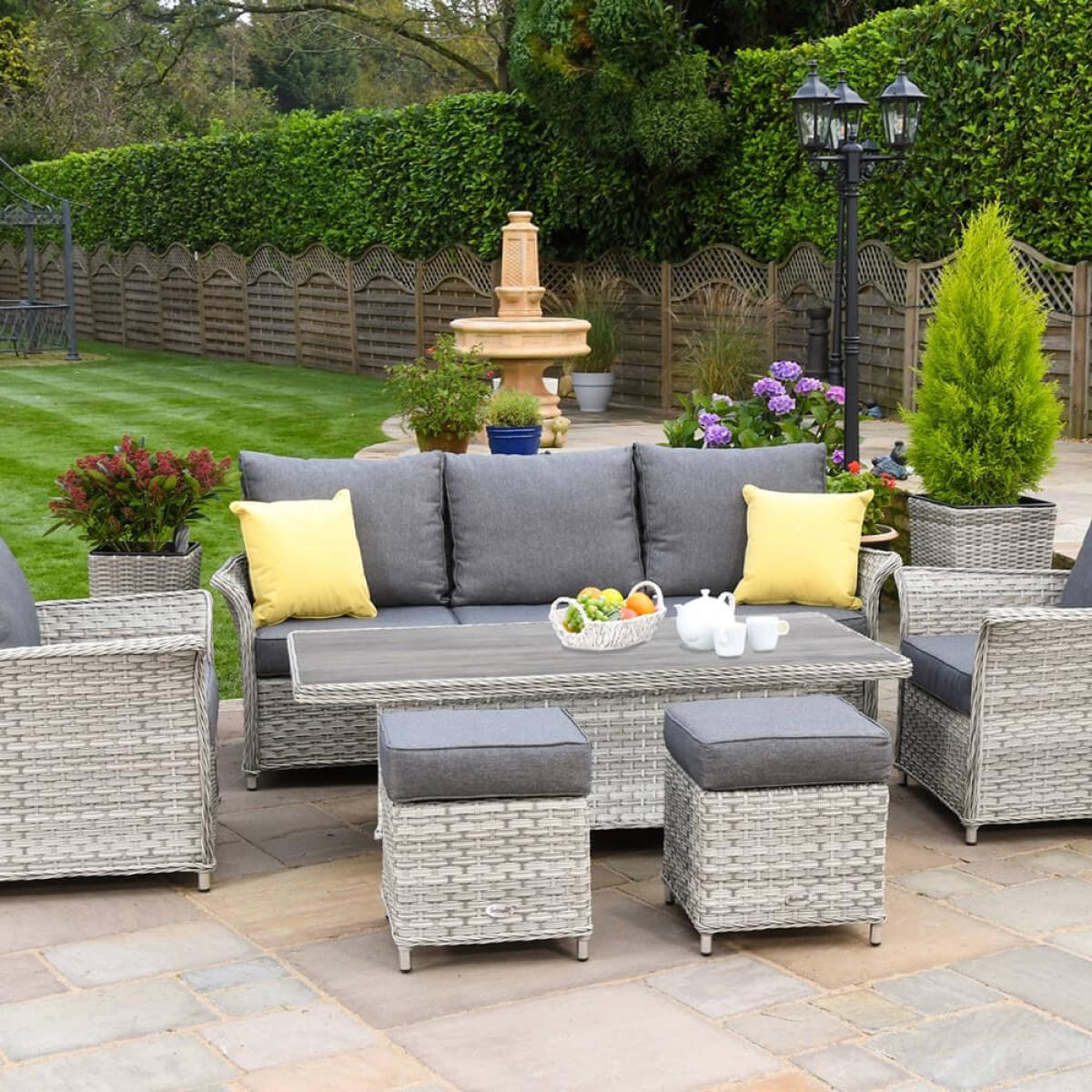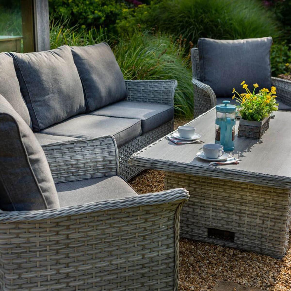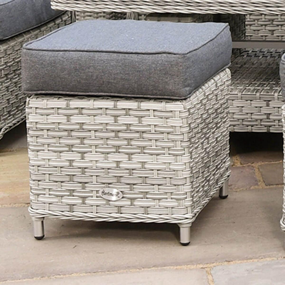 Set consists of:. Hartman’s delightful Heritage range marks a refined option for the garden this year. Spend hours in the garden comfortably lounging and maximise leisure time with friends/family on the Hartman Heritage 3 seat Casual Lounge Set, which comes with a practical adjustable table. This rattan garden furniture benefits from the resin weave which is bound over lightweight aluminium frames. The rattan construction is repellent to moisture which means that the furniture is good to be left outside to face the elements. However, to best protect this set during the winter months protective covers are worth considering, see details of these beneath the key features below. The slate cushions used on this 7 seat garden furniture set are equipped with a Hartman’s Weatherready® design meaning they can withstand light showers. However, heavier deluges may seep into the seams, but the forward-thinking design means over time rain will pass straight through the layers through the upholstery underside, then drying in line with the local conditions. Although, we do still recommend storing these indoors during the winter months for best care. Perhaps the most exciting and user-friendly feature of this garden dining set is the handy adjustable table. This rattan garden dining set offers dual functionality with more casual lounge-dining when the table is at its lowest, and then when elevated the table converts to a more upright dining affair. This rattan adjustable dining table comes into its own with the beautiful finish of the Tuscan ceramic glass tabletop, a material that’s tactile and durable, smooth to touch and completely made from recyclable materials. Two comfortable armchairs with high backs allow for optimal comfort, meanwhile, the two stools offer flexibility to boost dining numbers from 5 to 7 diners. This set can be further protected with hardwearing polyester based protective covers specifically designed to fit this furniture:.