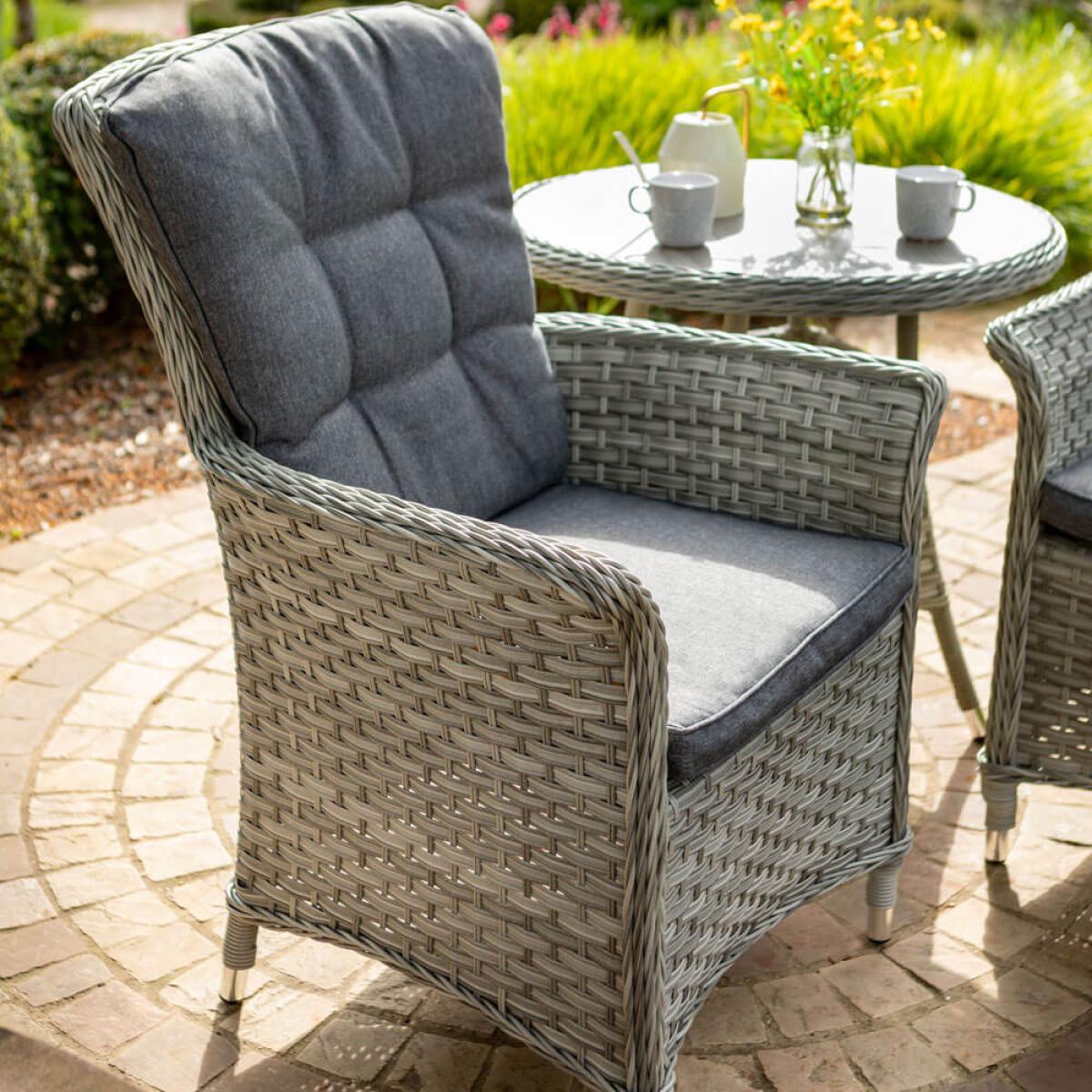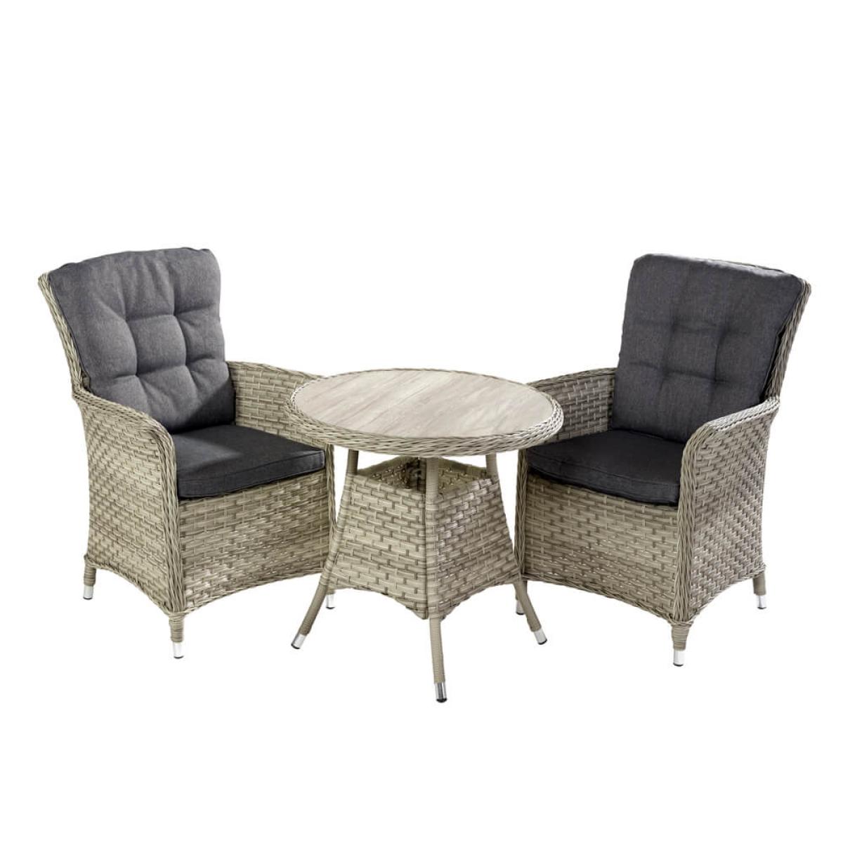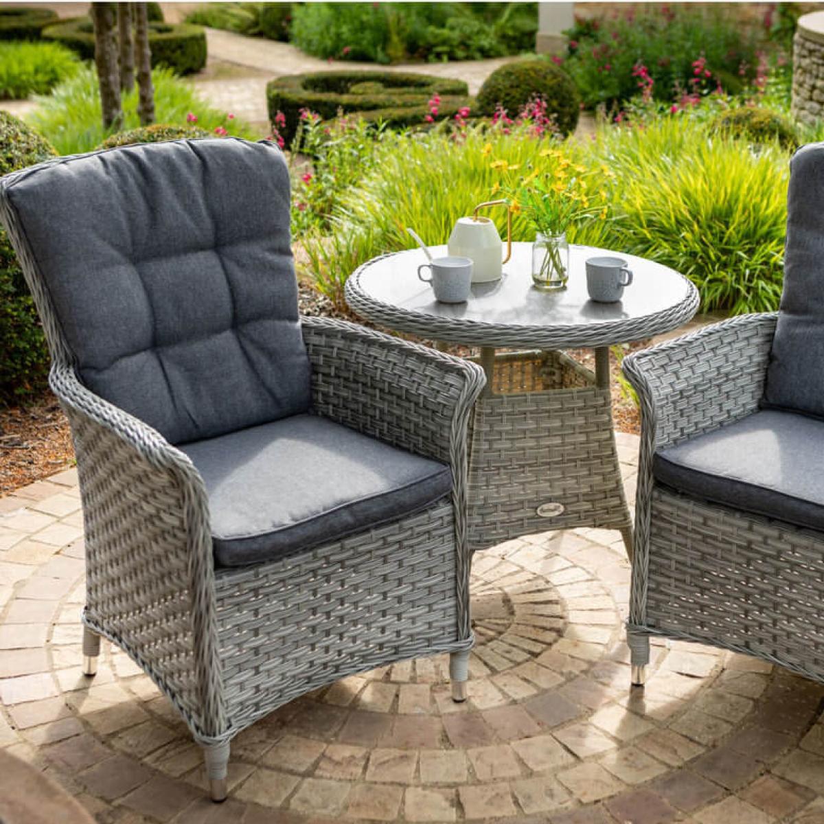 Set consists of:. About:. Soak up the sunshine for two with a pot of tea or perhaps share an afternoon aperitif. The Hartman Heritage Bistro Set in Ash rattan provides the idyllic setting to do just that. This two seat wicker patio furniture is made from a resin based rattan which provides a pleasing weave effect but is also designed to withstand years of outside use in tougher climates. Built in UV stabilising qualities ensure it won’t fade whilst it retains water resistance. To best protect this set during the winter months a protective cover is worth considering, see details beneath the key features below. The set comes with spongey padded seats that are high backed Weatherready® cushions which can resist light showers, and in heavier rain the excess water will simply permeate through the cushion layers then drain through the underside over time, drying naturally in line with local conditions. Just store these in the winter or prolonged bad weather periods for best care. The tasteful ash slate colour rattan ensures neutrality is a huge benefit of this patio bistro set, it will suit many garden layouts. A lightweight frame across all pieces allows this garden table and chairs to be lifted and repositioned with ease. A Tuscan ceramic glass table top is not only a great looking feature but offers durability and is extremely easy to clean, just wipe with a damp cloth. We’re confident this set will become a favourite for many a summer to come. Protect your Hartman furniture further with the specific fitting weather-resistant polyester protective cover, visit the link below to see this, purchased separately:.