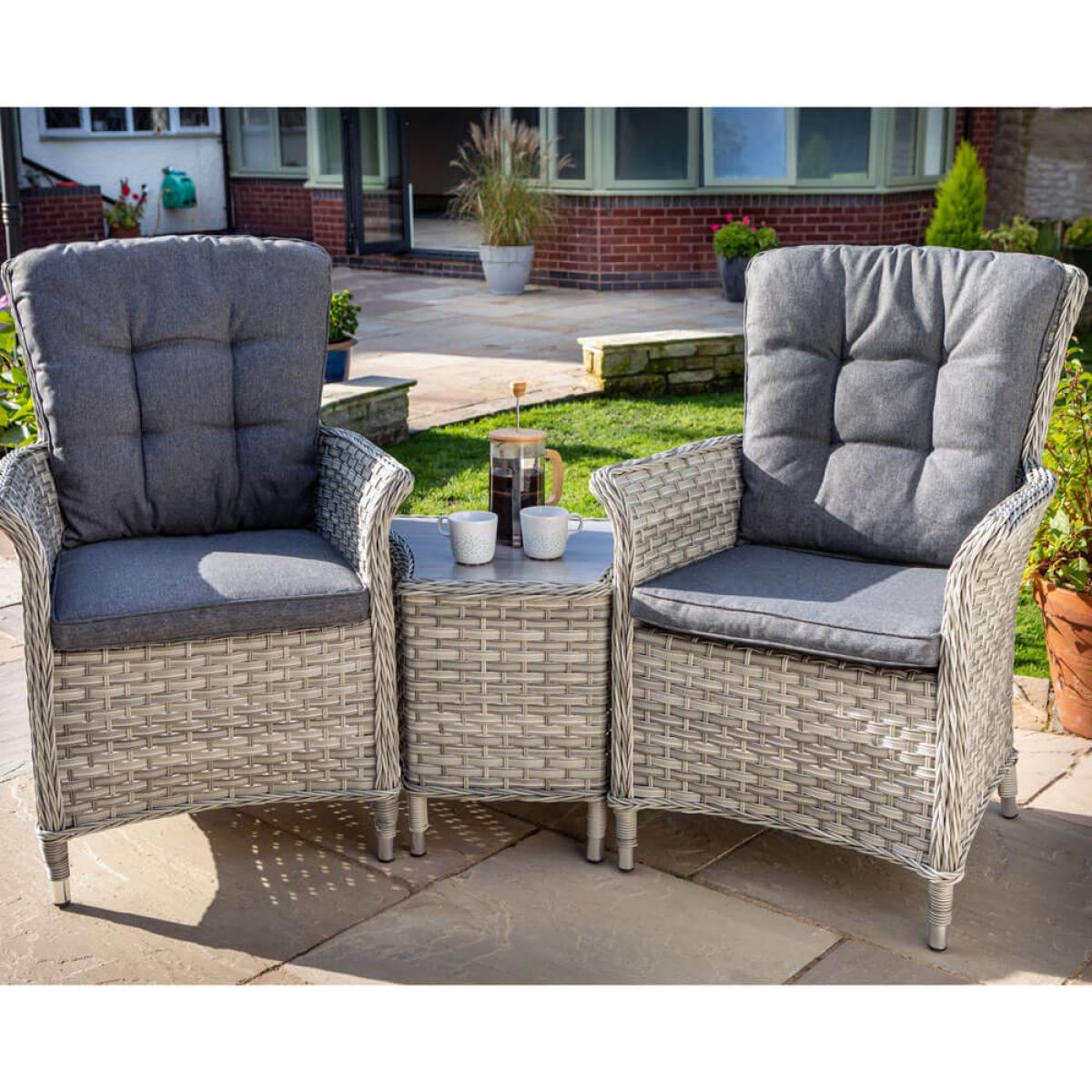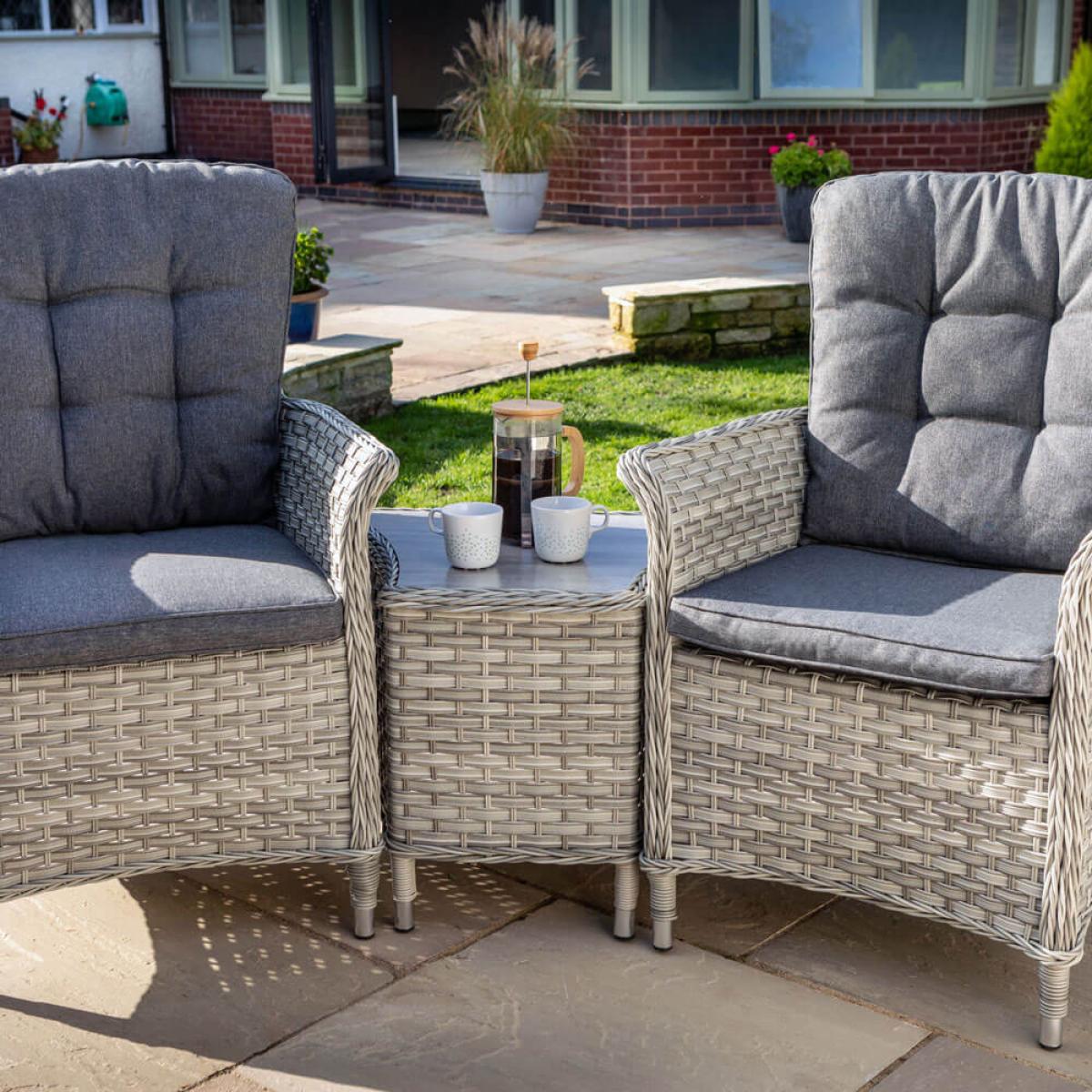 This Hartman Heritage Duet Set consists of:. Obtain a slice of blissful comfort in the garden for two with the Hartman Heritage Duet Garden Coffee Table Set. Ideally suited to casual settings, conversation and enjoying elevenses or a 4 pm treat and a hot drink. This two seat rattan patio furniture is built from impressively durable rattan weave, a substance which holds up to the elements. A mini table with a sleek Tuscan ceramic glass top provides the ideal height surface for nibbles and drinks at reaching distance. Meanwhile comfort is to be found with the high backed armchairs which are angled for optimal comfort, you’ll not want to get up from these any time soon. The spongey cushions of this rattan coffee set extend right up to the back of the chairs and seat edge. These cushions, as all in the Hartman Heritage range come usefully equipped with Weatherready® microfibre system meaning they’re resistant to light rain showers, and allow heavy deluges to pass all the way through the clever permeable layers and eventually drying over a time period in line with local conditions. We still recommend storing these during the winter months or prolonged torrential weather. Thicker bands of rattan run the arms of the chair creating a playful look but also providing a wider surface to rest arms. The light-to-lift frame means moving this outdoor coffee table set around the garden or patio is simple, but it’s also incredibly sturdy being made from aluminium to ensure rust proofing. The tasteful neutral colour tones of the ash and slate means this patio garden furniture set is easy to incorporate into many settings.