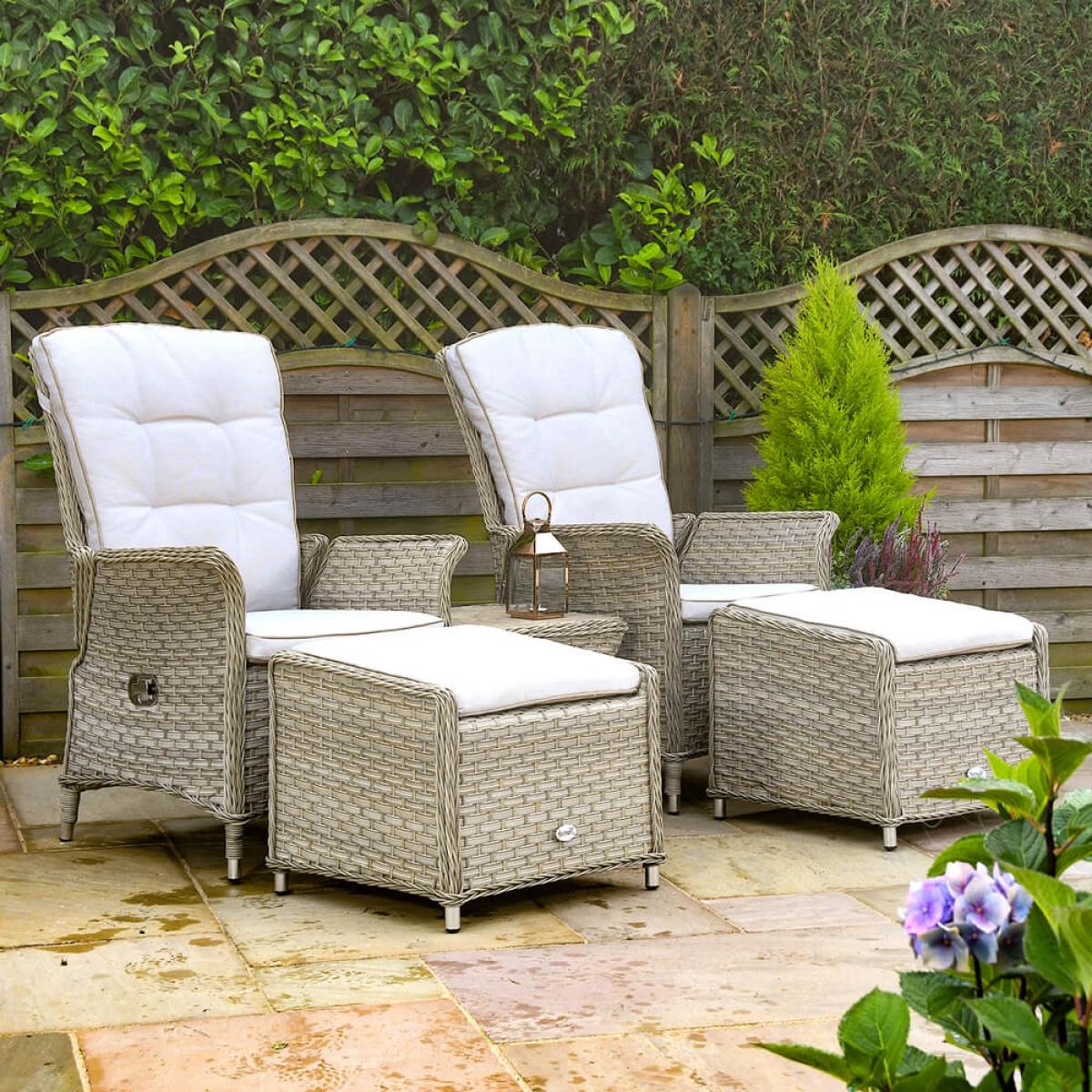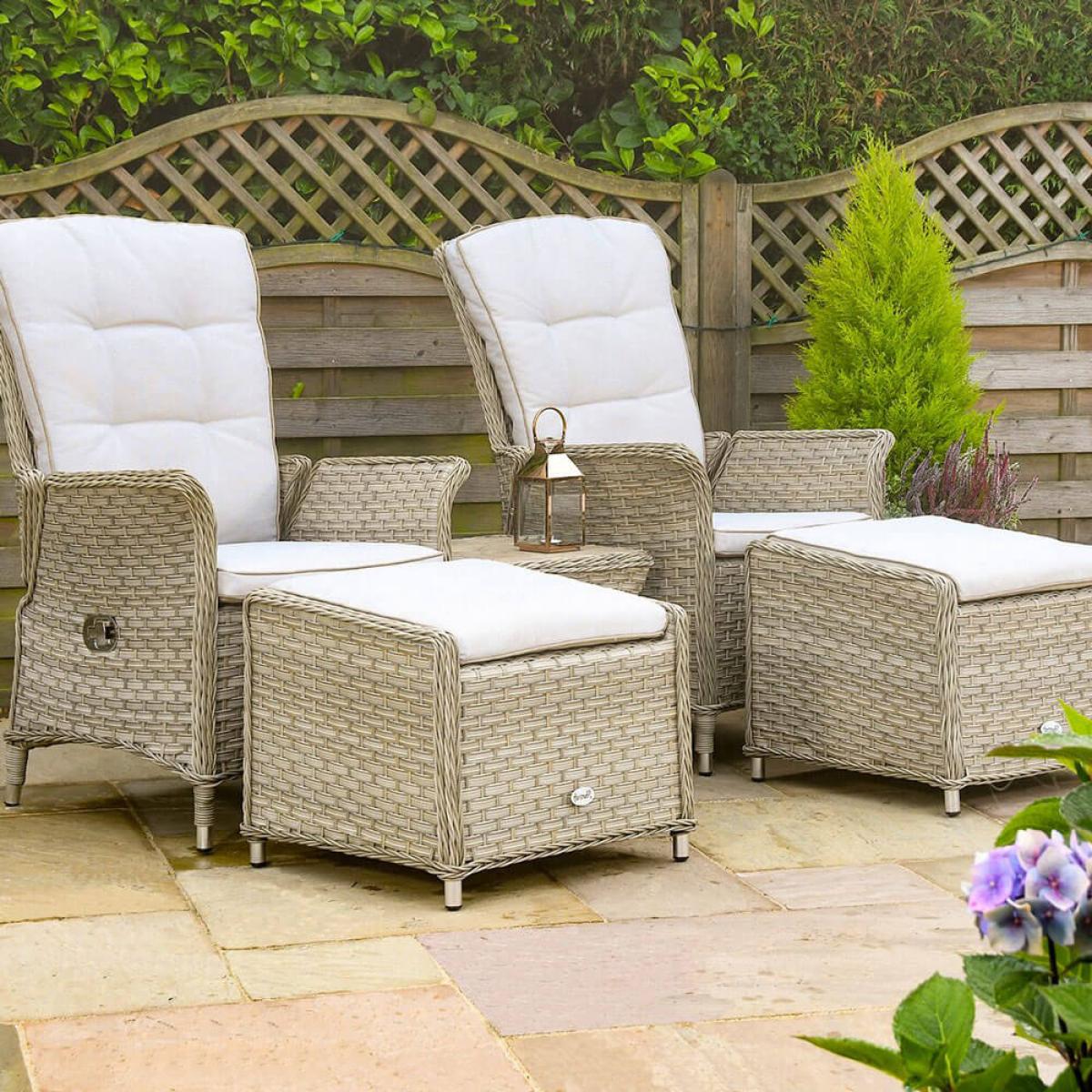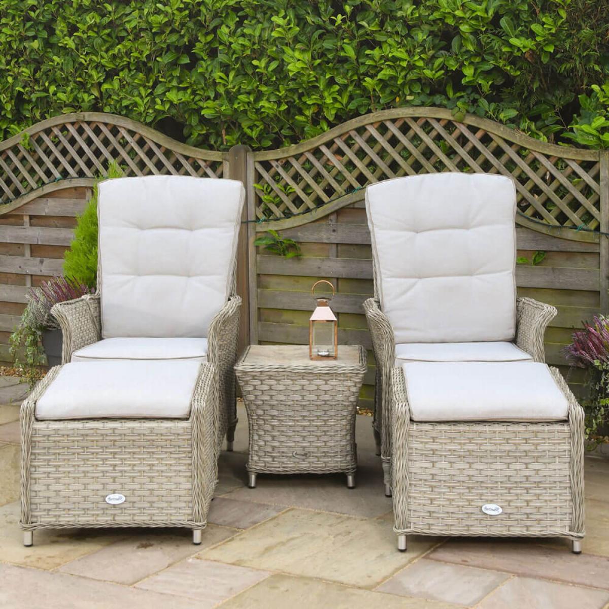 Set consists of:. About:. There’s sitting, and then there’s reclining, we know which one we prefer! The charming Hartman Heritage Reclining Companion Set is the perfect dual relaxation 2 seat garden set. Pitch up, position as needed for maximum sun absorption then pull up the lever, found on the side of the chairs, recline and voila! Technically talking this reclining chair set is ready to deal with less desirable weather days with inherently resistant rattan wicker design. However, to best protect this set during the winter months a protective cover is worth considering, see details beneath the key features below. The cushions are designed to repel lighter showers having been given a Weatherready® proofing, any heavier deluges will simply drain through the specially designed permeable layers over time, exiting through the underside,. Drying naturally over time – local conditions dependent. Just store in the winter months for best care. The same durable cushions can be found on the footstools. The footstools have been created as oversized rests, reaching taller than contemporaries for optimal reclining comfort. The entire rattan garden set is set on lightweight aluminium frames meaning it’s very easy to position around the garden as needed, these frames will remain completely rust free. The lavish premium quality Tuscan ceramic glass table top sits firmly in place upon the small rattan table, a useful component to this patio reclining set, place drinks and nibbles atop as you sun worship. Warning – you may find it incredibly hard to get up from these reclining rattan chairs!. This set can be further protected with hardwearing furniture covers that are specifically designed to fit this furniture, visit the links below to be taken to these:.