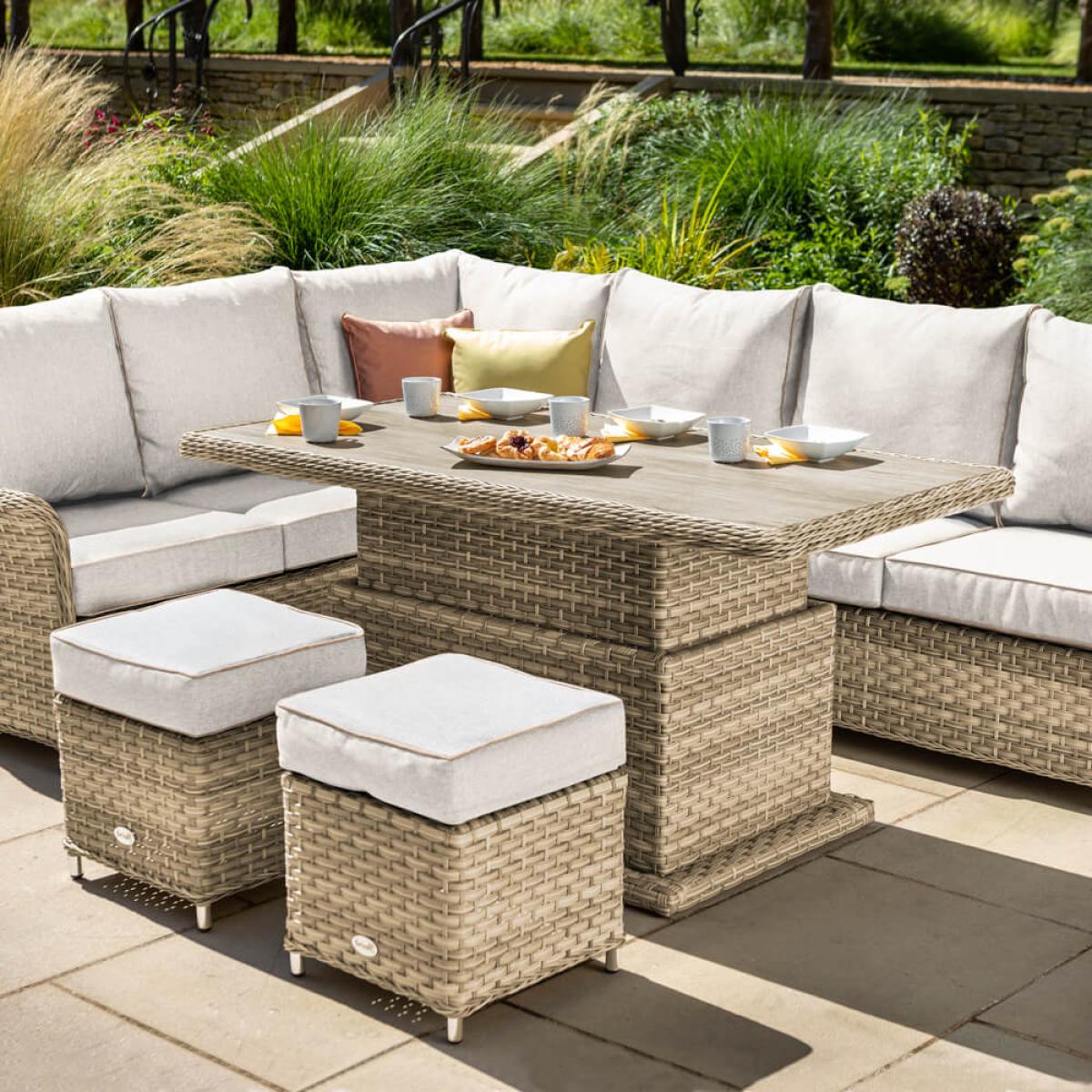 Set Consists Of: 1 x 2021 Hartman Heritage Casual Rectangular Corner Sofa Unit – Beech 1 x 2021 Hartman Heritage Casual Rectangular Gas Pump Operated Adjustable Dining Table with Tuscan Ceramic Glass Top – Beech 2 x 2021 Hartman Heritage Stools – Beech 1 x 2021 Hartman Heritage Weatherready® Cushions for Sofa and Stools – DoveAbout:. Perfect for gatherings of family and friends this 2021 Hartman Heritage Garden Furniture includes a height-adjustable outdoor dining table 2 stools and a corner sofa that alone can sit up to 5 people. Altogether this set will seat an impressive 7 people making it as a great option for entertaining. Lightweight hardwearing and incredibly robust the outdoor furniture that makes up this set is made from a hand-woven resin weave over an aluminium frame. An elegant yet tough Tuscan ceramic glass surface is given to the handy adjustable table raise to dine more formally and lower for a more casual affair all with the easy newly added gas foot pump found at the foot of the table side. Use the forefoot of your foot to simply elevate and lower as needed. Stylistically this rattan garden furniture adjustable table also flatters with a lovely all wrapped weave design so there's no table structure showing whatsoever. It's truly those little touches that puts Hartman Heritage at the forefront of their ranges. In addition to this outdoor patio furniture this garden dining set also comes with Weatherready® light shower resistant cushions that are easy to clean and can cope with extended hours outside in the summertime. These specially designed Hartman cushions benefit from a microfibre technology deflecting light exposure to rain and then during heavy spells simply allow the rain to pass all the way through the permeable layers and over time draining through the cushions’ underside drying in line with local conditions. We do recommend however that they are kept indoors over winter months and during prolonged periods of poor weather. For the harsher winter months and a critical barrier against frost this set can be further protected with hardwearing furniture covers specifically designed to fit this furniture: Heritage 150cm x 80cm Adjustable Table Protective Cover Heritage Casual Corner Sofa Long Right Protective Cover Hartman Heritage 150 x 80cm Adjustable Table Protective Cover