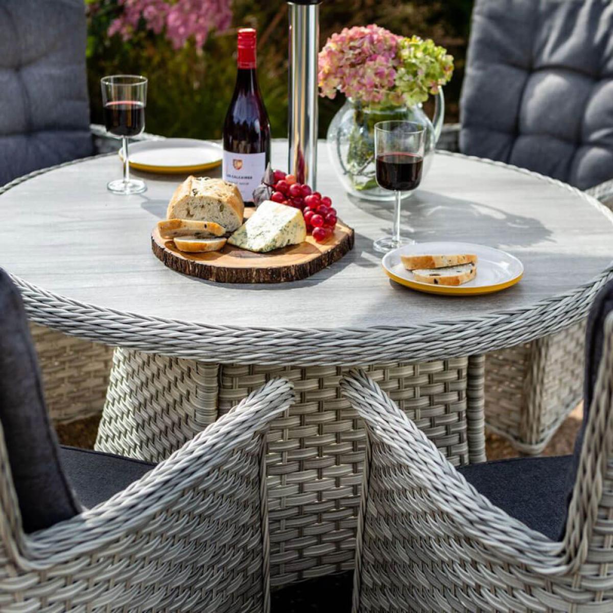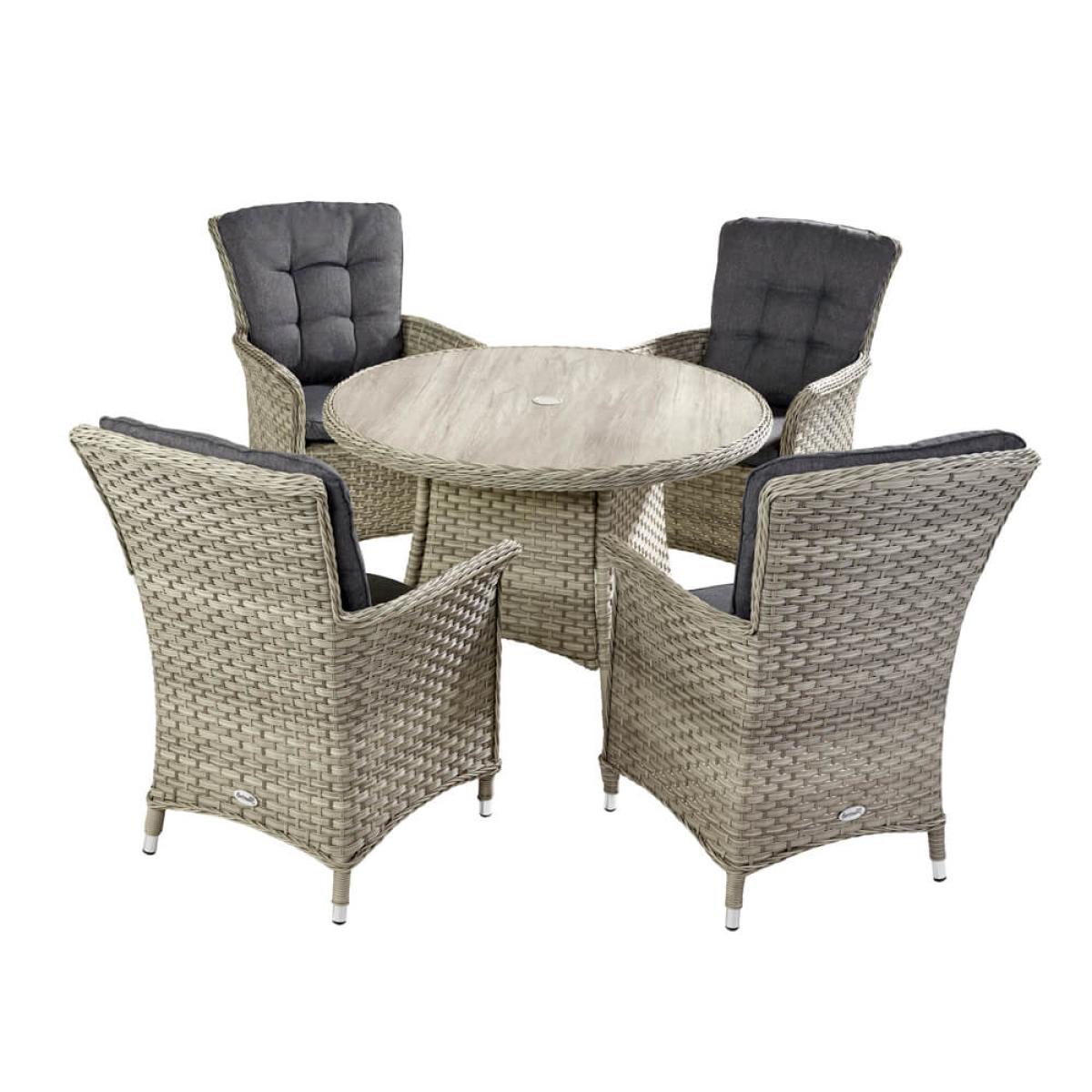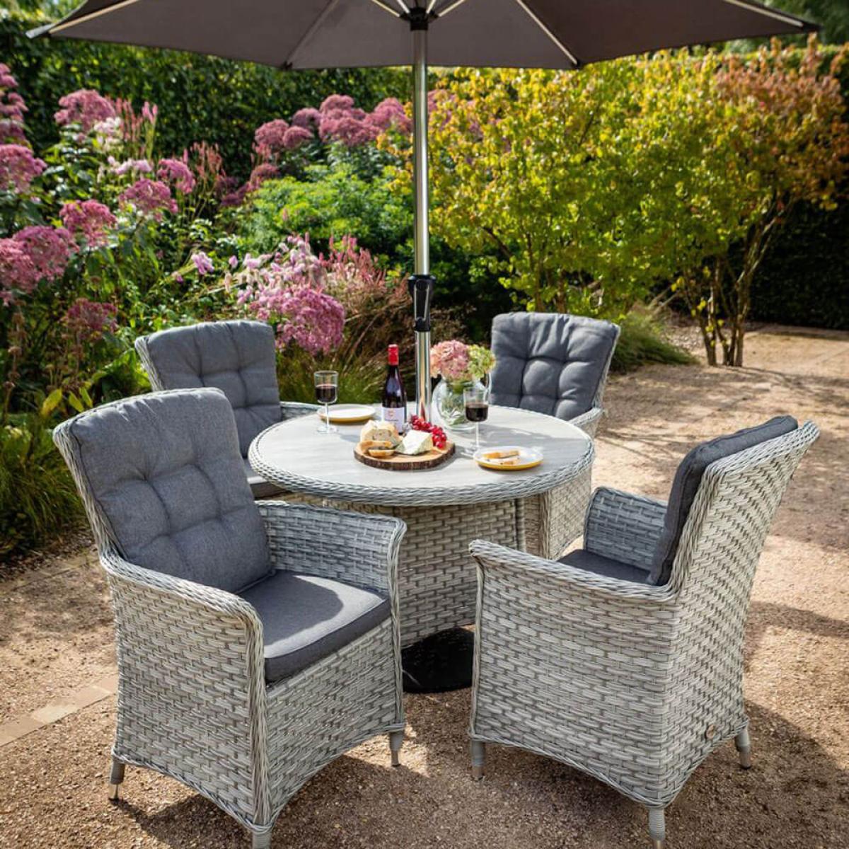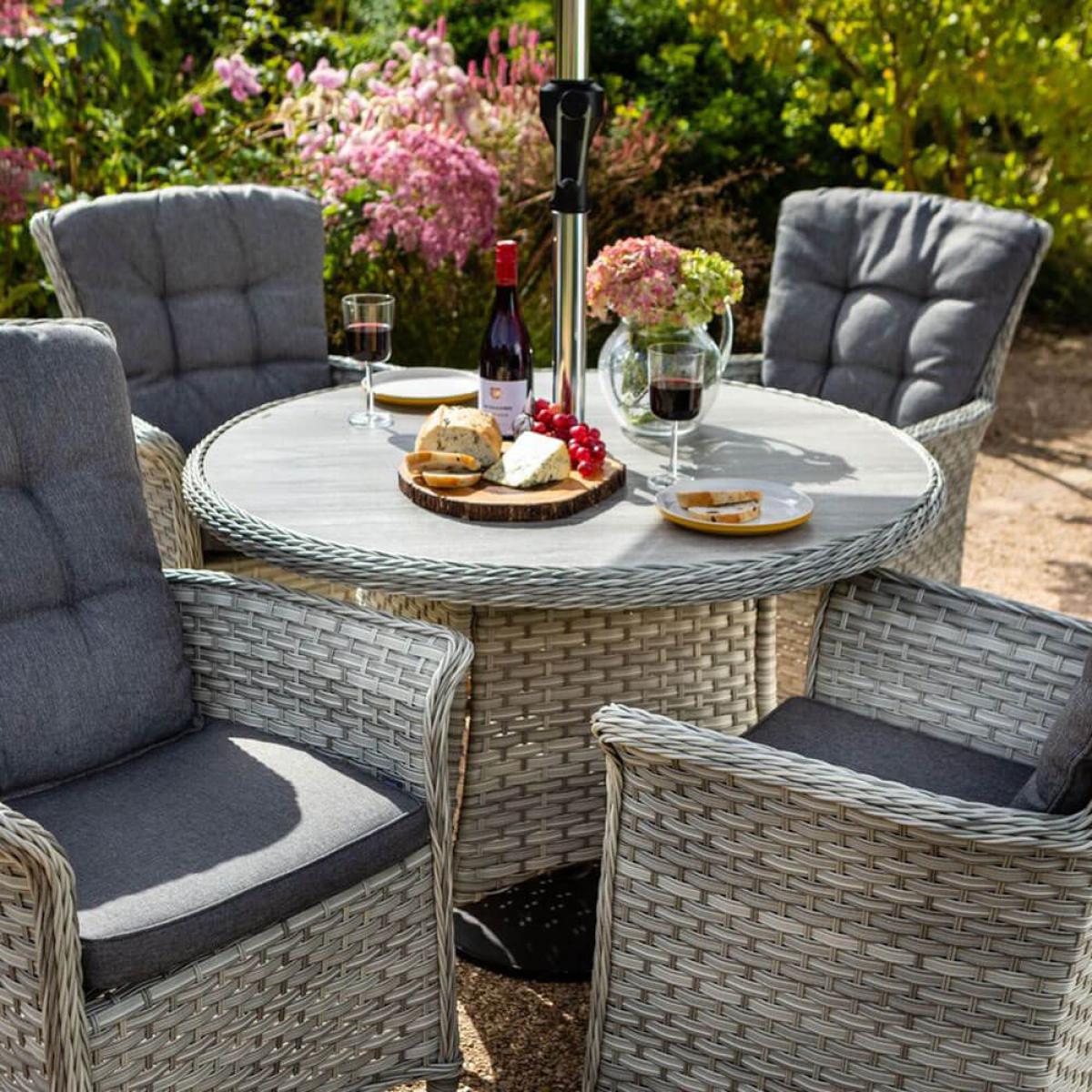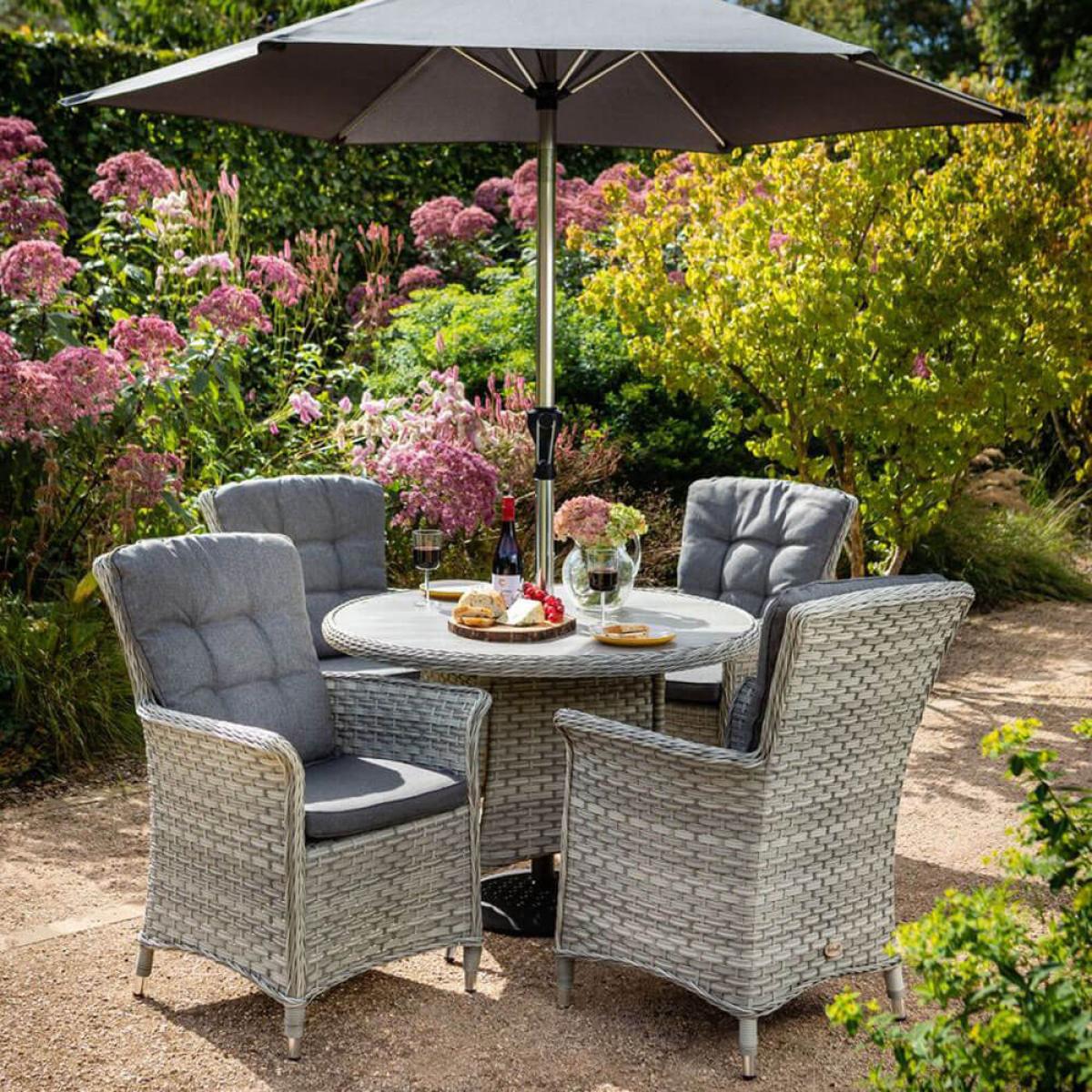 The Hartman Heritage 4-Seat Ceramic Round Dining Table Set consists of:. 1 x Hartman Heritage Round Dining Table with Tuscan Ceramic Glass Top – Ash. 4 x Hartman Heritage Dining Chairs – Ash. 4 x Hartman Heritage Weatherready® Cushions – Slate. 1 x Hartman Heritage 2. 5m diameter Parasol – Grey. 1 x 15kg Parasol Base. Convert that unused corner of patio into a hub of social humdrum with the elegant Hartman Heritage 4 Seat Round Garden Dining Table Set. This round table rattan 4 seat dining set will soon become the setting for casual afternoon get-togethers or evening dining. A tasteful ash and slate shade of resin weave rattan is applied to a lightweight aluminium frame. The synthetic rattan weave ensures complete resistance to all the elements with an integral water repellency. However, to best protect this set during the winter months protective covers are worth considering, see details of these beneath the key features below. This outdoor dining furniture comes with a handy 2. 5 metre wide sun shield which doubles to deflect rain with light shower water resistance inbuilt to the fabric. High backed armchairs with a design that offers a slightly reclined angle combined with the plush cushions make for an extremely comfortable sitting experience. These cushions come with a Weatherready® system inbuilt, too. Which means they can deflect light rain showers, and simply let heavier rain pass through their specifically designed permeable layer system,. Drying naturally over time – local conditions dependent. However, we recommend storing in the winter months for best care. This causal rattan dining table will be sure to see through the season with ease. This set can be further protected with a hardwearing furniture cover specifically designed to fit this furniture set.