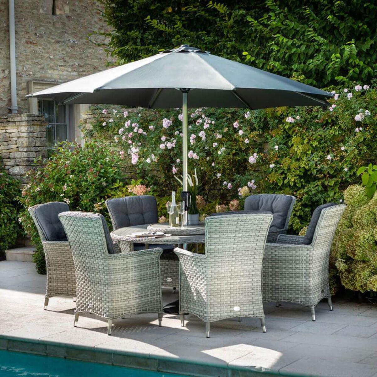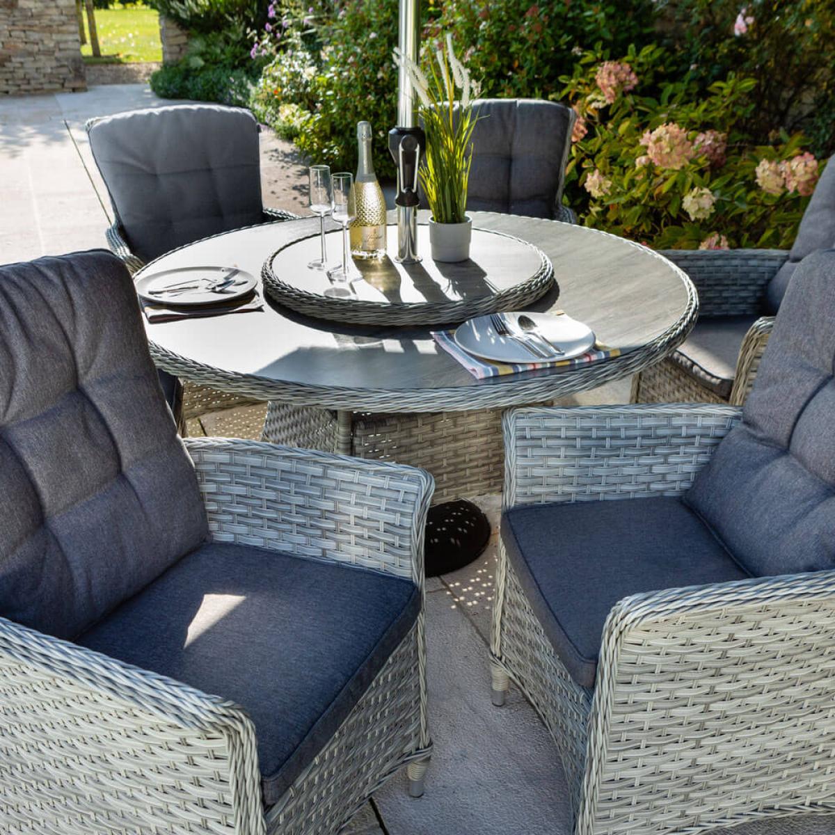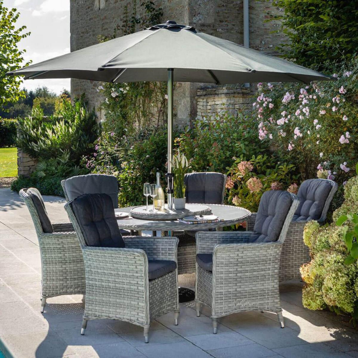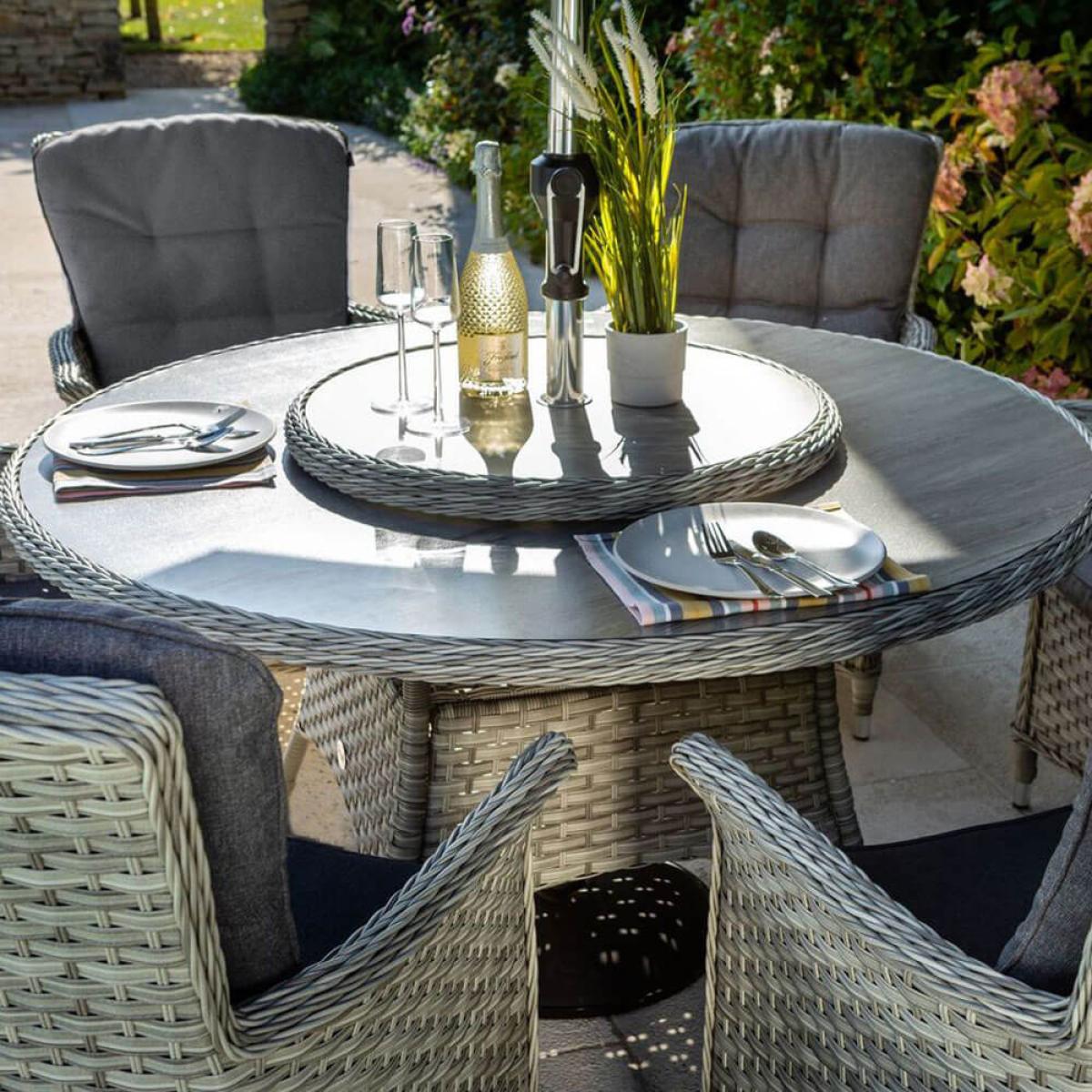 The Hartman Heritage 6-Seat Round Outdoor Dining Table Set consists of:. 1 x Hartman Heritage Round Dining Table with Tuscan Ceramic Glass Top – Ash. 6 x Hartman Heritage Dining Chairs – Ash. 6 x Hartman Heritage Weatherready® Cushion sets – Slate. 1 x Lazy Susan Tuscan Ceramic Glass Rotating Serving Surface. 1 x 3m Diamater Parasol – Ash. 1 x 15kg Parasol Base. About:. Alfresco dining is perfected with the Hartman Heritage 6 Seat Round Garden Dining Set with Lazy Susan. This patio dining set will more than likely quickly become a place where sunny memories and laughter are shared. Not to mention the functional qualities it offers. A Lazy Susan rotating Tuscan ceramic glass tray sits front and centre allowing for ease of service with a quick and simple twist. Through the centre of this 6 seat rattan patio set can fit the handy Parasol that extends to a 3 metre width and offers ample shade for diners, or light rain cover should the temperamental British/Irish weather spring a surprise. The dining surface is made from the same lavish Tuscan ceramic glass that’s anti marking and easily cleaned by wiping with a wet cloth. This rattan 6 seater dining set prospers from the resin weave, meaning it is more than capable of seeing out the months outside in the garden unscathed. To best protect this set during the winter months a protective cover is worth considering, see the link contained beneath this description for details on this. The high backed cushions are not only very spongey and comfortable but equipped with a light shower resistance specially designed Weatherready® system, a microfibre technology that deflects lighter showers but lets heavier rain pass through the permeable layers eventually exiting through the cushion underside,. Drying naturally over time – local conditions dependent. We just recommend storing during the winter months for best care. Make your garden or patio the social hub it was destined to be with this attractive ash and slate grey Lazy Susan furniture. Although Rattan furniture is integrally resistant to the damaging effects of the elements, to best increase the life of your furniture and protect against the harsher winter conditions, you may consider using the following specific fitting outdoor furniture cover:.